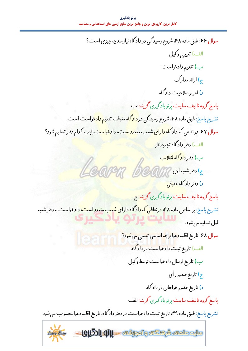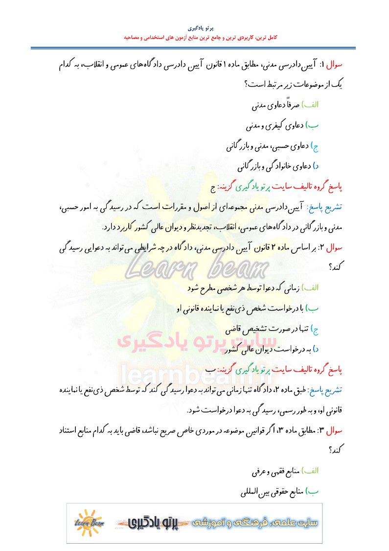 سوالات تستی قانون آیین دادرسی مدنی شامل 150 سوال تستی در 59 صفحه با پاسخ تشریحی در قالب فایل pdf قابل چاپ با کیفیت عالی جهت انسجام ذهنی، خودآزمایی و مطالعه سریع داوطلبین شرکت کننده در آزمون های استخدامی و دوازدهمین امتحان مشترک فراگیر دستگاه های اجرایی کشور مطابق با دفترچه ثبت نام و مطابق با سرفصل های اعلام شده در دفترچه راهنمای ثبت نام می باشد.