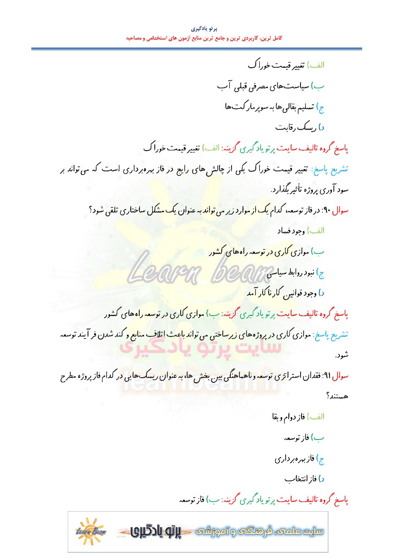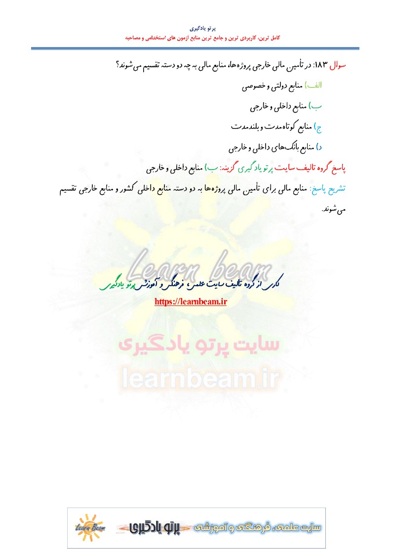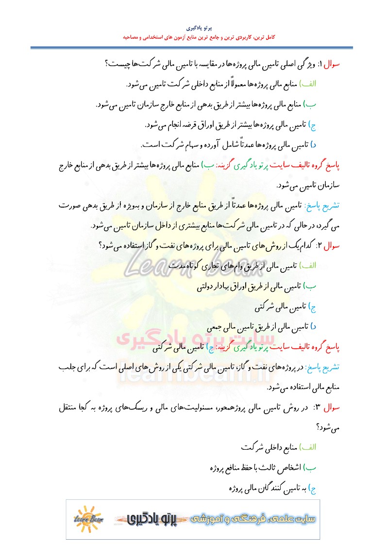 تست روش های تامین مالی و اجرای پروژه با تاکید بر سرمایه گذاری سوالات تستی روش های تامین مالی و اجرای پروژه با تاکید بر سرمایه گذاری شامل 183 تست در 75 صفحه با پاسخ تشریحی در قالب فایل pdf می باشد. مجموعه سوالات تستی روش های تامین مالی و اجرای پروژه با تاکید بر سرمایه گذاری قابل چاپ با کیفیت عالی جهت انسجام ذهنی، خودآزمایی و مطالعه سریع داوطلبین شرکت کننده در آزمون های استخدامی و در دوازدهمین امتحان مشترک فراگیر دستگاه های اجرایی کشور در سال 1403 مطابق با دفترچه راهنمای ثبت نام آزمون و اصلاحیه نهایی می باشد.