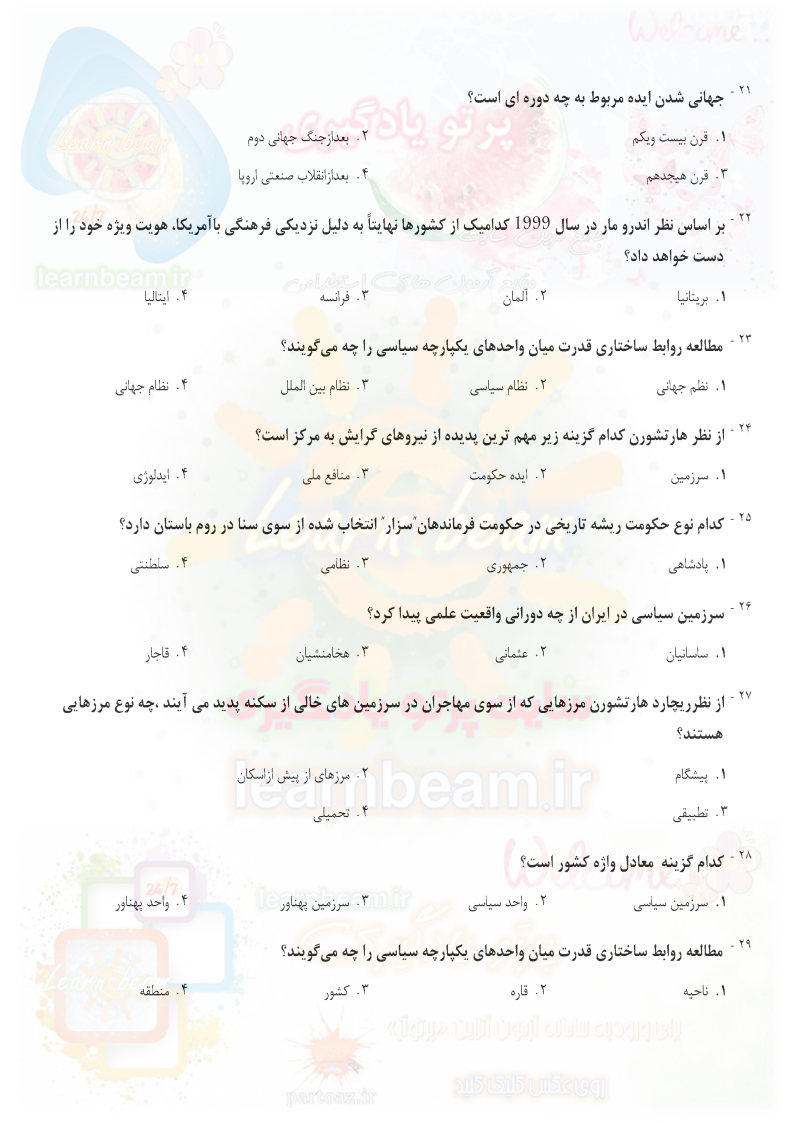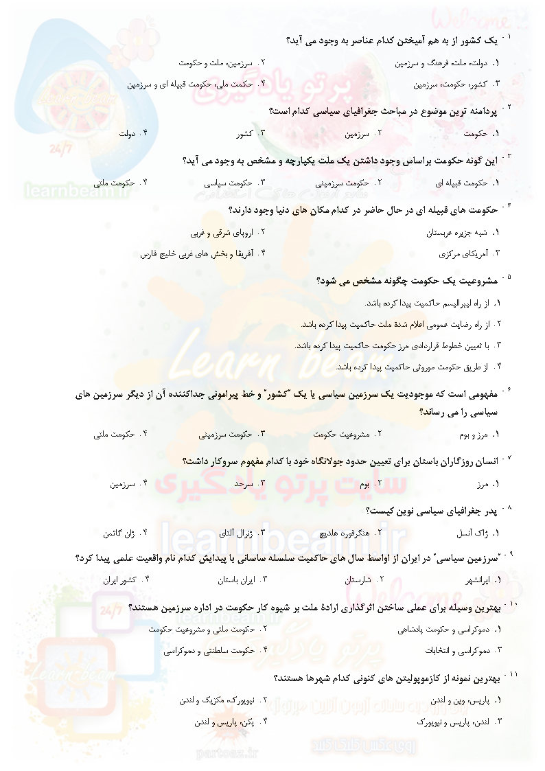 تست جغرافیای سیاسی سوالات تستی جغرافیای سیاسی شامل 150 سوال تستی در 22 صفحه در قالب فایل pdf می باشد. مجموعه سوالات تستی و چهارجوابی جغرافیای سیاسی قابل چاپ با کیفیت عالی جهت انسجام ذهنی، خودآزمایی و مطالعه سریع داوطلبین شرکت کننده در آزمون های استخدامی و در دوازدهمین امتحان مشترک فراگیر دستگاه های اجرایی کشور در سال 1403 مطابق با دفترچه راهنمای ثبت نام آزمون و اصلاحیه نهایی می باشد.