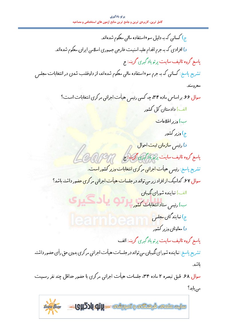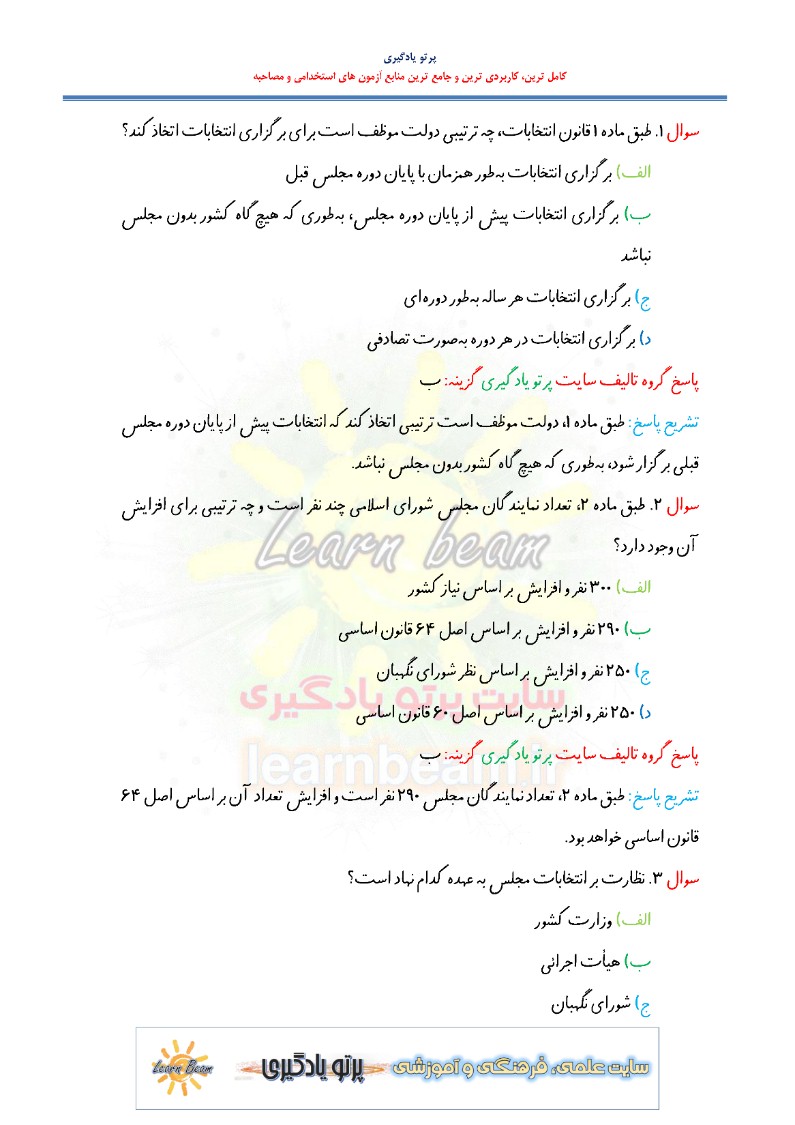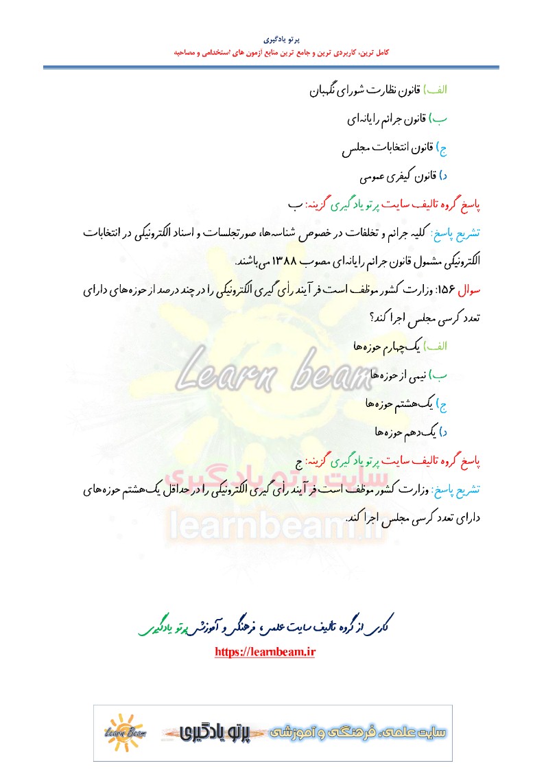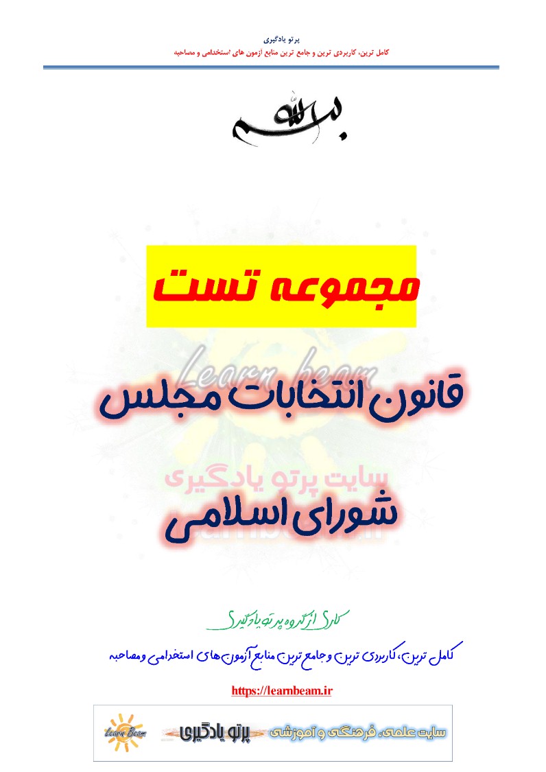 سوالات تستی قانون انتخابات مجلس شورای اسلامی شامل 156 تست در 62 صفحه با پاسخ تشریحی در قالب فایل pdf قابل چاپ با کیفیت عالی جهت انسجام ذهنی، خودآزمایی و مطالعه سریع داوطلبین شرکت کننده در آزمون های استخدامی و دوازدهمین امتحان مشترک فراگیر دستگاه های اجرایی کشور مطابق با دفترچه ثبت نام و مطابق با سرفصل های اعلام شده در دفترچه راهنمای ثبت نام می باشد.