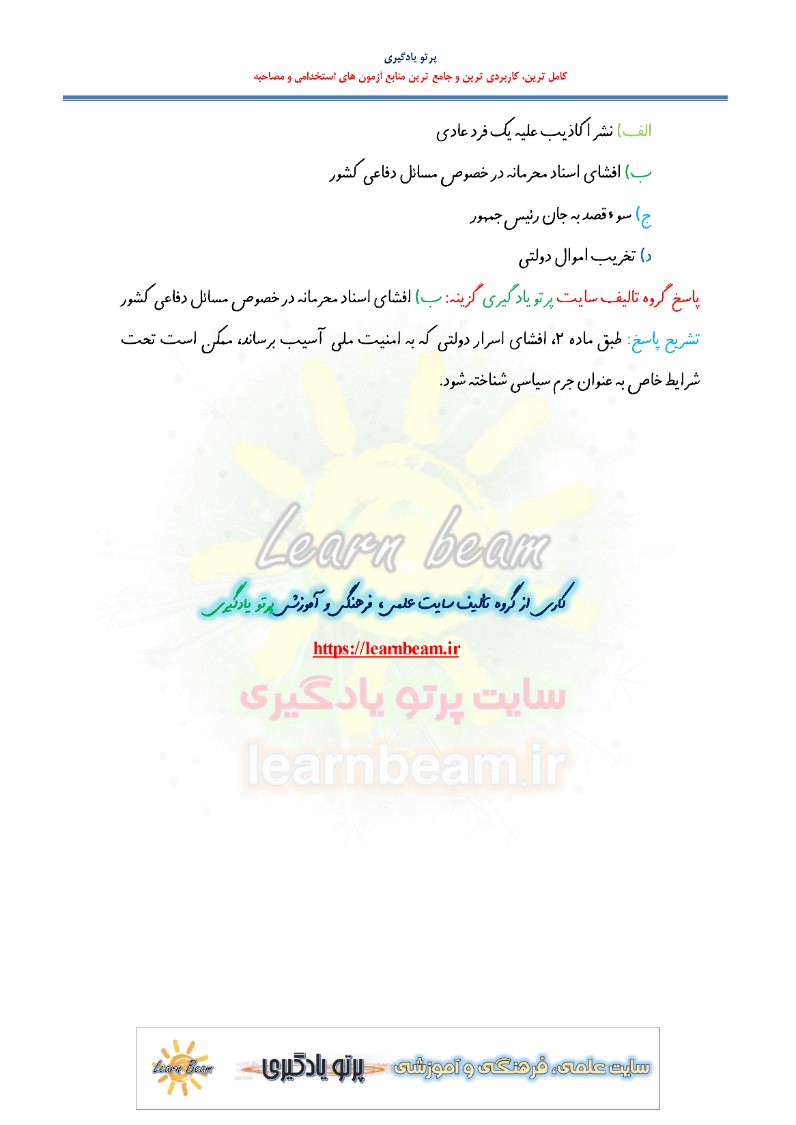 تست قانون نحوه فعالیت احزاب و گروه های سیاسی سوالات تستی قانون نحوه فعالیت احزاب و گروه های سیاسی شامل 106 سوال تستی با پاسخ تشریحی در 44 صفحه در قالب فایل pdf می باشد. مجموعه سوالات تستی و چهارجوابی قانون نحوه فعالیت احزاب و گروه های سیاسی قابل چاپ با کیفیت عالی جهت انسجام ذهنی، خودآزمایی و مطالعه سریع داوطلبین شرکت کننده در آزمون های استخدامی و در دوازدهمین امتحان مشترک فراگیر دستگاه های اجرایی کشور در سال 1403 مطابق با دفترچه راهنمای ثبت نام آزمون و اصلاحیه نهایی می باشد.