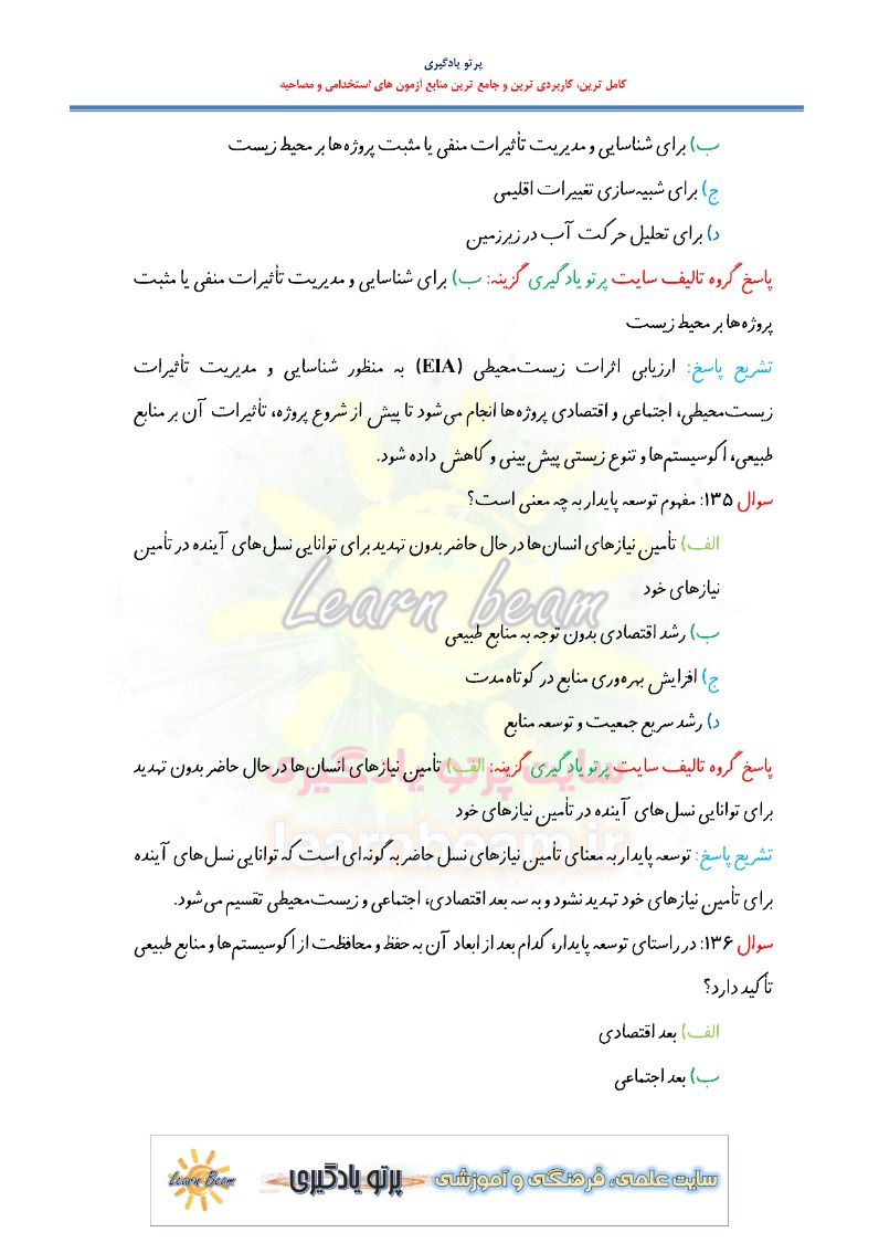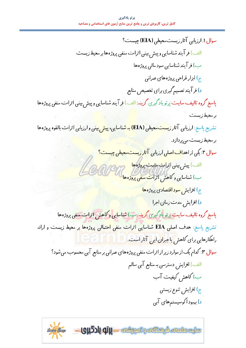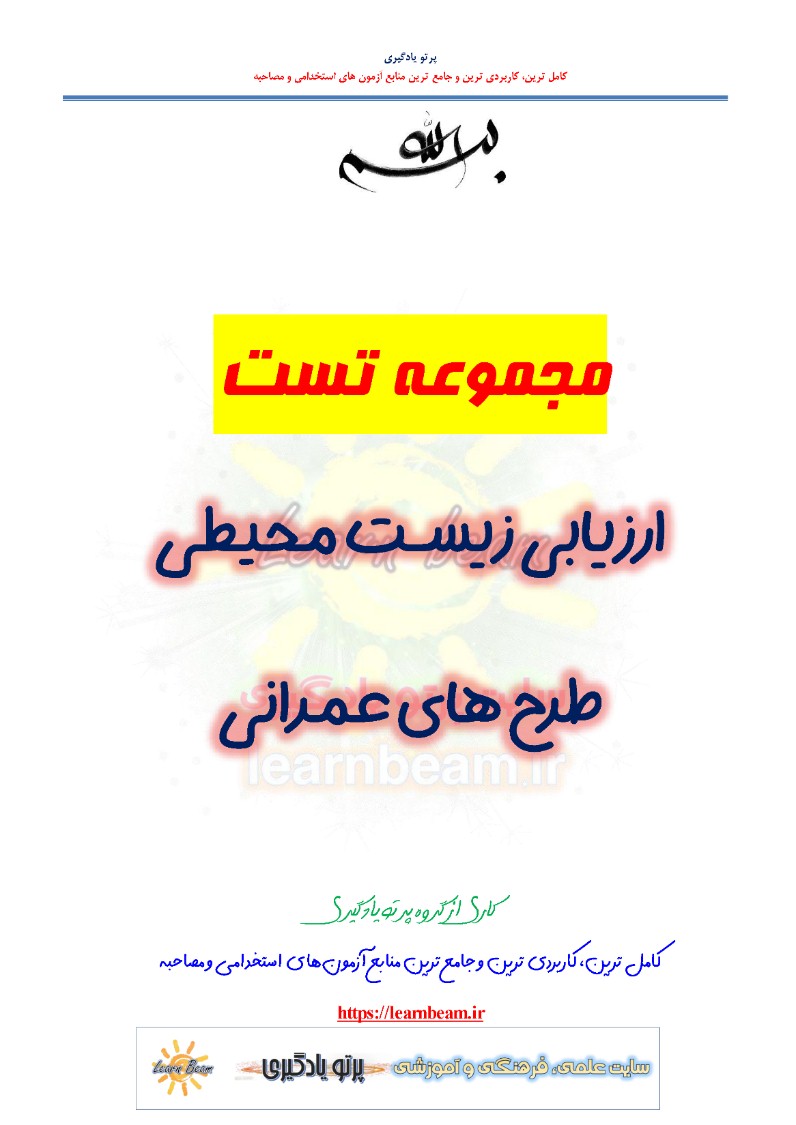 سوالات تستی ارزیابی زیست محیطی طرح های عمرانی شامل 221 تست با پاسخ تشریحی در 92 صفحه در قالب فایل pdf قابل چاپ با کیفیت عالی جهت انسجام ذهنی، خودآزمایی و مطالعه سریع داوطلبین شرکت کننده در آزمون های استخدامی و دوازدهمین امتحان مشترک فراگیر دستگاه های اجرایی کشور مطابق با دفترچه ثبت نام و مطابق با سرفصل های اعلام شده در دفترچه راهنمای ثبت نام می باشد.