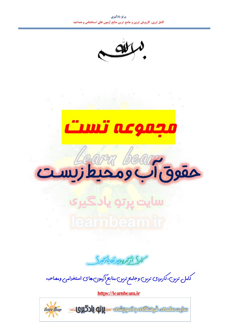 سوالات تستی محقوق آب و محیط زیست شامل 250 تست در 99 صفحه با پاسخ تشریحی در قالب فایل pdf قابل چاپ با کیفیت عالی جهت انسجام ذهنی، خودآزمایی و مطالعه سریع داوطلبین شرکت کننده در آزمون های استخدامی و دوازدهمین امتحان مشترک فراگیر دستگاه های اجرایی کشور مطابق با دفترچه ثبت نام و مطابق با سرفصل های اعلام شده در دفترچه راهنمای ثبت نام می باشد.