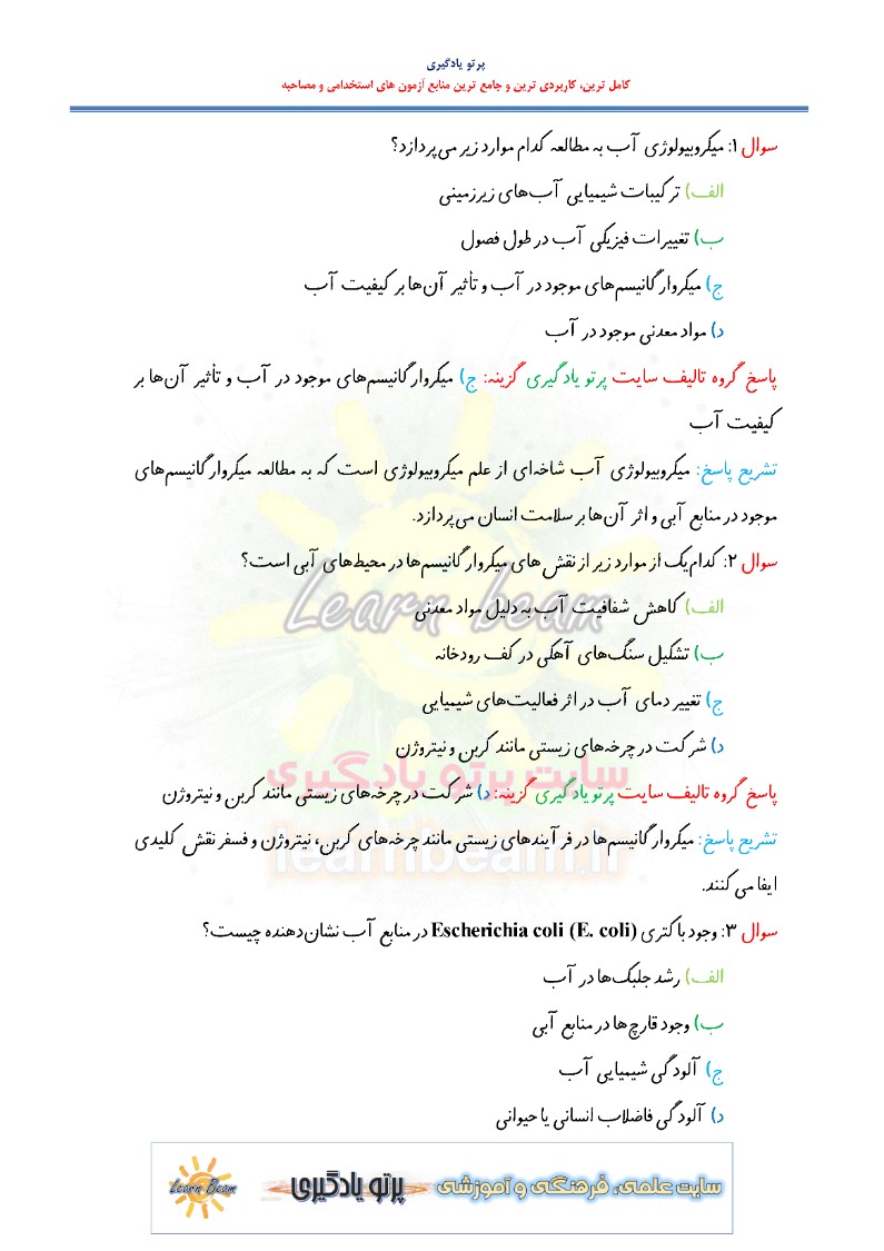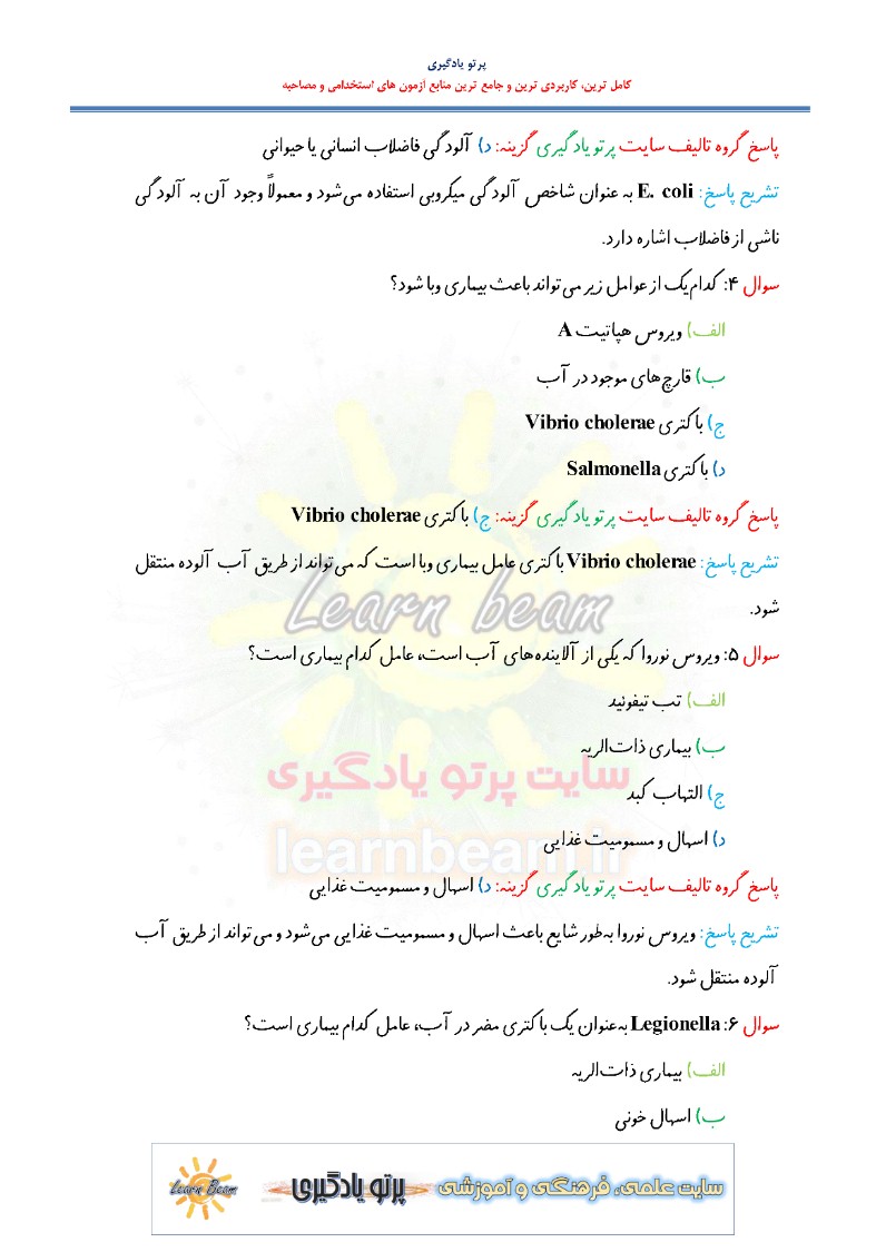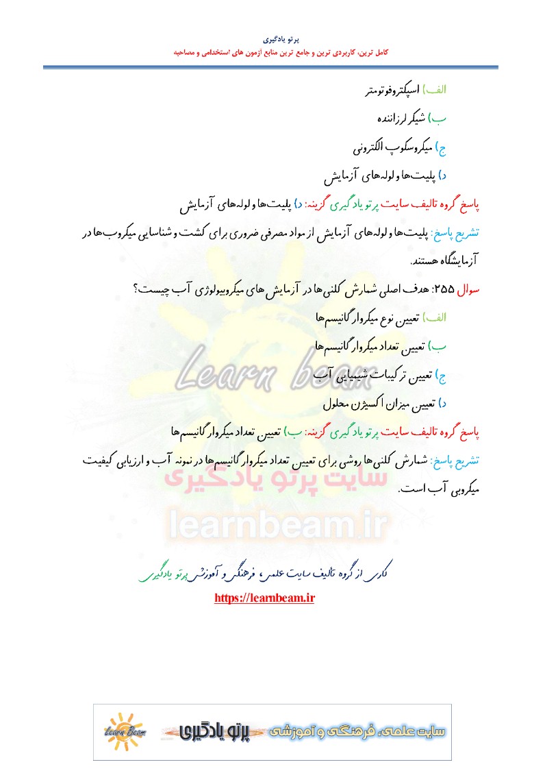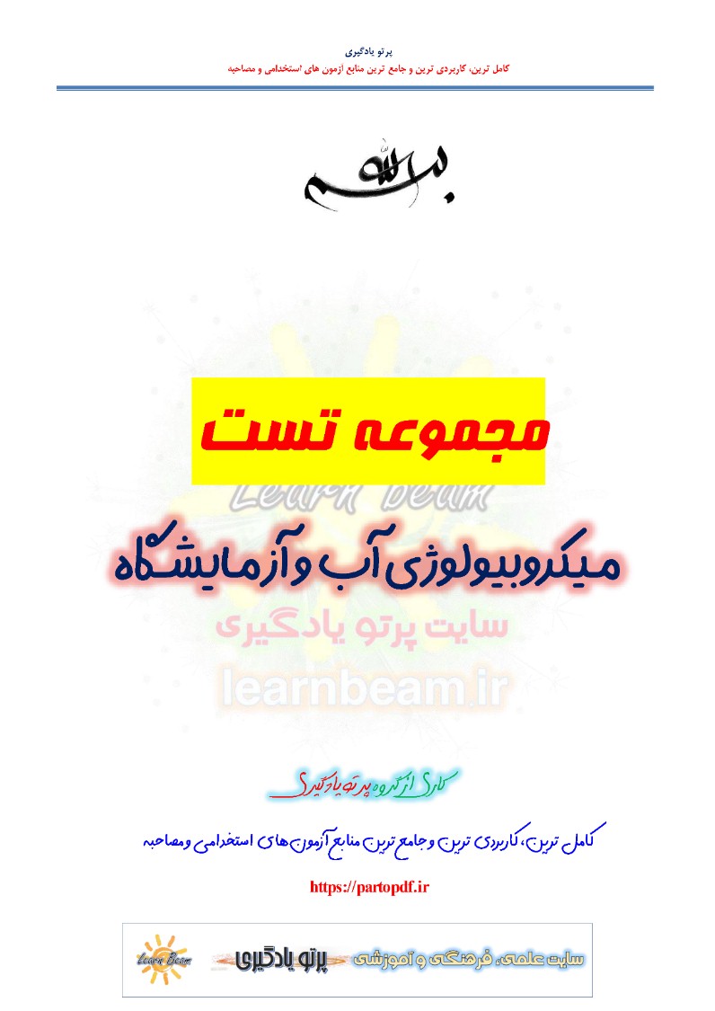 سوالات تستی میکروبیولوژی آب و آزمایشگاه شامل 255 سوال تستی در 93 صفحه با پاسخ تشریحی در قالب فایل pdf قابل چاپ با کیفیت عالی جهت انسجام ذهنی، خودآزمایی و مطالعه سریع داوطلبین شرکت کننده در آزمون های استخدامی و دوازدهمین امتحان مشترک فراگیر دستگاه های اجرایی کشور مطابق با دفترچه ثبت نام و مطابق با سرفصل های اعلام شده در دفترچه راهنمای ثبت نام می باشد.
