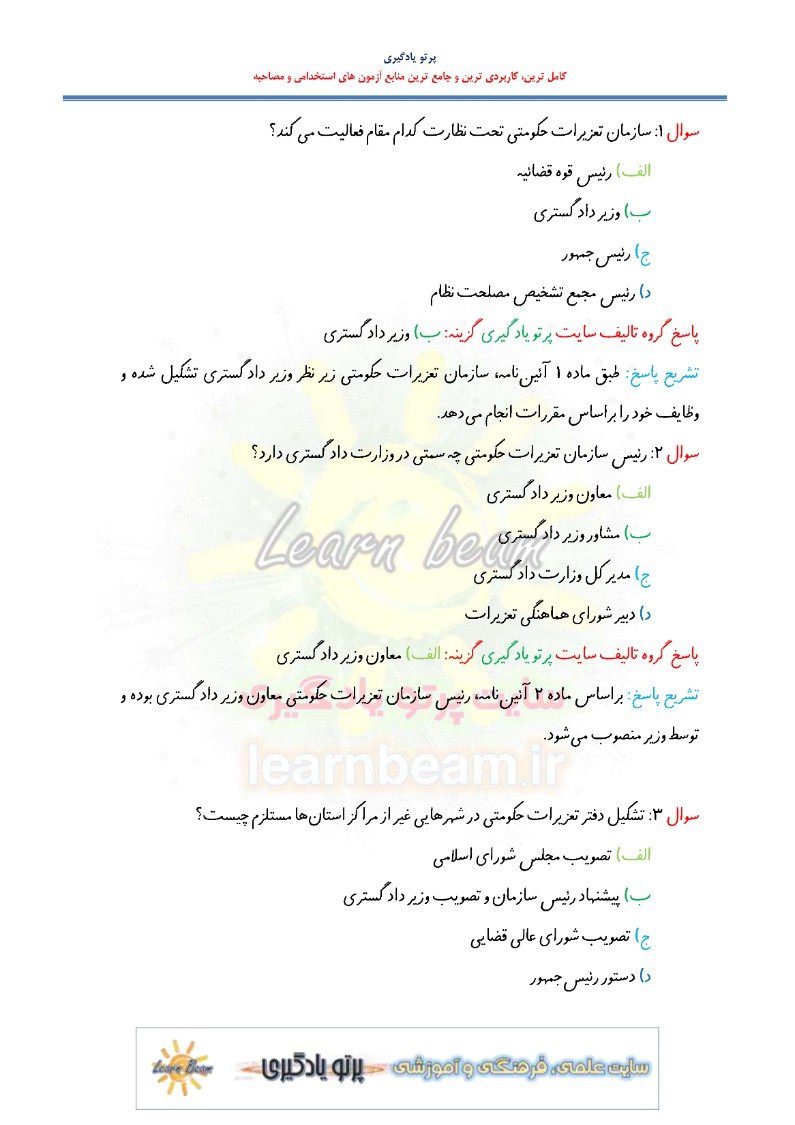سوالات تستی آیین نامه سازمان تعزیرات حکومتی شامل 60 سوال تستی در 25 صفحه با پاسخ تشریحی در قالب فایل pdf قابل چاپ با کیفیت عالی جهت انسجام ذهنی، خودآزمایی و مطالعه سریع داوطلبین شرکت کننده در آزمون های استخدامی و دوازدهمین امتحان مشترک فراگیر دستگاه های اجرایی کشور مطابق با دفترچه ثبت نام و مطابق با سرفصل های اعلام شده در دفترچه راهنمای ثبت نام می باشد.