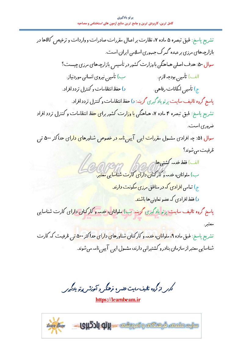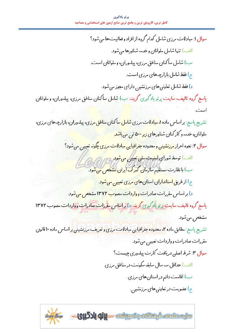 سوالات تستی قانون ساماندهی مبادلات مرزی و آیین نامه های اجرایی آن شامل 51 سوال تستی در 20 صفحه با پاسخ تشریحی در قالب فایل pdf قابل چاپ با کیفیت عالی جهت انسجام ذهنی، خودآزمایی و مطالعه سریع داوطلبین شرکت کننده در آزمون های استخدامی و دوازدهمین امتحان مشترک فراگیر دستگاه های اجرایی کشور مطابق با دفترچه ثبت نام و مطابق با سرفصل های اعلام شده در دفترچه راهنمای ثبت نام می باشد.