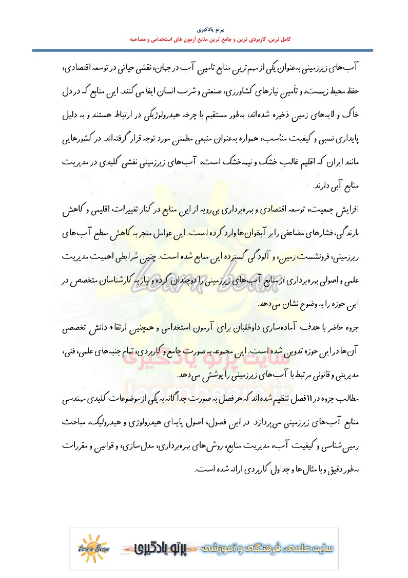 جزوه خلاصه مهندسی منابع آبهای زیرزمینی در 50 صفحه در قالب فایل pdf قابل چاپ با کیفیت عالی جهت انسجام ذهنی، خودآزمایی و مطالعه سریع داوطلبین شرکت کننده در آزمون های استخدامی و دوازدهمین امتحان مشترک فراگیر دستگاه های اجرایی کشور مطابق با دفترچه ثبت نام و مطابق با سرفصل های اعلام شده در دفترچه راهنمای ثبت نام می باشد.
