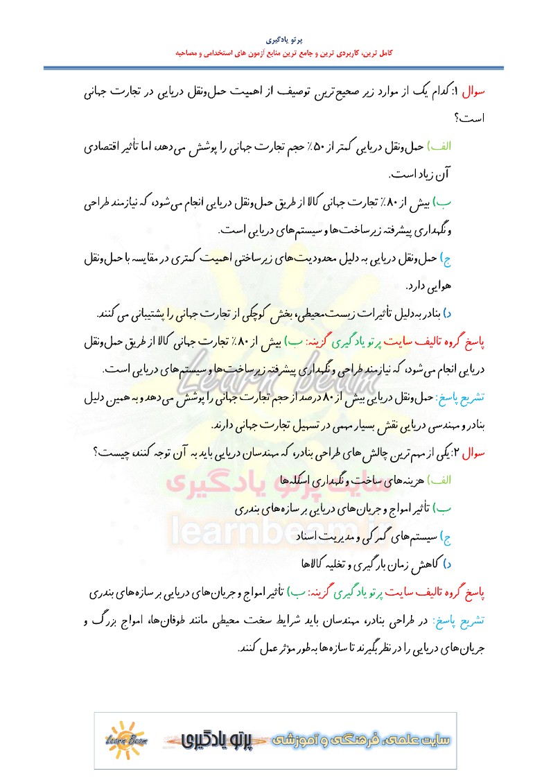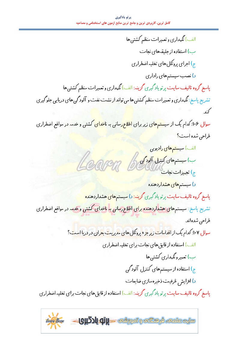 سوالات تستی اصول مهندسی دریایی شامل 190 سوال تستی در 78 صفحه در قالب فایل pdf قابل چاپ با کیفیت عالی جهت انسجام ذهنی، خودآزمایی و مطالعه سریع داوطلبین شرکت کننده در آزمون های استخدامی و دوازدهمین امتحان مشترک فراگیر دستگاه های اجرایی کشور مطابق با دفترچه ثبت نام و مطابق با سرفصل های اعلام شده در دفترچه راهنمای ثبت نام می باشد.