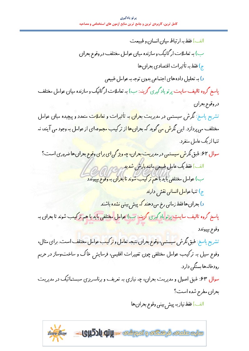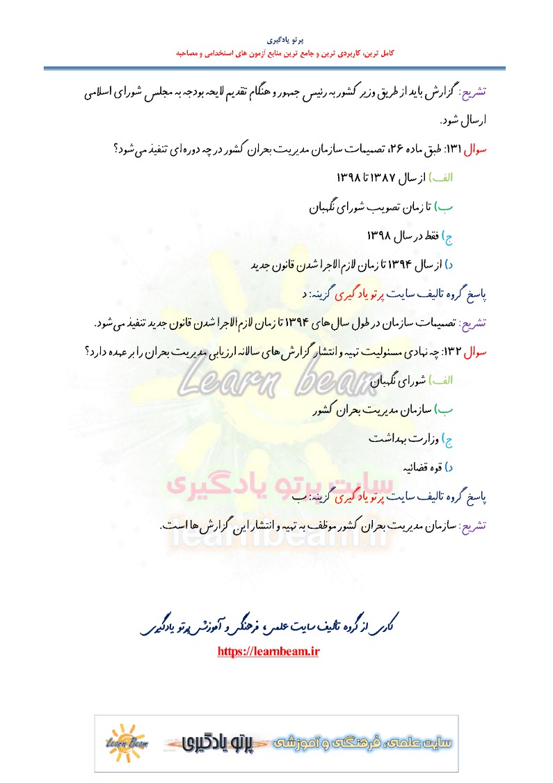 323 روز پیش ارسال پاسخبا توجه به اینکه در منابع آتش نشانی در محتوای ارائه شده در سایت جهاد دانشگاهی ترکیب مدیریت بحران آورده شده + قانون مدیریت بحران و ما در سایت این دو منبع را مجزا داریم در این مجموعه هر دو منبع رو به هم پیوند زدیم و در قالب یک فایل pdf ارائه کردیم. اگر محتوای فایل پی دی اف رو بررسی فرمایید خواهید دید که یک بار شماره سوالات از 1 شروع می شه و تا 13x می ره و دوباره از یک شروع و تا 132 ادامه داره. در هر حال مجموعه حاضر کامل و منسجم خدمتتان ارائه شده است. موفق باشید