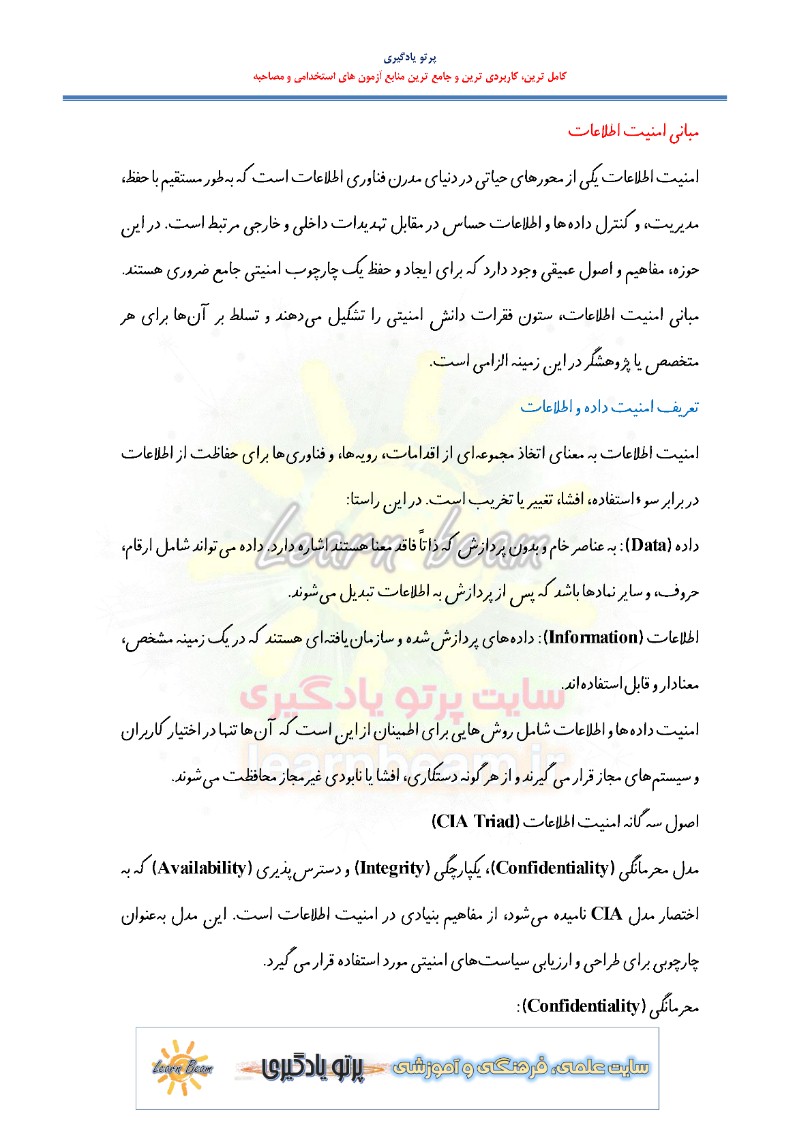 جزوه خلاصه امنیت داده در 65 صفحه در قالب فایل pdf قابل چاپ با کیفیت عالی جهت انسجام ذهنی، خودآزمایی و مطالعه سریع داوطلبین شرکت کننده در آزمون های استخدامی مطابق با دفترچه ثبت نام و مطابق با سرفصل های اعلام شده در دفترچه راهنمای ثبت نام می باشد.