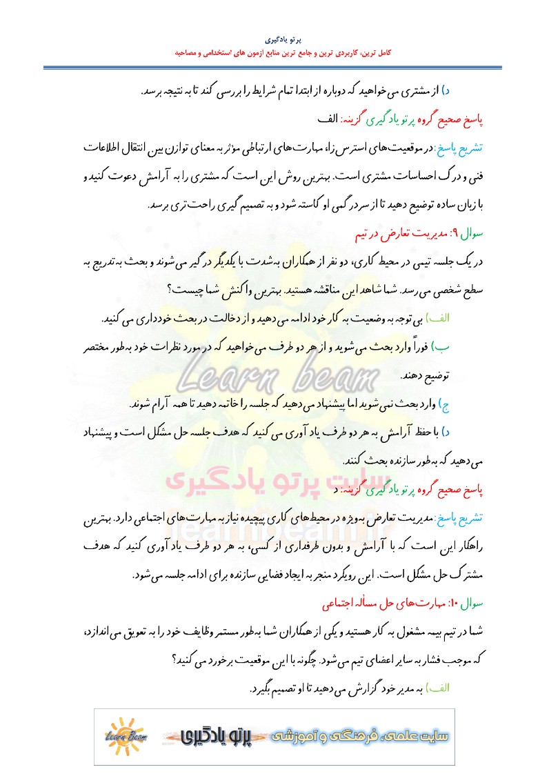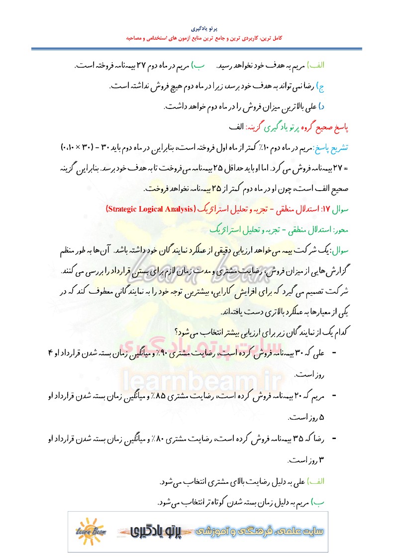 سوالات هوش و استعداد شغلی سوالات تستی هوش و استعداد شغلی ویژه استخدامی شرکت های بیمه تست هوش و استعداد شغلی شامل 112 سوال تستی در 76 صفحه در قالب فایل pdf می باشد. مجموعه سوالات تستی هوش و استعداد شغلی قابل چاپ با کیفیت عالی جهت انسجام ذهنی، خودآزمایی و مطالعه سریع داوطلبین شرکت کننده در آزمون های استخدامی بیمه ها مطابق با دفترچه راهنمای ثبت نام آزمون و اصلاحیه نهایی می باشد. اگر به دنبال راهی سریع و مؤثر برای درک مفاهیم مهم هوش و استعداد شغلی در خصوص بیمه هستید، جزوه نمونه سوالات تستی هوش و استعداد شغلی منبعی بینظیر برای داوطلبین و حرفهایها است که میخواهند با صرف کمترین زمان، بیشترین بهرهوری را داشته باشند. با این جزوه، نکات کلیدی را به سرعت بیاموزید و در آزمونها و پروژهها بدرخشید.