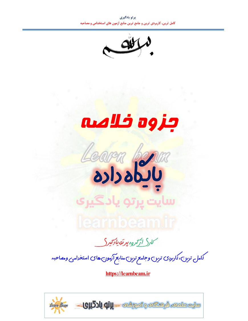 جزوه پایگاه داده جزوه خلاصه پایگاه داده در 73 صفحه در قالب فایل pdf می باشد. مجموعه خلاصه و نکات کلیدی پایگاه داده قابل چاپ با کیفیت عالی جهت انسجام ذهنی، خودآزمایی و مطالعه سریع داوطلبین شرکت کننده در آزمون های استخدامی مطابق با دفترچه راهنمای ثبت نام آزمون و اصلاحیه نهایی می باشد. اگر به دنبال راهی سریع و مؤثر برای درک مفاهیم مهم پایگاه داده هستید، جزوه خلاصه پایگاه داده منبعی بینظیر برای داوطلبین و حرفهایها است که میخواهند با صرف کمترین زمان، بیشترین بهرهوری را داشته باشند. با این جزوه، نکات کلیدی را به سرعت بیاموزید و در آزمونها و پروژهها بدرخشید.