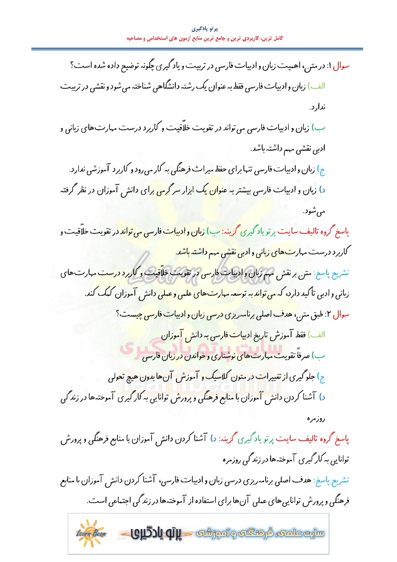 تست کتاب راهنمای معلم فارسی 1 پایه دهم متوسطه