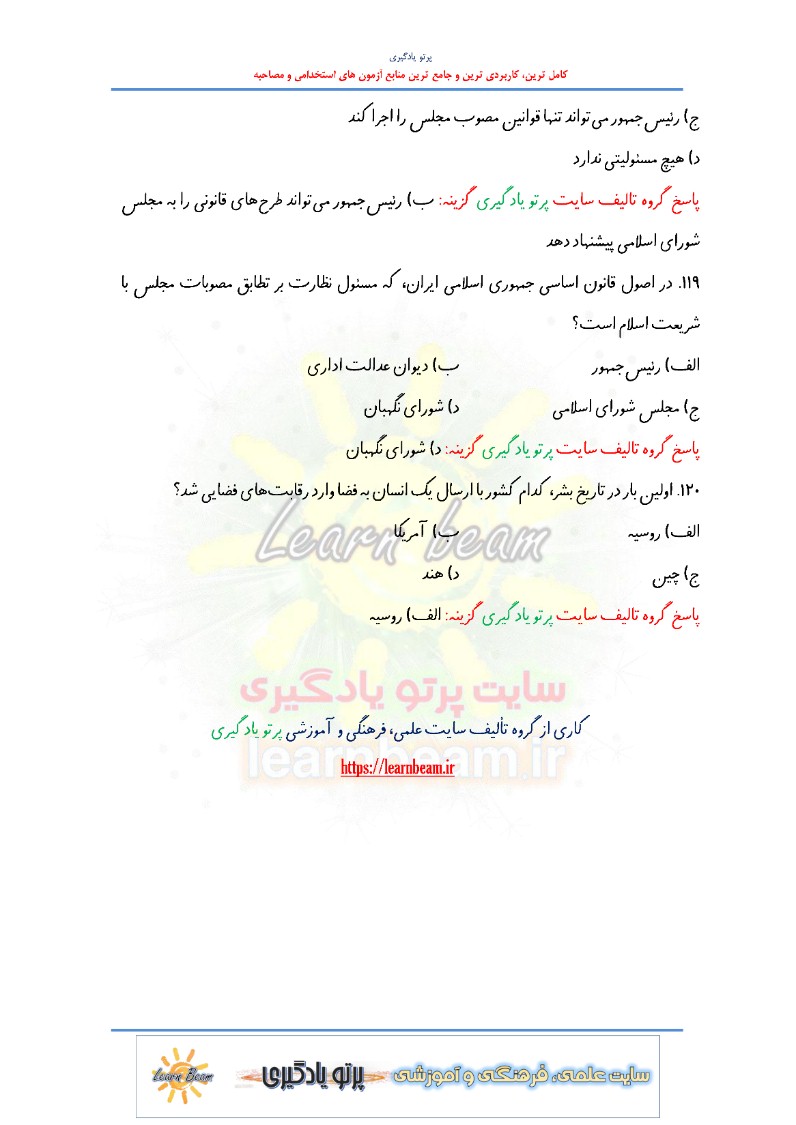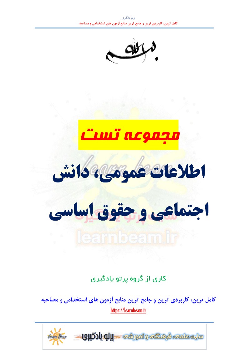 سوالات تستی اطلاعات عمومی، دانش اجتماعی و حقوق اساسی شامل 120 سوال تستی در 26 صفحه در قالب فایل pdf قابل چاپ با کیفیت عالی جهت انسجام ذهنی، خودآزمایی و مطالعه سریع داوطلبین شرکت کننده در آزمون های استخدامی مطابق با دفترچه ثبت نام و مطابق با سرفصل های اعلام شده در دفترچه راهنمای ثبت نام می باشد.