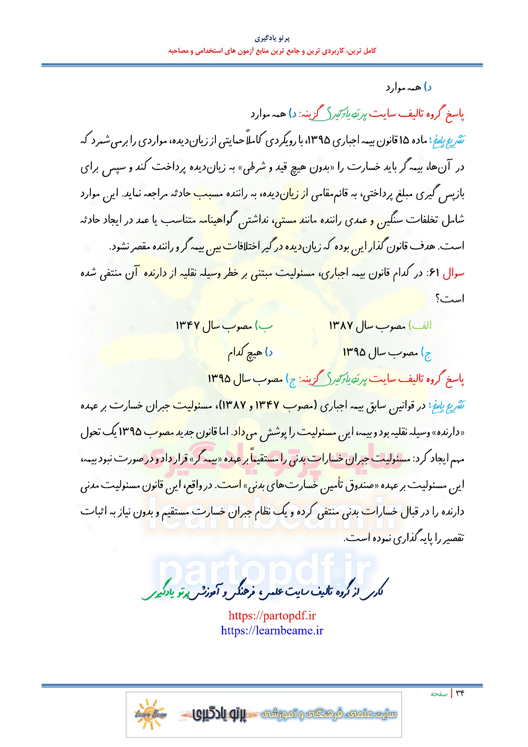 سوالات تستی حقوق بیمه شامل 61 سوال تستی در 34 صفحه در قالب فایل pdf با پاسخ تشریحی قابل چاپ با کیفیت عالی جهت انسجام ذهنی، خودآزمایی و مطالعه سریع داوطلبین شرکت کننده در آزمون های استخدامی بیمه ها مطابق با دفترچه ثبت نام و مطابق با سرفصل های اعلام شده در دفترچه راهنمای ثبت نام می باشد.
