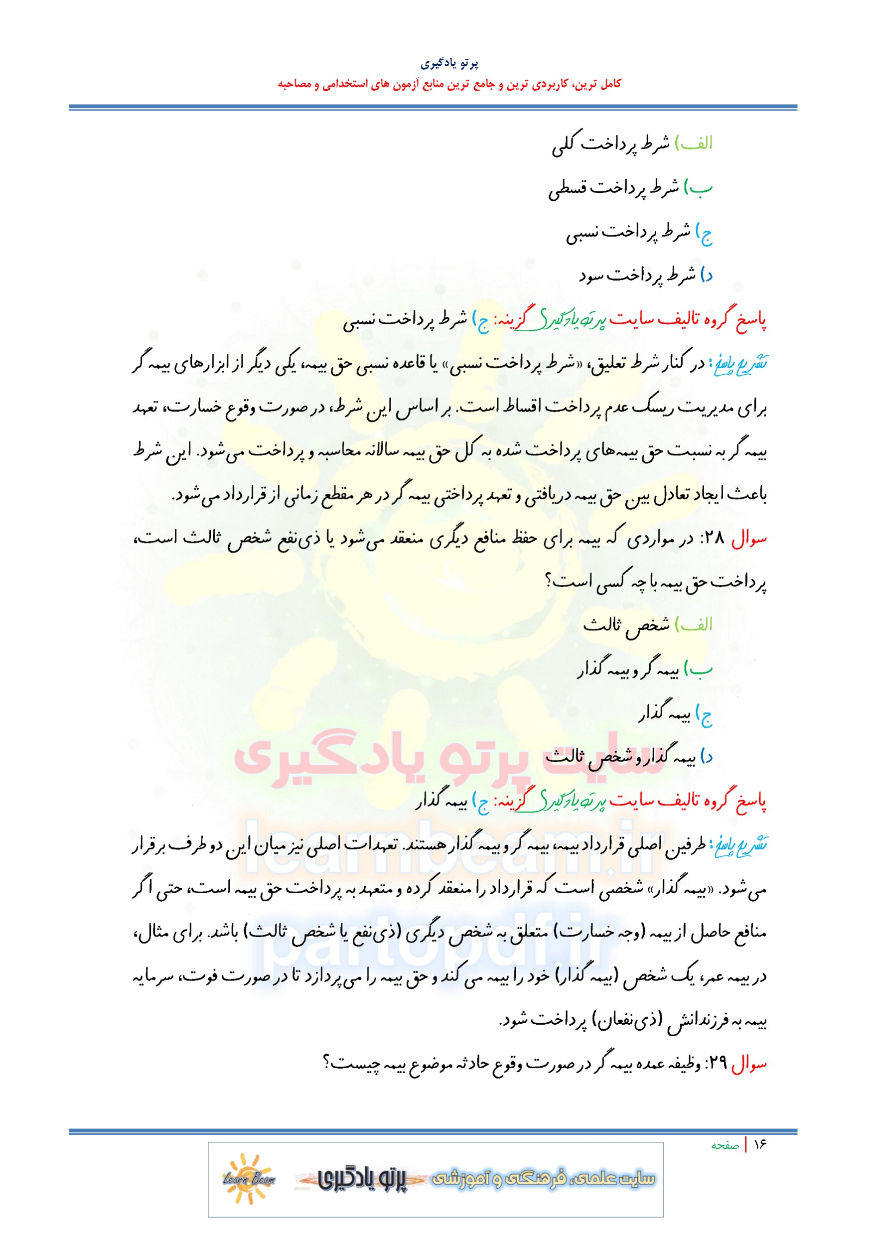 سوالات و تست حقوق بیمه. سوالات تستی حقوق بیمه ویژه استخدامی شرکت های بیمه جزوه سوالات تستی حقوق بیمه شامل 61 سوال با پاسخ تشریحی در 34 صفحه در قالب فایل pdf می باشد. مجموعه سوالات تستی حقوق بیمه قابل چاپ با کیفیت عالی جهت انسجام ذهنی، خودآزمایی و مطالعه سریع داوطلبین شرکت کننده در آزمون های استخدامی بیمه ها مطابق با دفترچه راهنمای ثبت نام آزمون و اصلاحیه نهایی می باشد. اگر به دنبال راهی سریع و مؤثر برای درک مفاهیم مهم حقوق بیمه هستید، جزوه سوالات تستی حقوق بیمه منبعی بینظیر برای داوطلبین و حرفهایها است که میخواهند با صرف کمترین زمان، بیشترین بهرهوری را داشته باشند. با این جزوه، نکات کلیدی را به سرعت بیاموزید و در آزمونها و پروژهها بدرخشید.