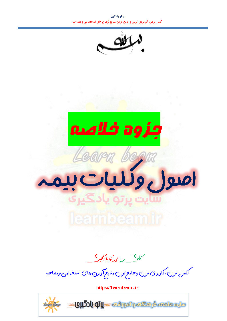 جزوه خلاصه اصول و کلیات بیمه جزوه نکات کلیدی و خلاصه اصول و کلیات بیمه ویژه استخدامی شرکت های بیمه جزوه خلاصه اصول و کلیات بیمه در 51 صفحه در قالب فایل pdf می باشد. مجموعه خلاصه اصول و کلیات بیمه قابل چاپ با کیفیت عالی جهت انسجام ذهنی، خودآزمایی و مطالعه سریع داوطلبین شرکت کننده در آزمون های استخدامی بیمه ها مطابق با دفترچه راهنمای ثبت نام آزمون و اصلاحیه نهایی می باشد. اگر به دنبال راهی سریع و مؤثر برای درک مفاهیم مهم اصول و کلیات بیمه هستید، جزوه نکات کلیدی اصول و کلیات بیمه منبعی بینظیر برای داوطلبین و حرفهایها است که میخواهند با صرف کمترین زمان، بیشترین بهرهوری را داشته باشند. با این جزوه، نکات کلیدی را به سرعت بیاموزید و در آزمونها و پروژهها بدرخشید.