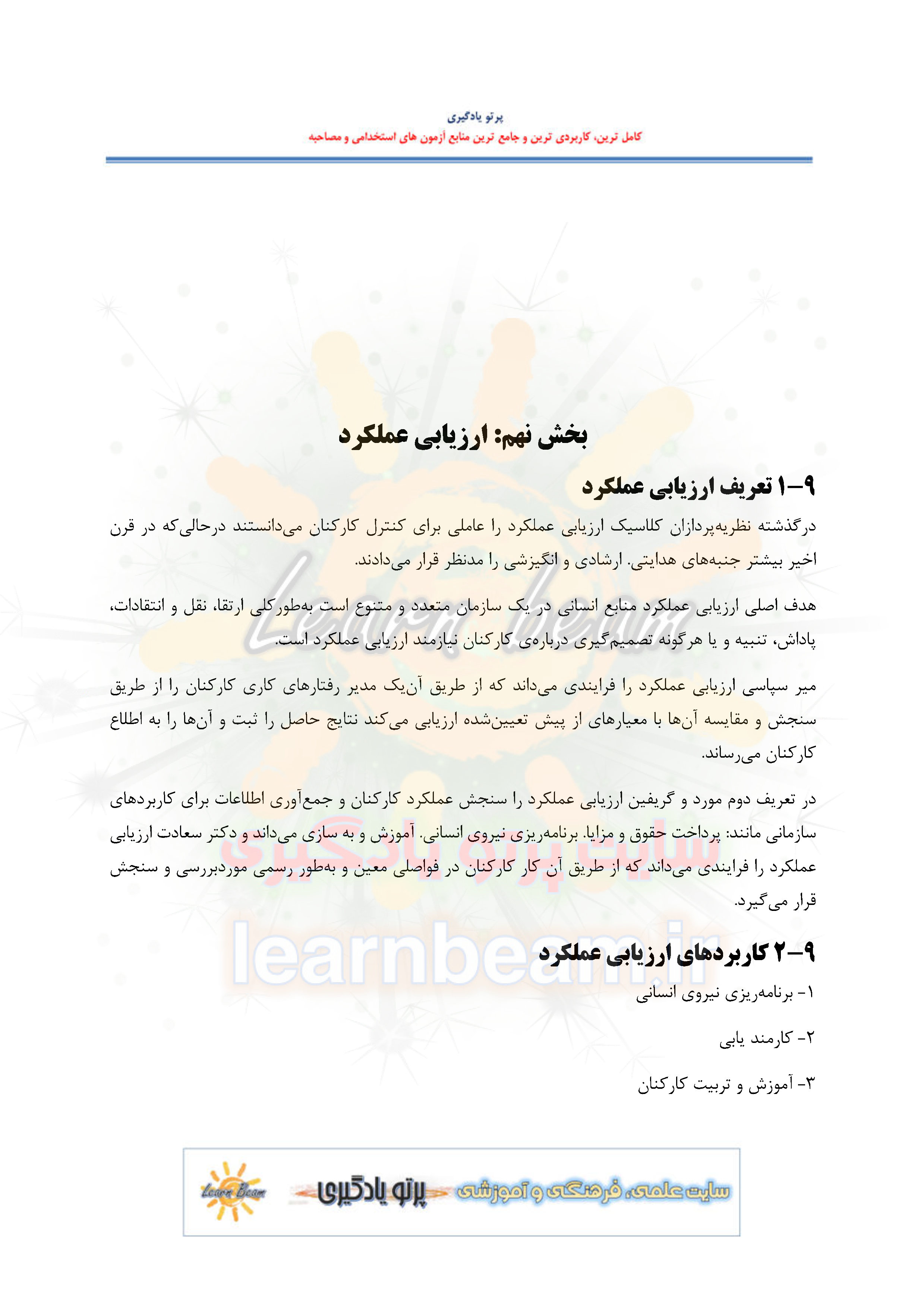 جزوه مدیریت منابع انسانی و رفتار سازمانی در 109 صفحه در قالب فایل pdf قابل چاپ با کیفیت عالی جهت انسجام ذهنی، خودآزمایی و مطالعه سریع داوطلبین شرکت کننده در آزمون های استخدامی مطابق با دفترچه ثبت نام و مطابق با سرفصل های اعلام شده در دفترچه راهنمای ثبت نام می باشد.
