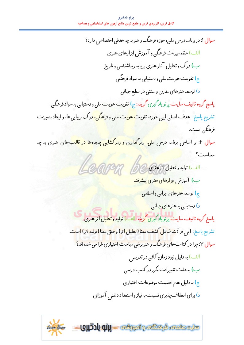 تست کتاب راهنمای معلم فرهنگ و هنر پایه هفتم متوسطه
