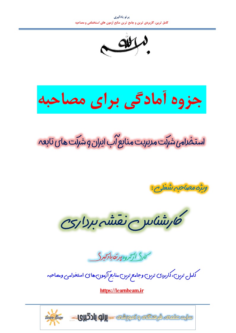 جزوه مصاحبه کارشناس نقشه برداری استخدامی شرکت مدیریت منابع آب ایران و شرکت های تابعه. مجموعه سوالات آمادگی برای مصاحبه کارشناس نقشه برداری استخدامی شرکت مدیریت منابع آب ایران. شرکت مدیریت منابع آب ایران و شرکت های تابعه در نظر دارد نیروهای مورد نیاز خود را پس از کسب موفقیت در آزمون کتبی، با انجام مصاحبه های تخصصی، عمومی و طی مراحل اداری تامین کند. این مجموعه برای آمادگی عزیزان پذیرفته شده برای مصاحبه در مرحله اول آزمون استخدامی دوازدهمین دوره استخدامی دستگاه های اجرایی کشور تهیه گردیده است. مجموعه سوالات آمادگی برای مصاحبه استخدامی کارشناس نقشه برداری برای حضور توانمند عزیزان در کانون های مصاحبه تالیف گردیده است. این مجموعه شامل: کلیات مصاحبه و آمادگی برای آن سوالات گزینش و سوالات عمومی و تخصصی در 226 صفحه در قالب فایل pdf با محتوای جامع و نکات کلیدی، کلید موفقیت شما در استخدام در شرکت مدیریت منابع آب ایران و شرکتهای تابعه تهیه گردیده است.