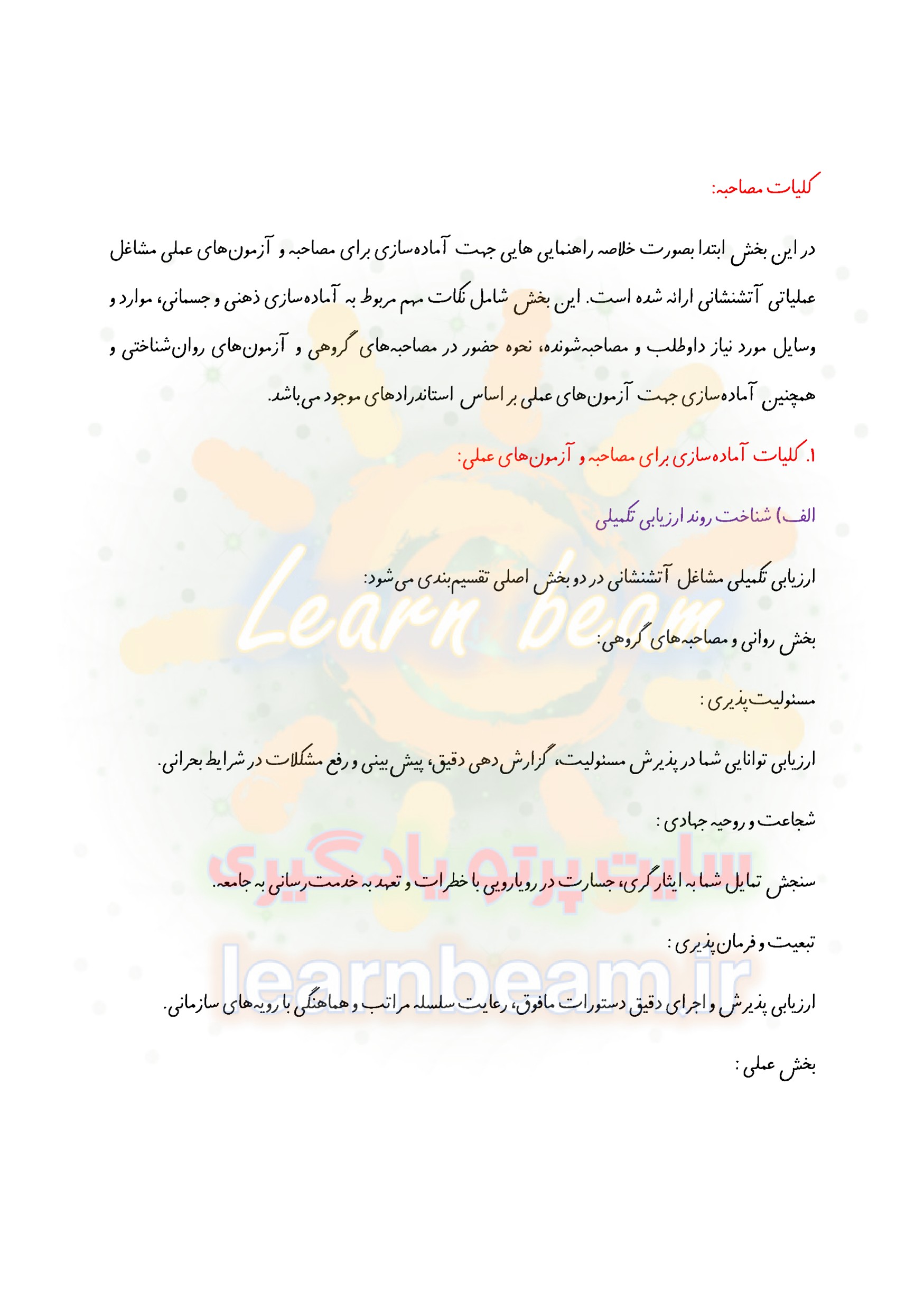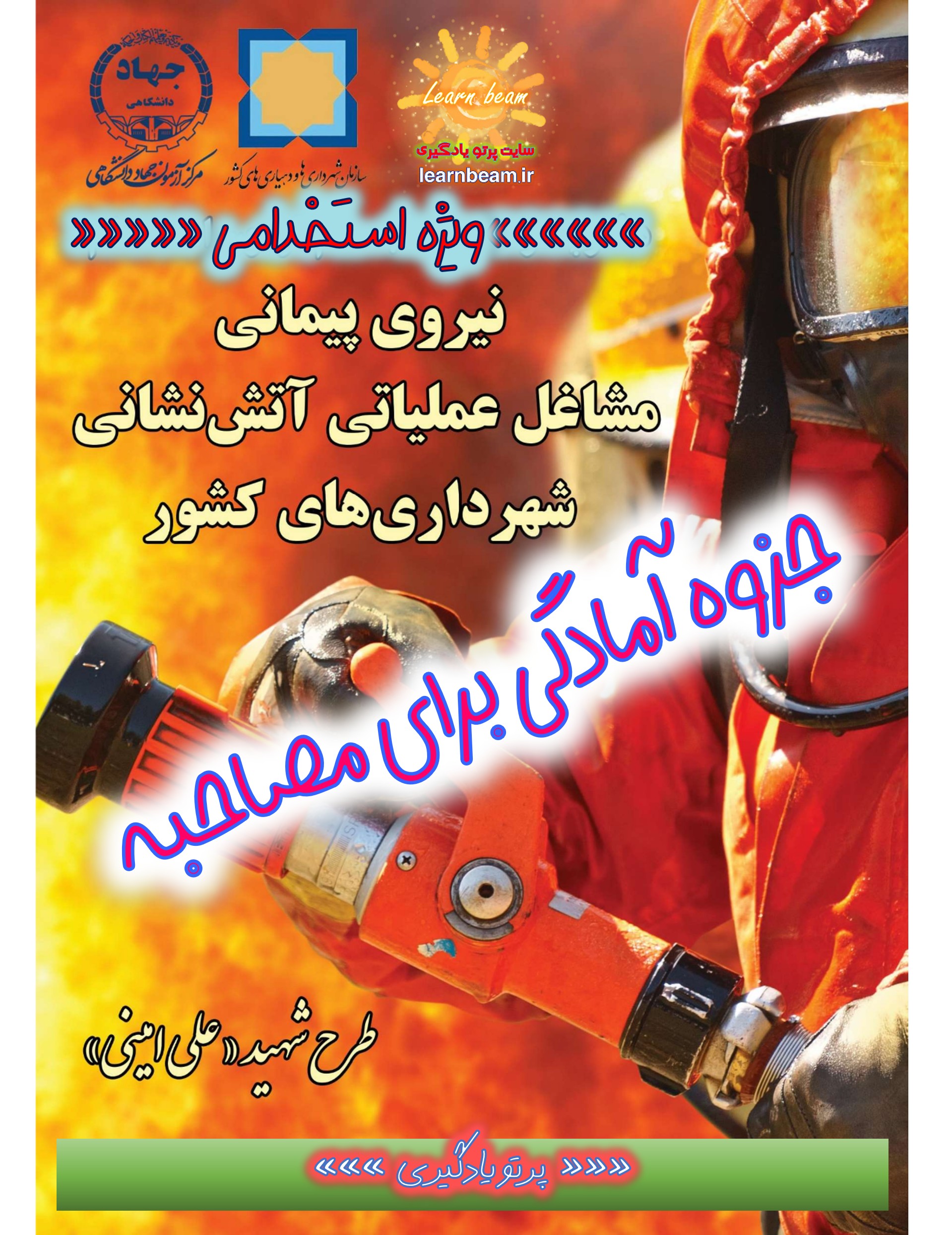 سوالات مصاحبه مشاغل عملیاتی آتش نشانی استخدامی سازمان شهرداری های کشور سال 1403 جزوه سوالات مصاحبه و آموزش مهارت های عملی مشاغل عملیاتی آتش نشانی استخدامی سازمان شهرداری ها و دهیاری های کشور در سال 1403. جزوه آموزشی و سوالات آمادگی برای مصاحبه و مهارت های عملی استخدامی مشاغل عملیاتی آتش نشانی 1403. سازمان شهرداری ها و دهیاری های کشور در نظر دارد نیروهای مورد نیاز خود در زمینه مشاغل عملیاتی آتش نشانی را پس از کسب موفقیت در آزمون کتبی، با انجام مصاحبه های تخصصی، عمومی و عملی تامین کند. جزوه آموزش نظری و سوالات مصاحبه مشاغل عملیاتی آتش نشانی برای آمادگی عزیزان پذیرفته شده برای مصاحبه در مرحله اول آزمون استخدامی مشاغل عملیاتی آتش نشانی استخدامی سازمان شهرداری های کشور در سال 1403 تهیه گردیده است. جزوه آموزش مهارت های عملی و مجموعه سوالات آمادگی برای مصاحبه استخدامی آتش نشانی برای حضور توانمند پذیرفته شدگان آزمون استخدامی مشاغل عملیاتی آتش نشانی در کانون های مصاحبه و در بر گیرنده کلیات مصاحبه، گزینش عمومی و دانش نظری برای انجام آزمون های عملی هفتگانه استخدامی مشاغل آتش نشانی تدوین شده است.