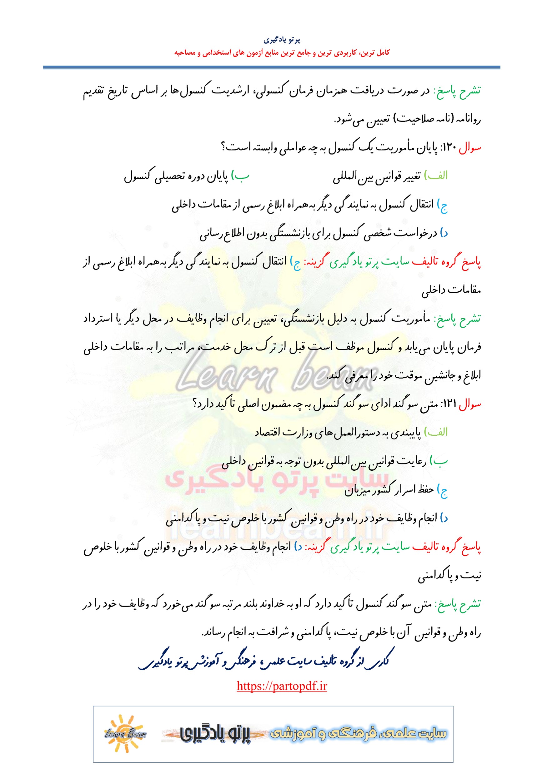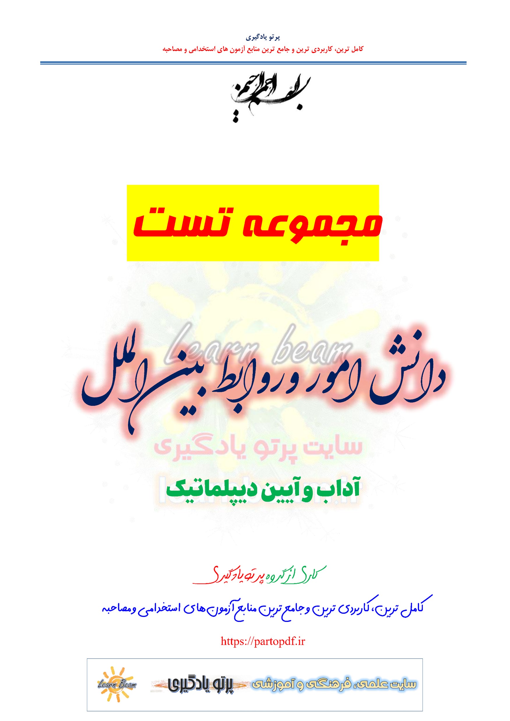 تست آداب و آیین دیپلماتیک دانش امور و روابط بین الملل شامل 121 سوال تستی در 51 صفحه در قالب فایل pdf. مجموعه تست آداب و آیین دیپلماتیک بهترین منبع برای آمادگی آزمون های استخدامی و آزمون اعزام فرهنگیان به مدارس خارج از کشور و ... می باشد. مجموعه سوالات و تست آداب و آیین دیپلماتیک مطالب خوانده شده داوطلبین آزمون استخدامی را نظم بخشیده و منسجم می سازد. مجموعه سوالات تستی آداب و آیین دیپلماتیک مرور سریع داوطلب را سبب می شود و آگاهی های وی را نظم بخشیده و یک آمادگی و شبیه سازی را برای جلسه آزمون به همراه دارد. مطالعه این منبع داوطلبین آزمون های استخدامی و آزمون اعزام فرهنگیان به مدارس خارج از کشور پیشنهاد می شود.