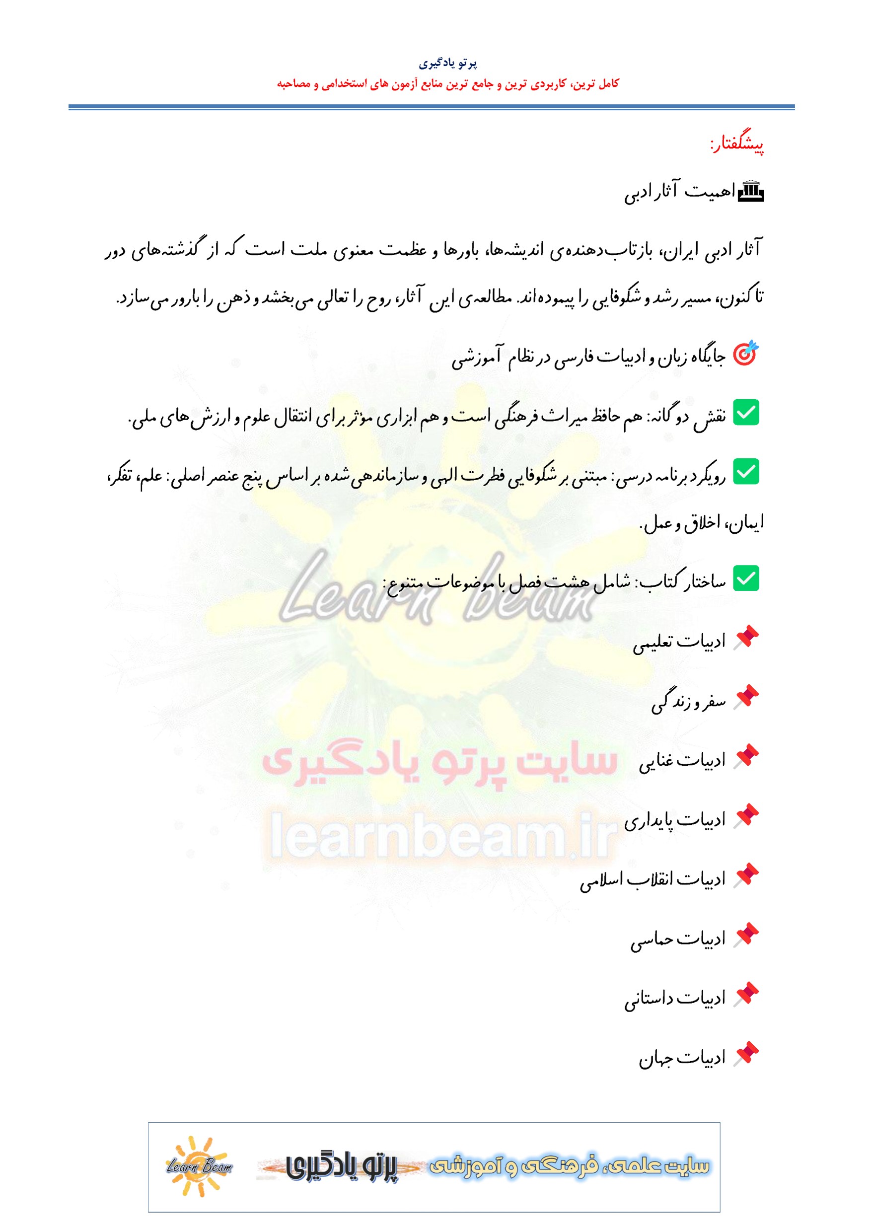 جزوه خلاصه راهنمای معلم فارسی 2 پایه یازدهم متوسطه در 141 صفحه در قالب pdf. مجموعه ای کامل برای مطالعه و موفقیت در آزمون های استخدامی آموزش و پرورش و سایر آزمون های استخدامی است. این مجموعه ارزشمند در قالب فایل پی دی اف می تواند مناسب ترین انتخاب برای انسجام ذهنی و آمادگی برای آزمون شما عزیزان باشد. مجموعه خلاصه نکات برجسته و کلیدی راهنمای معلم فارسی 2 پایه یازدهم متوسط برای تجمیع، جمع بندی و مرور سریع متناسب با سرفصل های اعلامی آزمون استخدامی آموزش و پرورش طراحی و تدوین شده است.