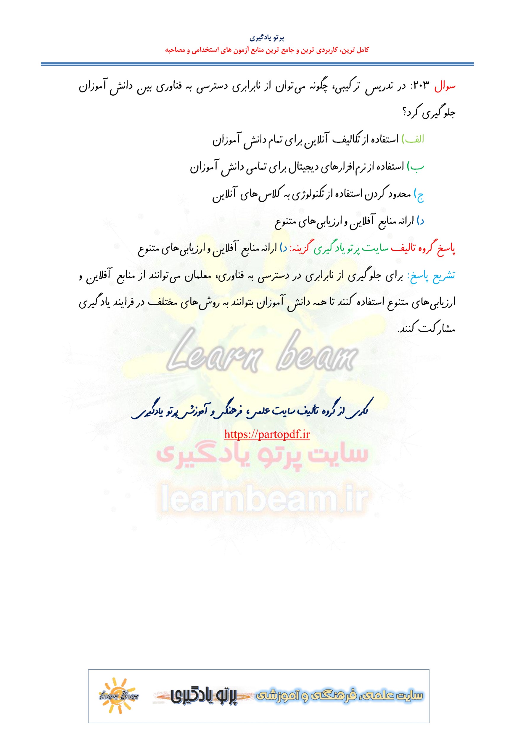 تست کاربرد فناوری اطلاعات و ارتباطات در آموزش شامل 203 سوال تستی در 97 صفحه با پاسخ تشریحی در قالب فایل pdf. مجموعه تست کاربرد فناوری اطلاعات و ارتباطات در آموزش بهترین منبع برای آمادگی آزمون های استخدامی و آزمون اعزام فرهنگیان به مدارس خارج از کشور و ... می باشد. مجموعه سوالات و تست کاربرد فناوری اطلاعات و ارتباطات در آموزش مطالب خوانده شده داوطلبین آزمون استخدامی را نظم بخشیده و منسجم می سازد. مجموعه سوالات تستی کاربرد فناوری اطلاعات و ارتباطات در آموزش مرور سریع داوطلب را سبب می شود و آگاهی های وی را نظم بخشیده و یک آمادگی و شبیه سازی را برای جلسه آزمون به همراه دارد. مطالعه این منبع داوطلبین آزمون های استخدامی و آزمون اعزام فرهنگیان به مدارس خارج از کشور پیشنهاد می شود.