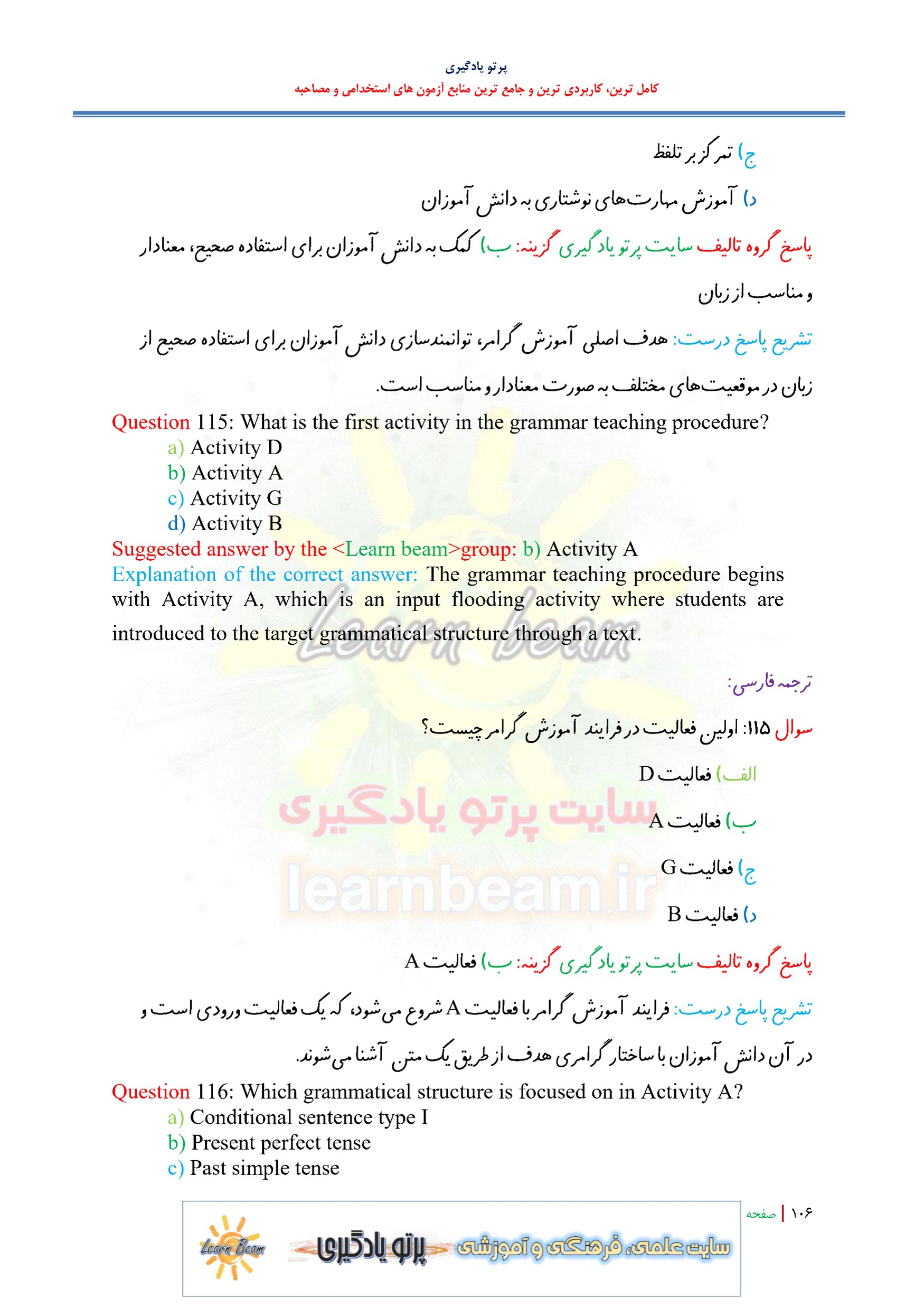 تست کتاب راهنمای معلم انگلیسی پایه یازدهم کد کتاب 111360 جزوه سوالات تستی کتاب راهنمای معلم انگلیسی پایه یازدهم با ترجمه فارسی و پاسخ تشریحی شامل 131 تست در 118 صفحه در قالب فایل pdf. جزوه مجموعه سوالات تستی کتاب راهنمای معلم انگلیسی پایه یازدهم مجموعه ای کامل برای مطالعه و موفقیت در آزمون های استخدامی آموزش و پرورش و سایر آزمون های استخدامی است. جزوه تست طلایی کتاب روش تدریس انگلیسی پایه یازدهم در قالب فایل پی دی اف می تواند مناسب ترین انتخاب برای داوطلبین عزیز در جهت تحکیم اطلاعات ذهنی و جمع بندی مطالب باشد. مجموعه سوالات تستی کتاب راهنمای معلم انگلیسی پایه یازدهم انسجام ذهنی و آمادگی ذهنی فراگیران برای آزمون استخدامی آموزش و پرورش را در پی دارد. این منبع متناسب با سرفصل های اعلامی دفترچه آزمون استخدامی تدوین و تالیف گردیده است.