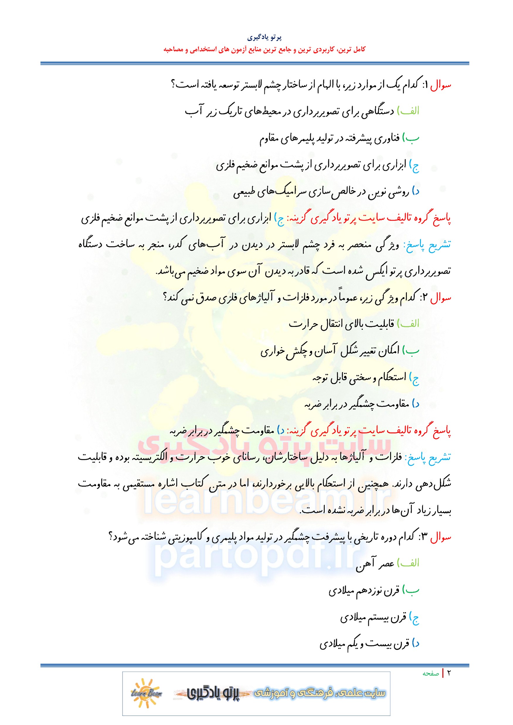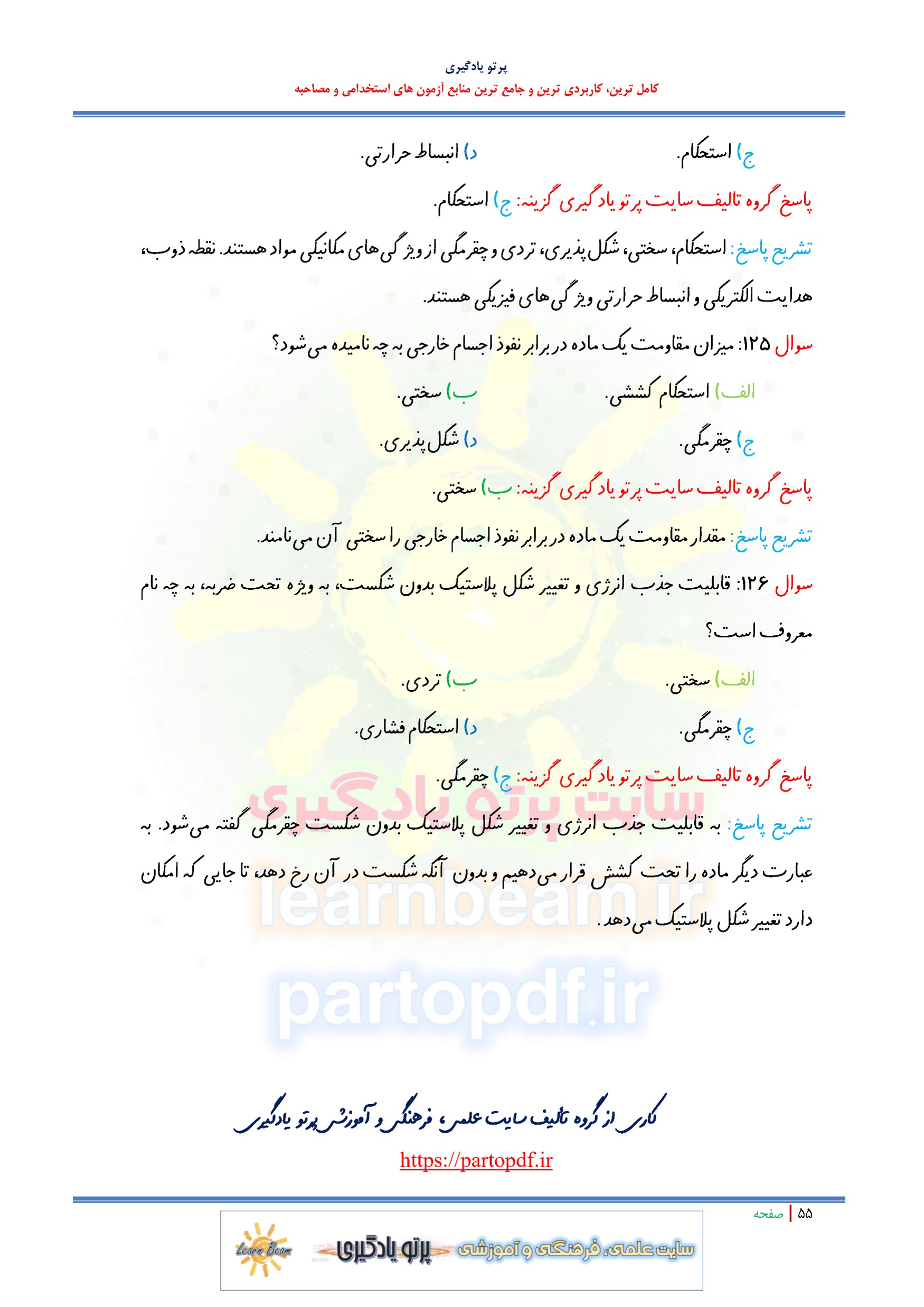 سوالات و تست کتاب دانش فنی پایه صنایع فلزی شامل 126 تست در 55 صفحه با پاسخ تشریحی در قالب فایل pdf. بهترین منبع برای آزمون های استخدامی می باشد. جزوه سوالات تستی کتاب دانش فنی پایه صنایع فلزی مطالب خوانده شده داوطلبین آزمون استخدامی را نظم بخشیده و منسجم می سازد. این مجموعه مرور سریع داوطلب را سبب می شود و آگاهی های وی را نظم بخشیده و یک آمادگی و شبیه سازی را برای جلسه آزمون به همراه دارد. مطالعه این منبع برای همه داوطلبین عزیز پیشنهاد می شود.