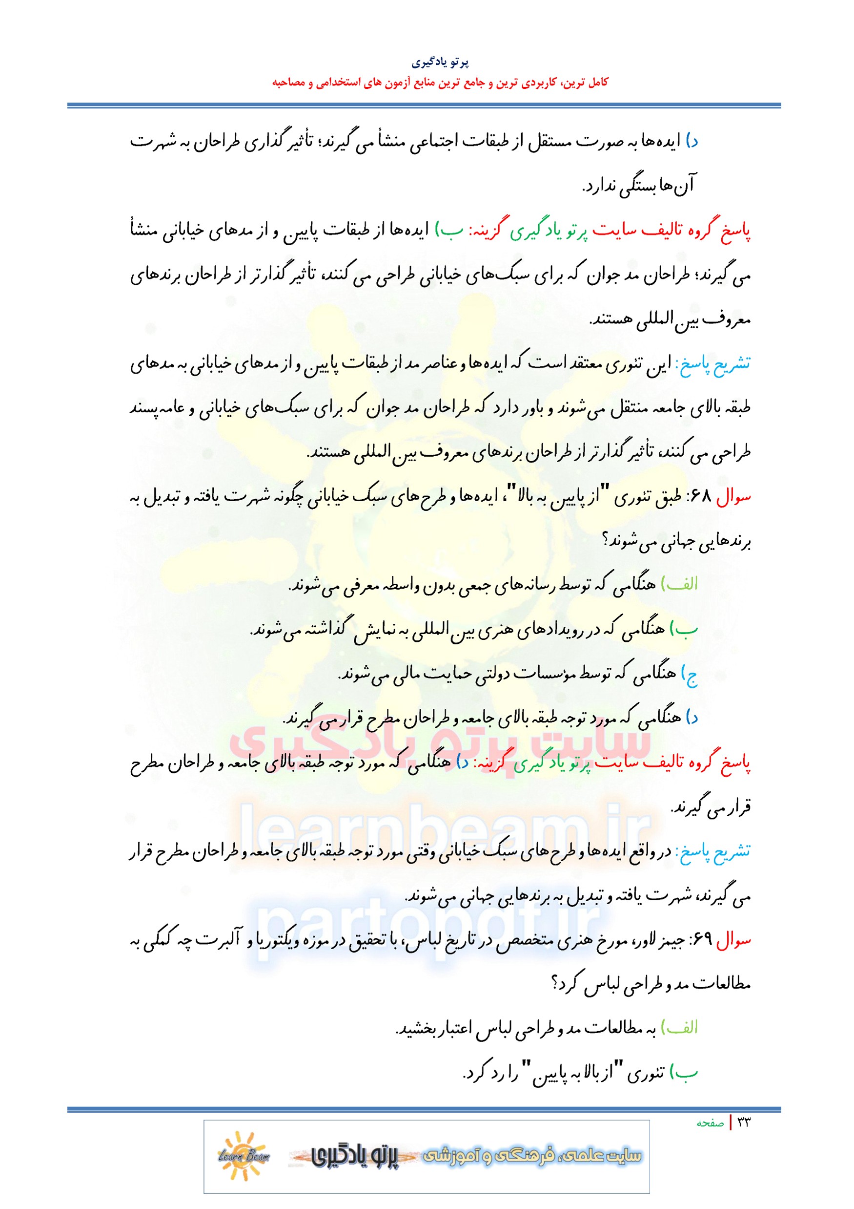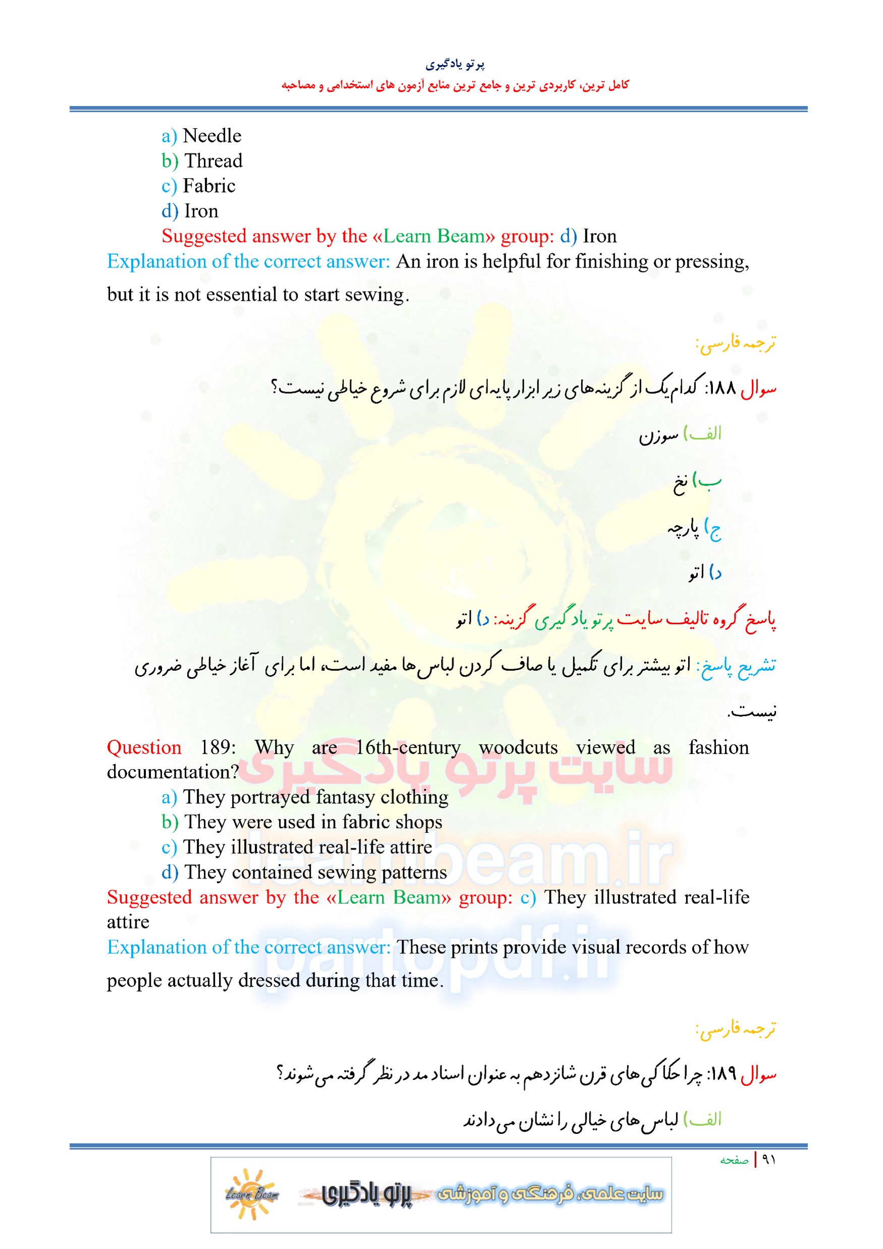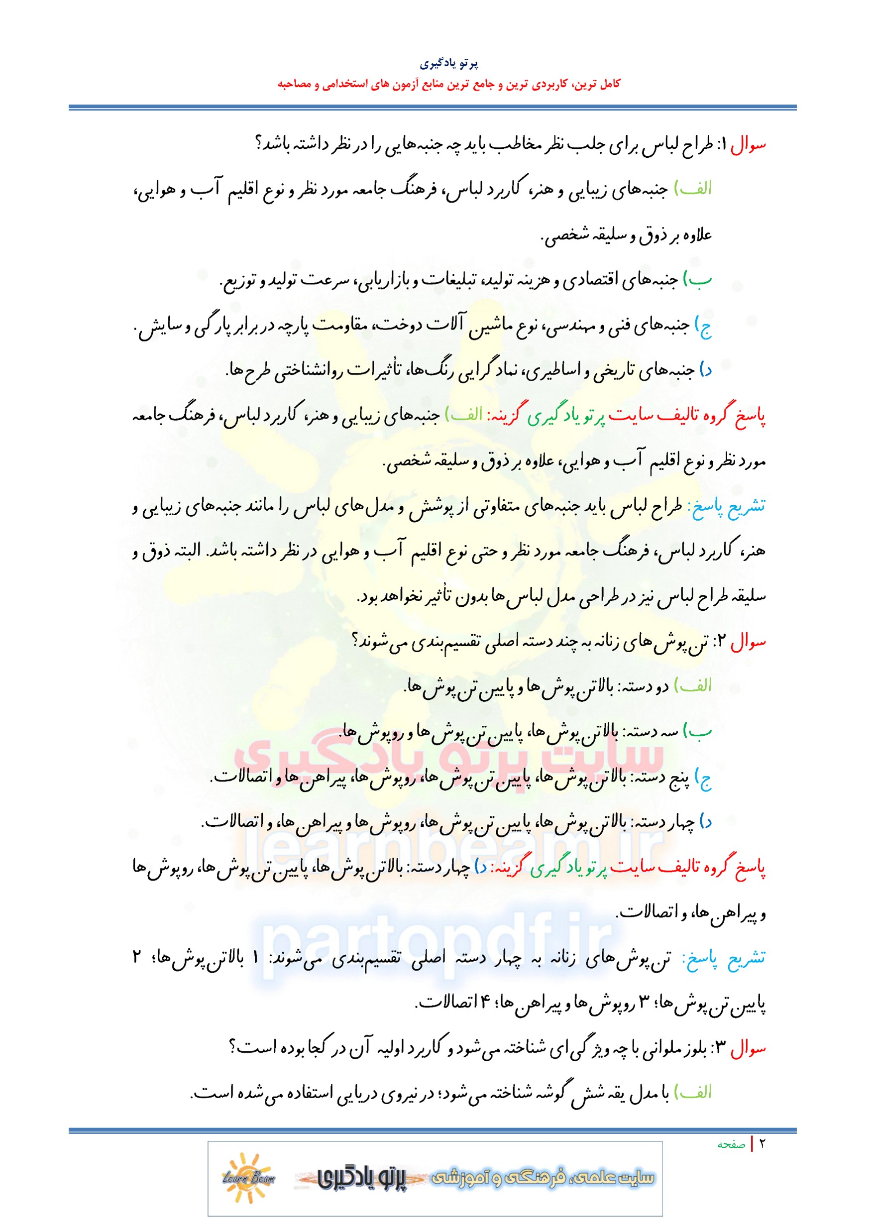 مجموعه سوالات و تست کتاب دانش فنی تخصصی طراحی و دوخت با پاسخ تشریحی