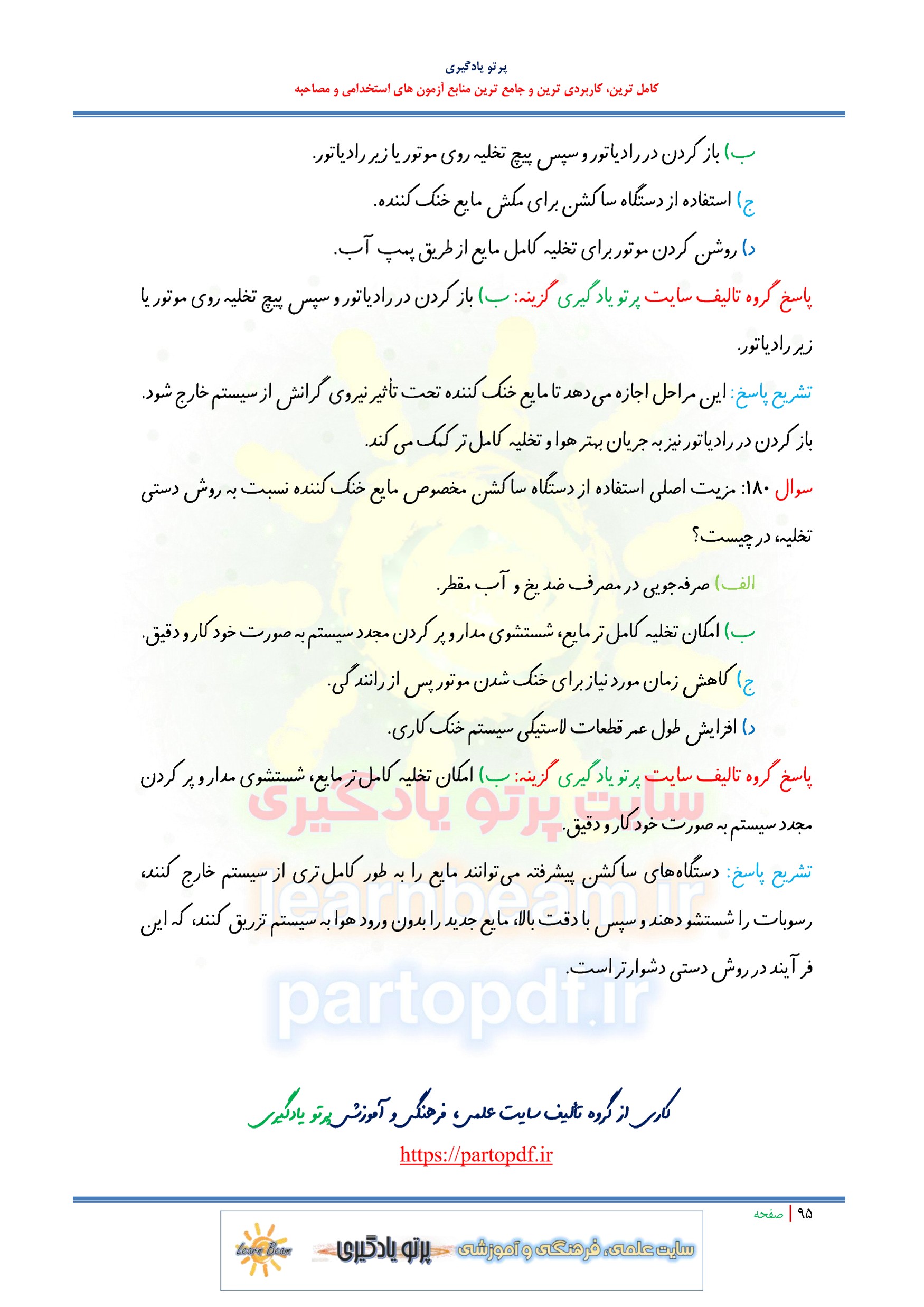 سوالات و تست کتاب سرویس و نگهداری خودروهای سواری شامل 180 تست در 95 صفحه با پاسخ تشریحی در قالب فایل pdf. بهترین منبع برای آزمون های استخدامی می باشد. جزوه سوالات تستی کتاب سرویس و نگهداری خودروهای سواری مطالب خوانده شده داوطلبین آزمون استخدامی را نظم بخشیده و منسجم می سازد. این مجموعه مرور سریع داوطلب را سبب می شود و آگاهی های وی را نظم بخشیده و یک آمادگی و شبیه سازی را برای جلسه آزمون به همراه دارد. مطالعه این منبع برای همه داوطلبین عزیز پیشنهاد می شود.