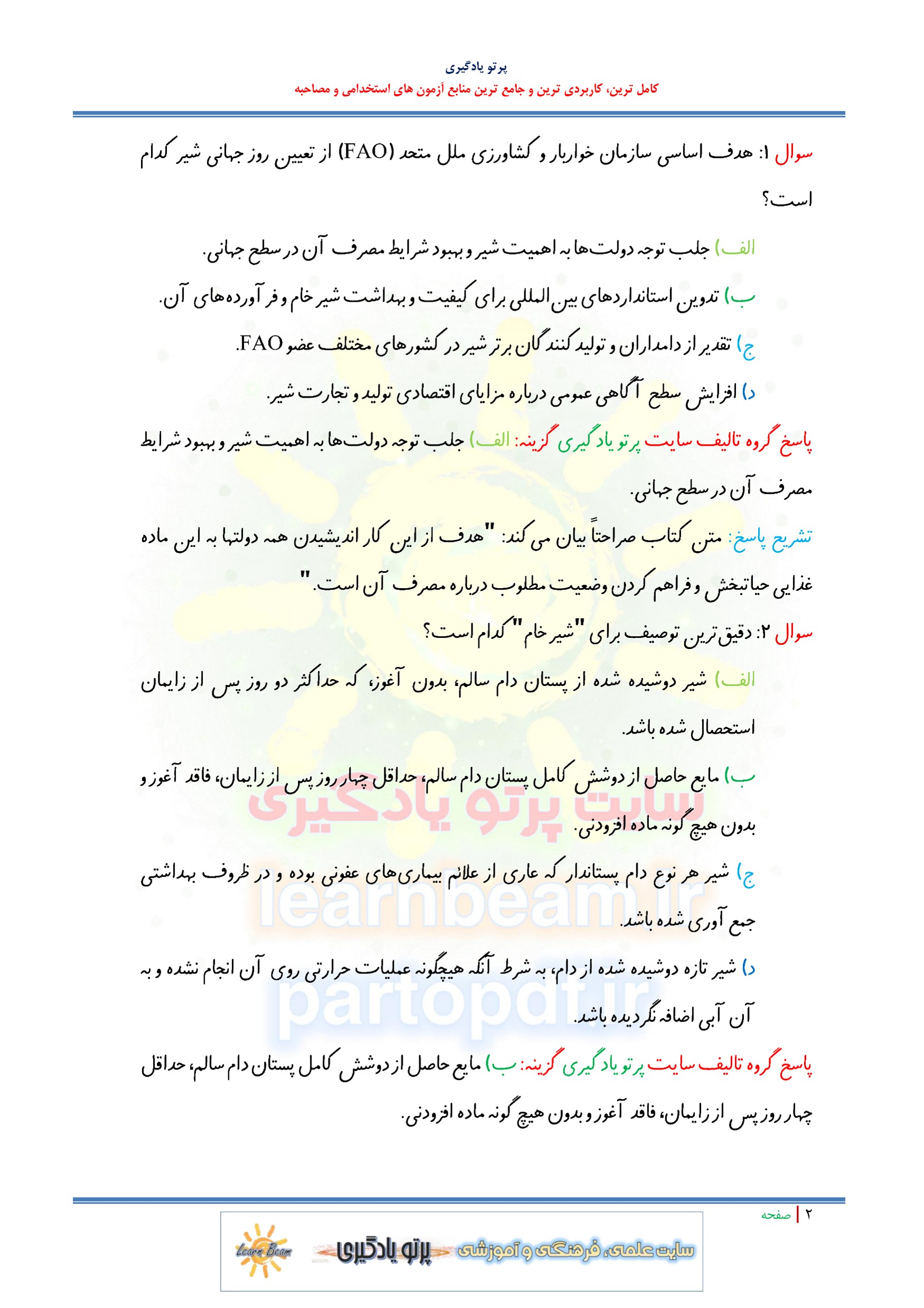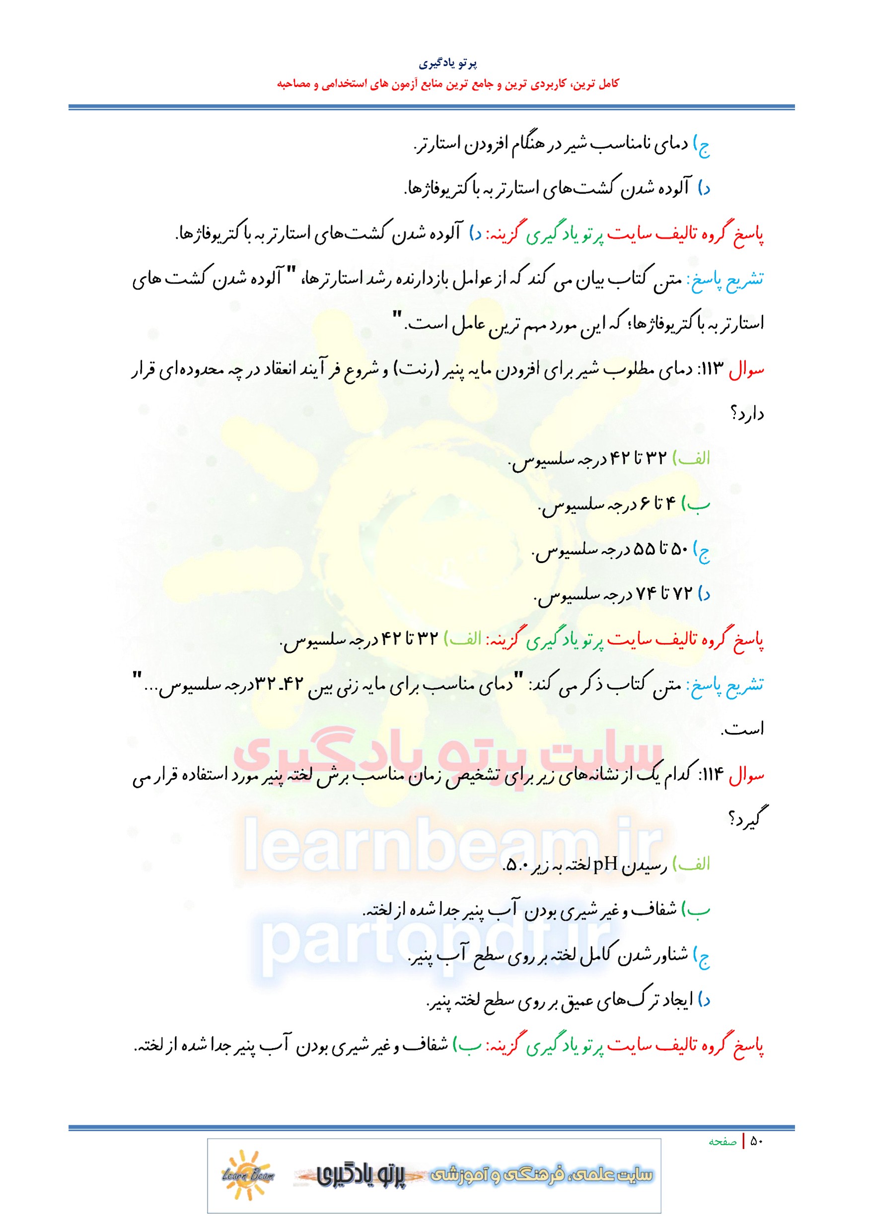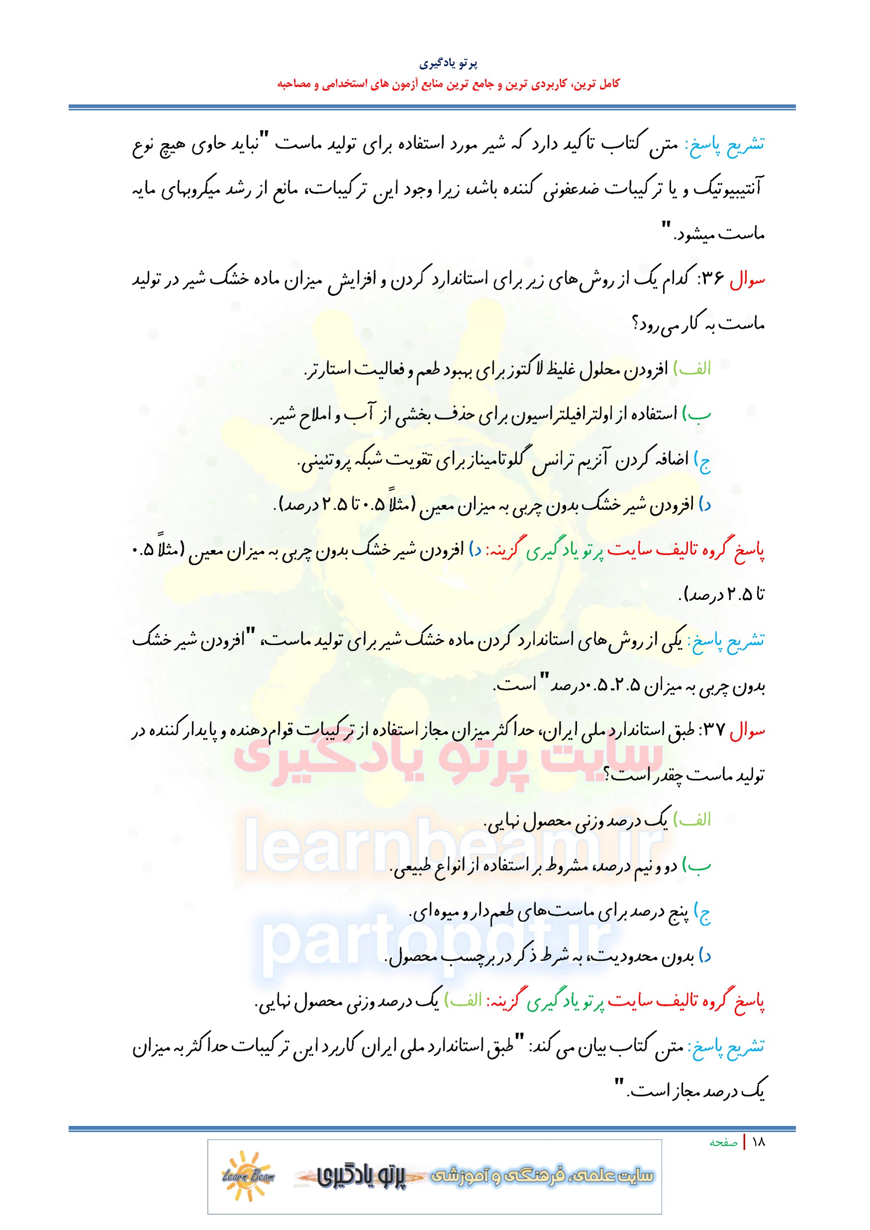 مجموعه سوالات و تست کتاب تولید فرآورده های لبنی با پاسخ تشریحی