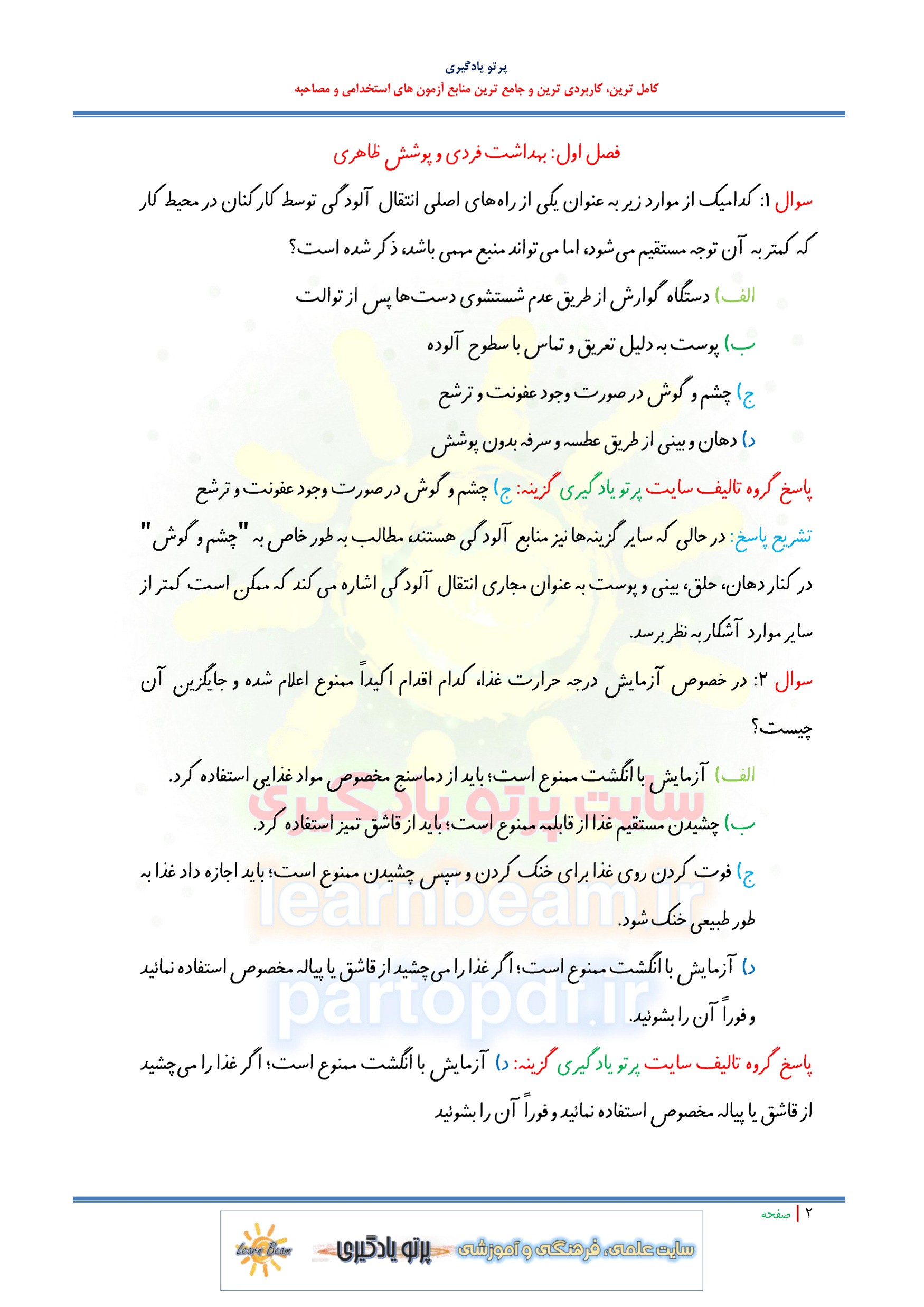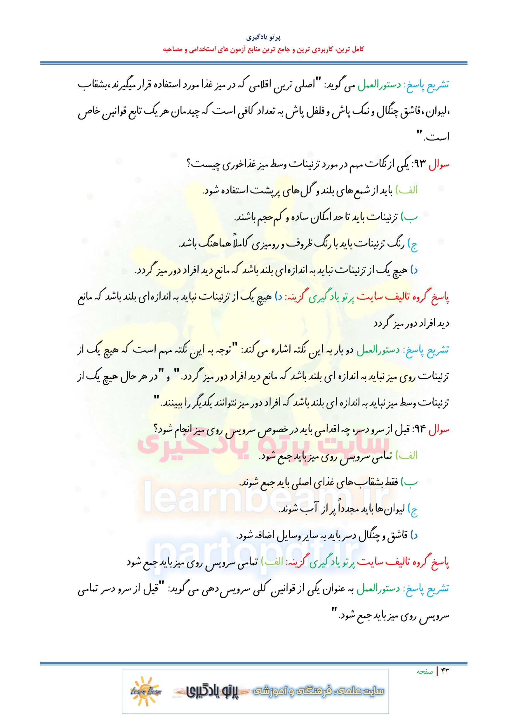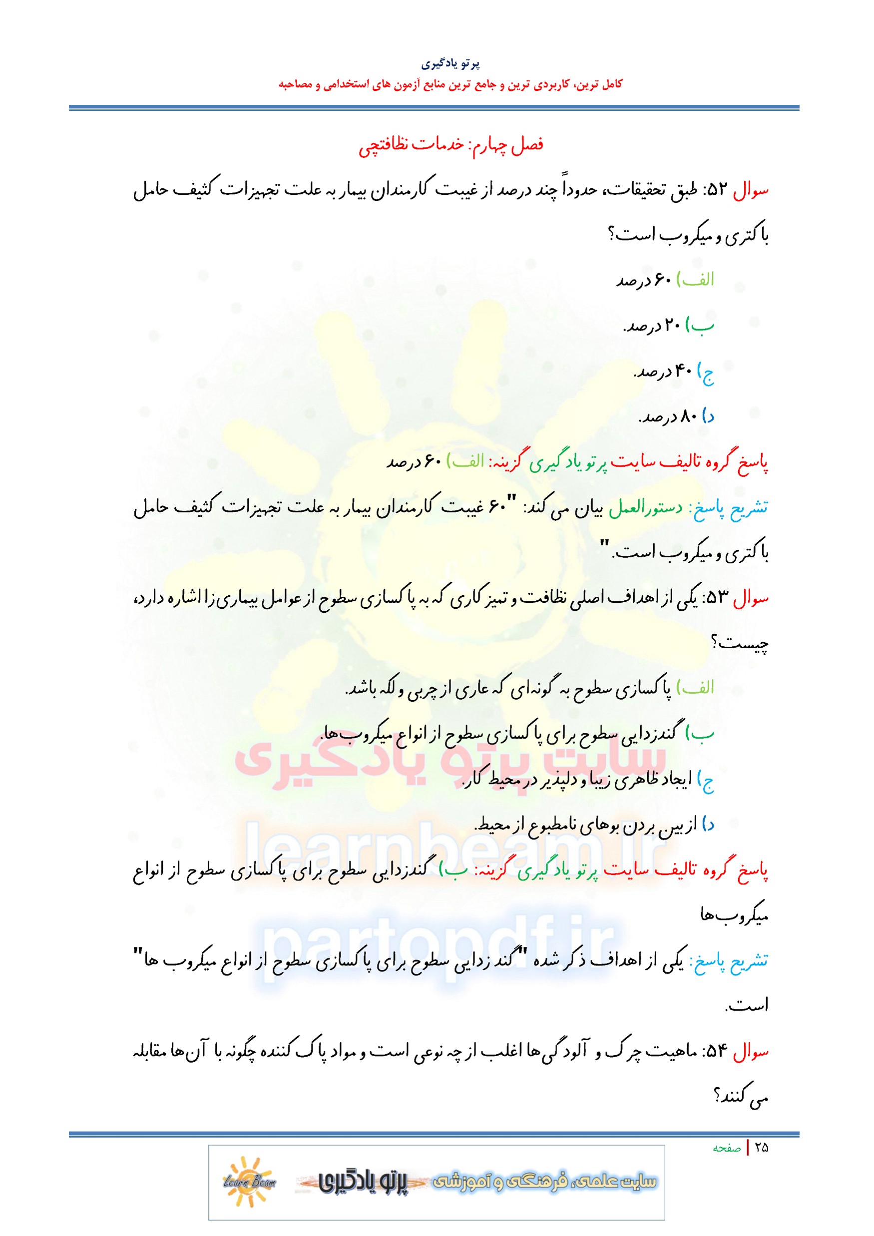 مجموعه سوالات و تست اصول پذیرایی مهمانداری و نظافت اداری با پاسخ تشریحی