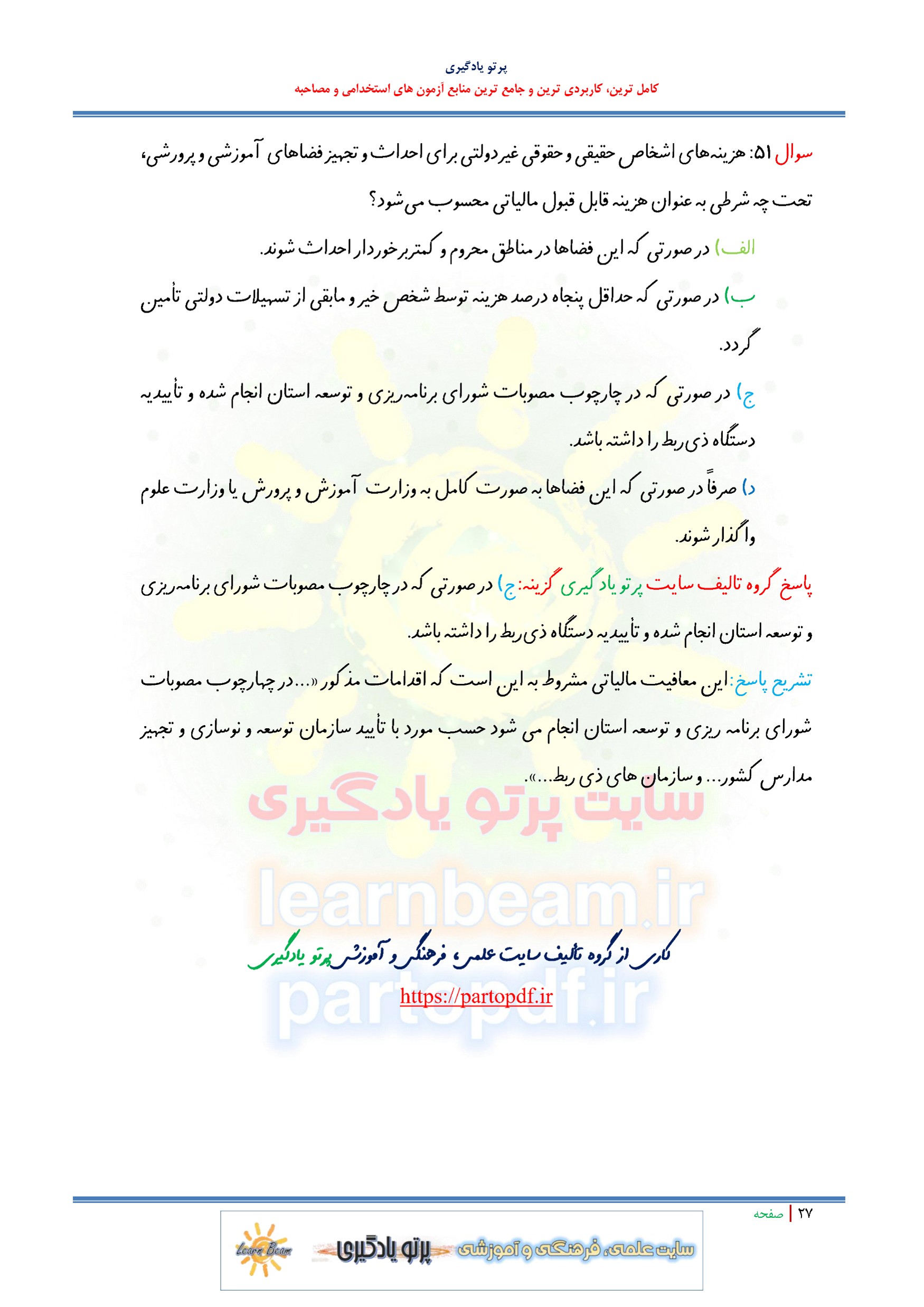 سوالات و تست کتاب فصل 19 قانون برنامه پنج ساله هفتم توسعه کشور شامل 51 سوال تستی در 27 صفحه و پاسخ تشریحی در قالب فایل pdf مطابق با سرفصل های دفترچه آزمون های استخدامی. مجموعه تست قانون برنامه پنج ساله هفتم توسعه کشور فصل نوزدهم بهترین منبع برای آمادگی آزمون های استخدامی می باشد. مجموعه سوالات و تست فصل 19 قانون برنامه پنج ساله هفتم توسعه کشور مطالب خوانده شده داوطلبین آزمون استخدامی را نظم بخشیده و منسجم می سازد. مجموعه سوالات تستی فصل 19 قانون برنامه پنج ساله هفتم توسعه کشور ویژه استخدامی وزارت آموزش و پرورش مرور سریع داوطلب را سبب می شود و آگاهی های وی را نظم بخشیده و یک آمادگی و شبیه سازی را برای جلسه آزمون به همراه دارد. مطالعه این منبع داوطلبین آزمون های استخدامی پیشنهاد می شود.