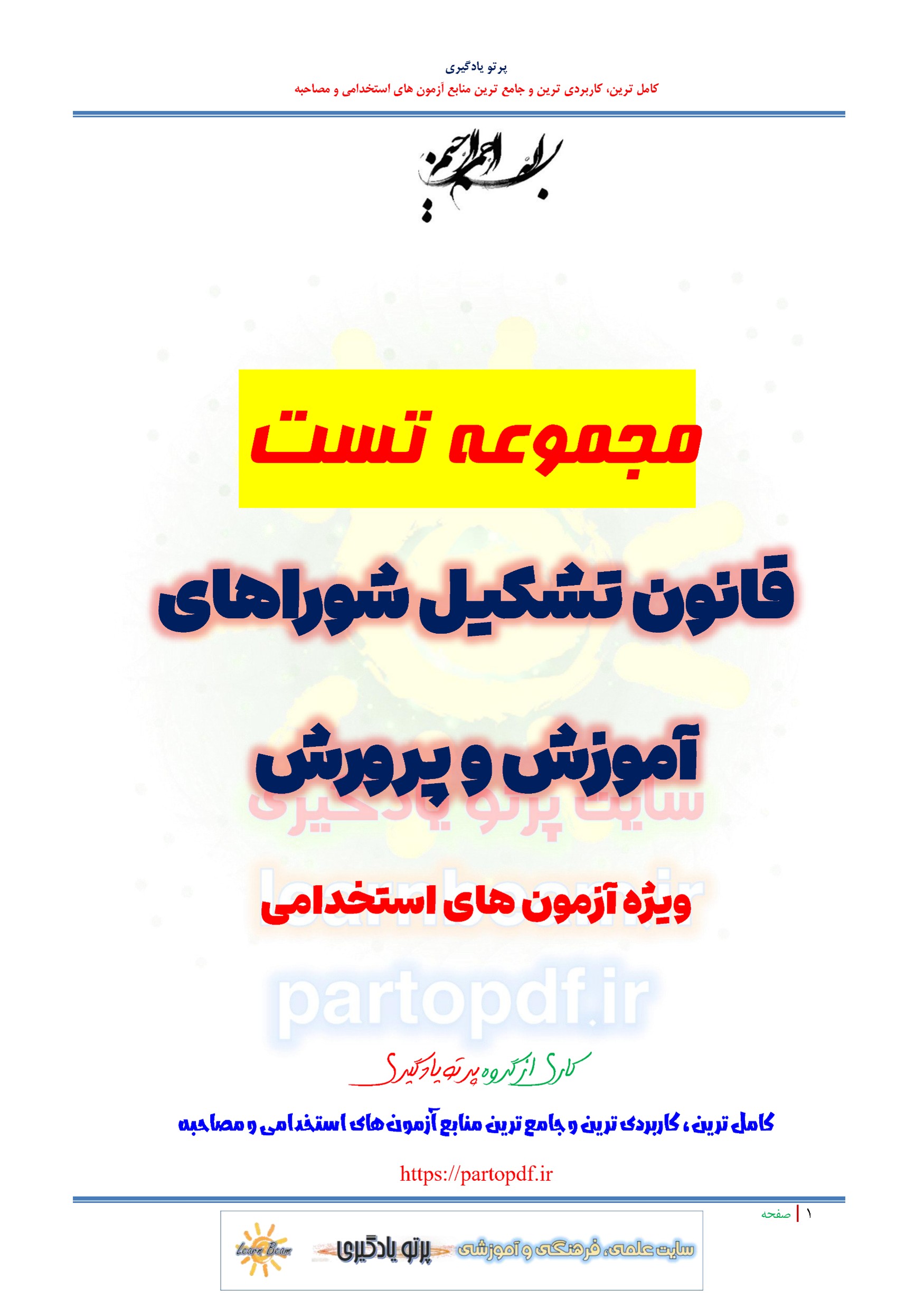 سوالات و تست قانون تشکیل شوراهای آموزش و پرورش شامل 80 تست در 49 صفحه با پاسخ تشریحی در قالب فایل pdf. بهترین منبع برای آزمون های استخدامی می باشد. جزوه سوالات تستی قانون تشکیل شوراهای آموزش و پرورش مطالب خوانده شده داوطلبین آزمون استخدامی را نظم بخشیده و منسجم می سازد. این مجموعه مرور سریع داوطلب را سبب می شود و آگاهی های وی را نظم بخشیده و یک آمادگی و شبیه سازی را برای جلسه آزمون به همراه دارد. مطالعه این منبع برای همه داوطلبین شرکت کننده در آزمون استخدامی وزارت آموزش و پرورش پیشنهاد می شود.