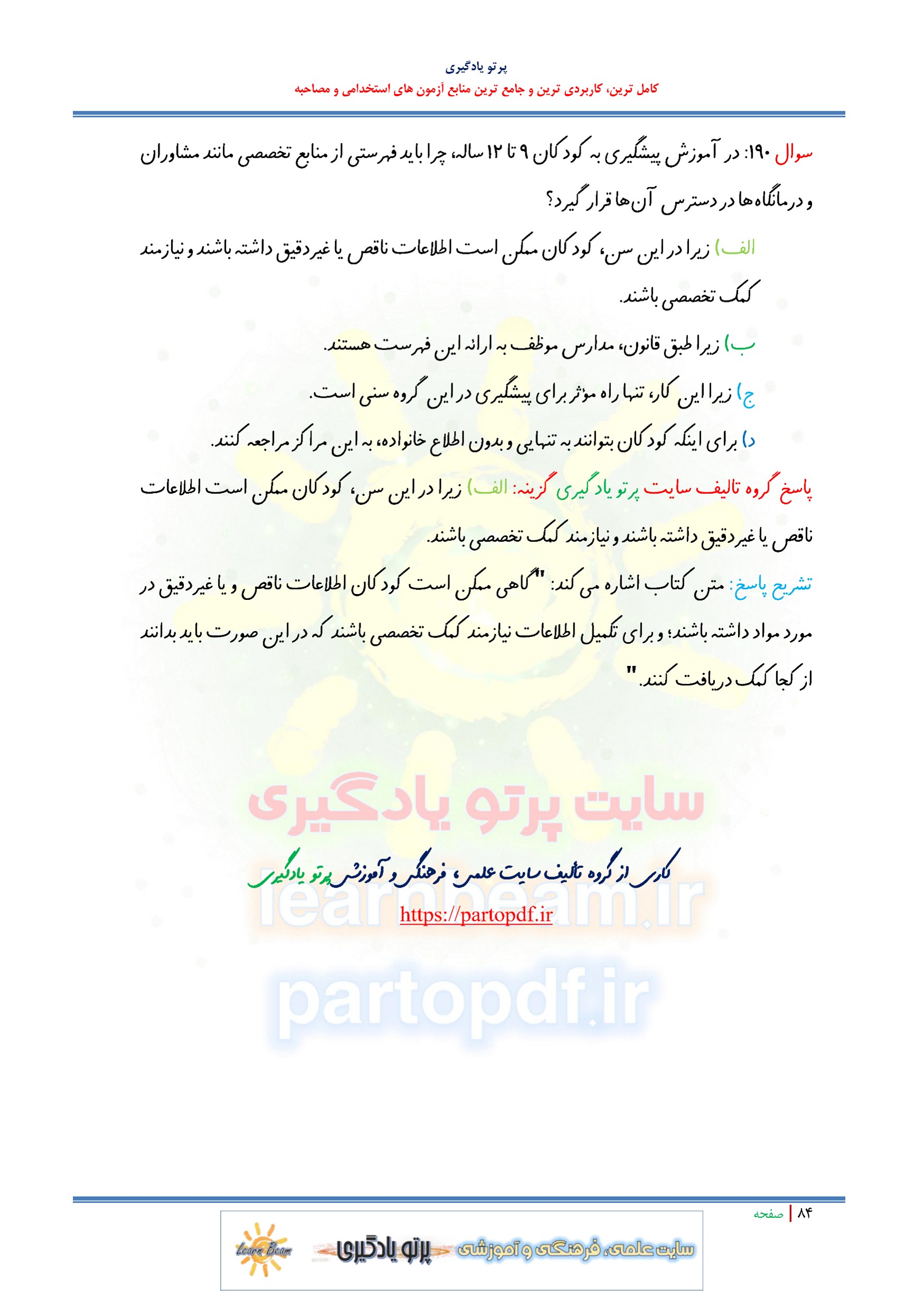 سوالات و تست کتاب پیشگیری اولیه از اعتیاد و رفتارهای پرخطر دوره ابتدایی شامل 190 تست در 84 صفحه با پاسخ تشریحی در قالب فایل pdf. بهترین منبع برای آزمون های استخدامی می باشد. جزوه سوالات تستی کتاب پیشگیری اولیه از اعتیاد و رفتارهای پرخطر مطالب خوانده شده داوطلبین آزمون استخدامی را نظم بخشیده و منسجم می سازد. این مجموعه مرور سریع داوطلب را سبب می شود و آگاهی های وی را نظم بخشیده و یک آمادگی و شبیه سازی را برای جلسه آزمون به همراه دارد. مطالعه این منبع برای همه داوطلبین شرکت کننده در آزمون استخدامی وزارت آموزش و پرورش پیشنهاد می شود.