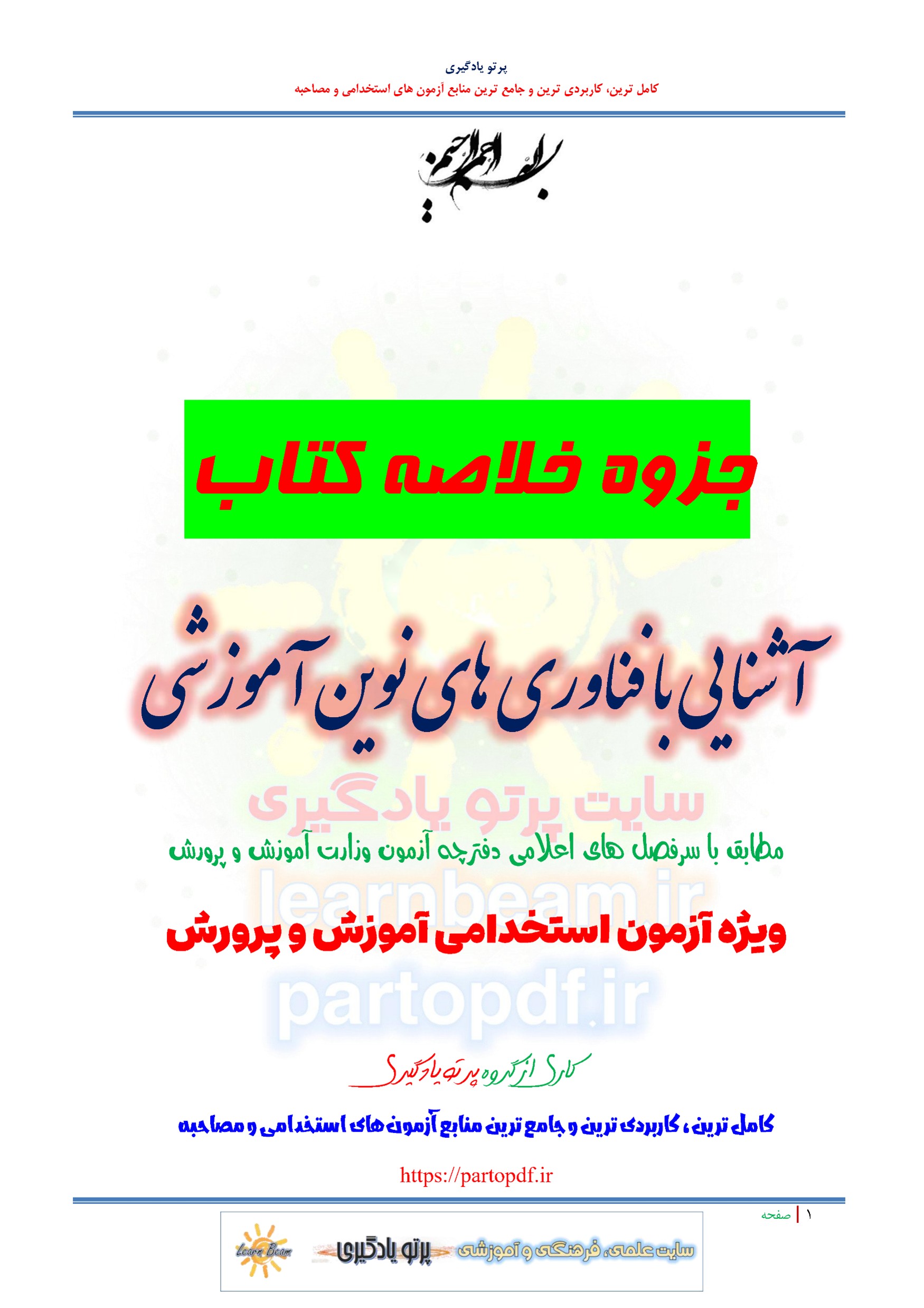 خلاصه کتاب آشنایی با فناوری های نوین آموزشی در 77 صفحه در قالب pdf. مجموعه ای کامل برای مطالعه و موفقیت در آزمون های استخدامی آموزش و پرورش و سایر آزمون های استخدامی است. این مجموعه ارزشمند در قالب فایل پی دی اف می تواند مناسب ترین انتخاب برای انسجام ذهنی و آمادگی برای آزمون شما عزیزان باشد. مجموعه خلاصه و نکات کلیدی کتاب آشنایی با فناوری های نوین آموزشی برای تجمیع، جمع بندی و مرور سریع متناسب با سرفصل های اعلامی آزمون استخدامی آموزش و پرورش طراحی و تدوین شده است.