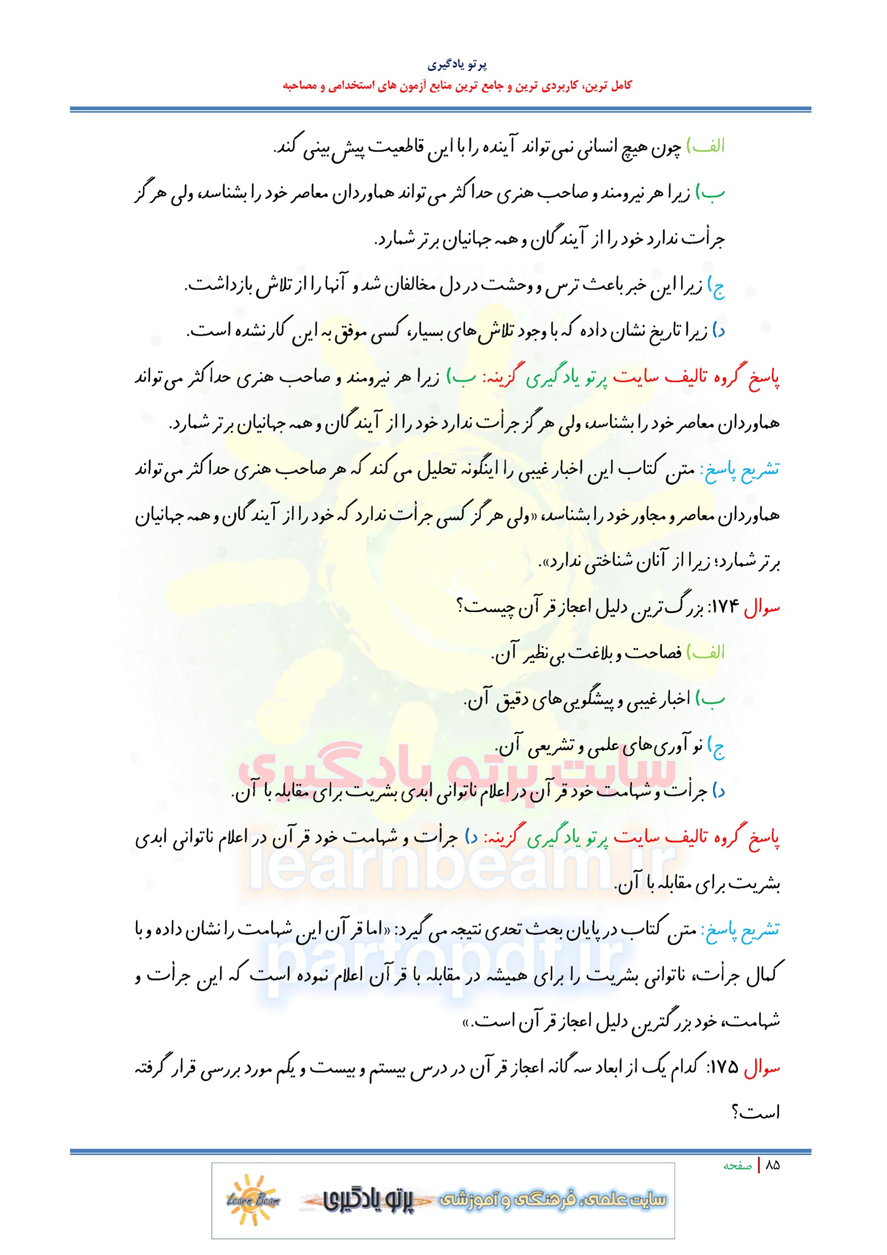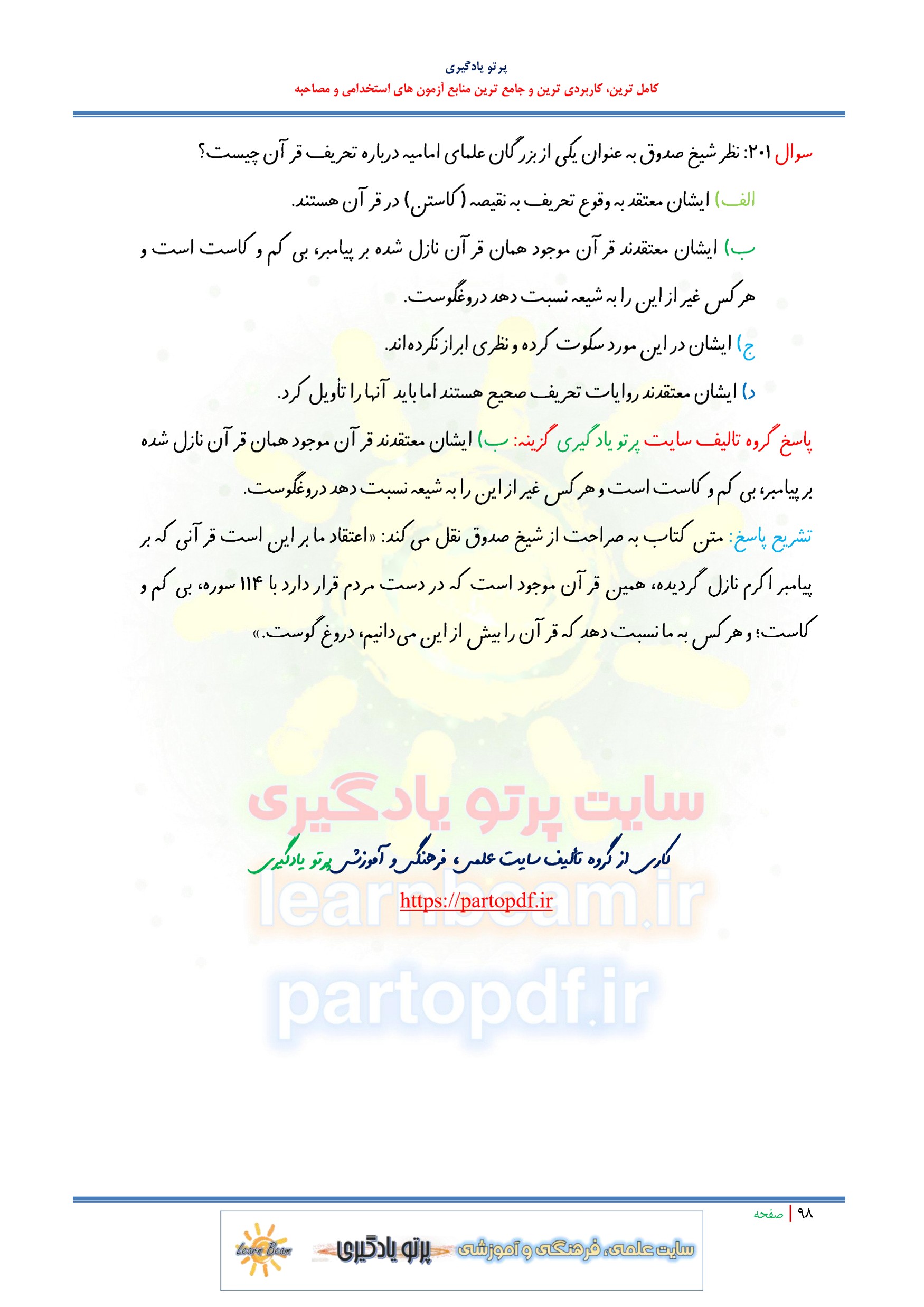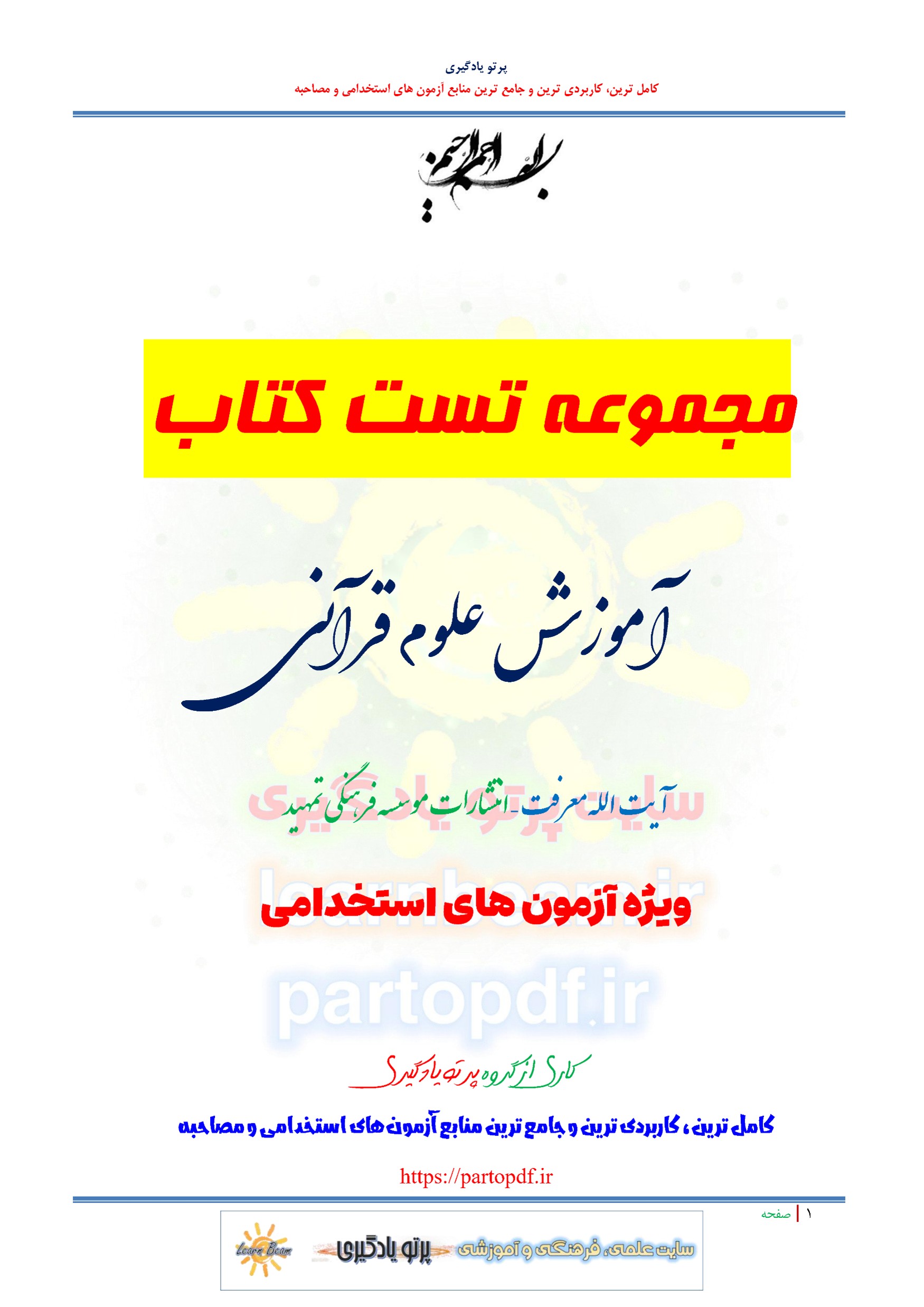سوالات و تست کتاب آموزش علوم قرآنی تالیف آیت الله معرفت انتشارات موسسه فرهنگی تمهید شامل 201 سوال تستی در 98 صفحه و پاسخ تشریحی در قالب فایل pdf مطابق با سرفصل های دفترچه آزمون های استخدامی. مجموعه تست کتاب آموزش علوم قرآنی بهترین منبع برای آمادگی آزمون های استخدامی می باشد. مجموعه سوالات و تست کتاب آموزش علوم قرآنی آیت الله معرفت مطالب خوانده شده داوطلبین آزمون استخدامی را نظم بخشیده و منسجم می سازد. مجموعه سوالات تستی کتاب آیت الله معرفت انتشارات موسسه فرهنگی تمهید ویژه آزمونهای استخدامی و استخدامی وزارت آموزش و پرورش مرور سریع داوطلب را سبب می شود و آگاهی های وی را نظم بخشیده و یک آمادگی و شبیه سازی را برای جلسه آزمون به همراه دارد. مطالعه این منبع داوطلبین آزمون های استخدامی پیشنهاد می شود.