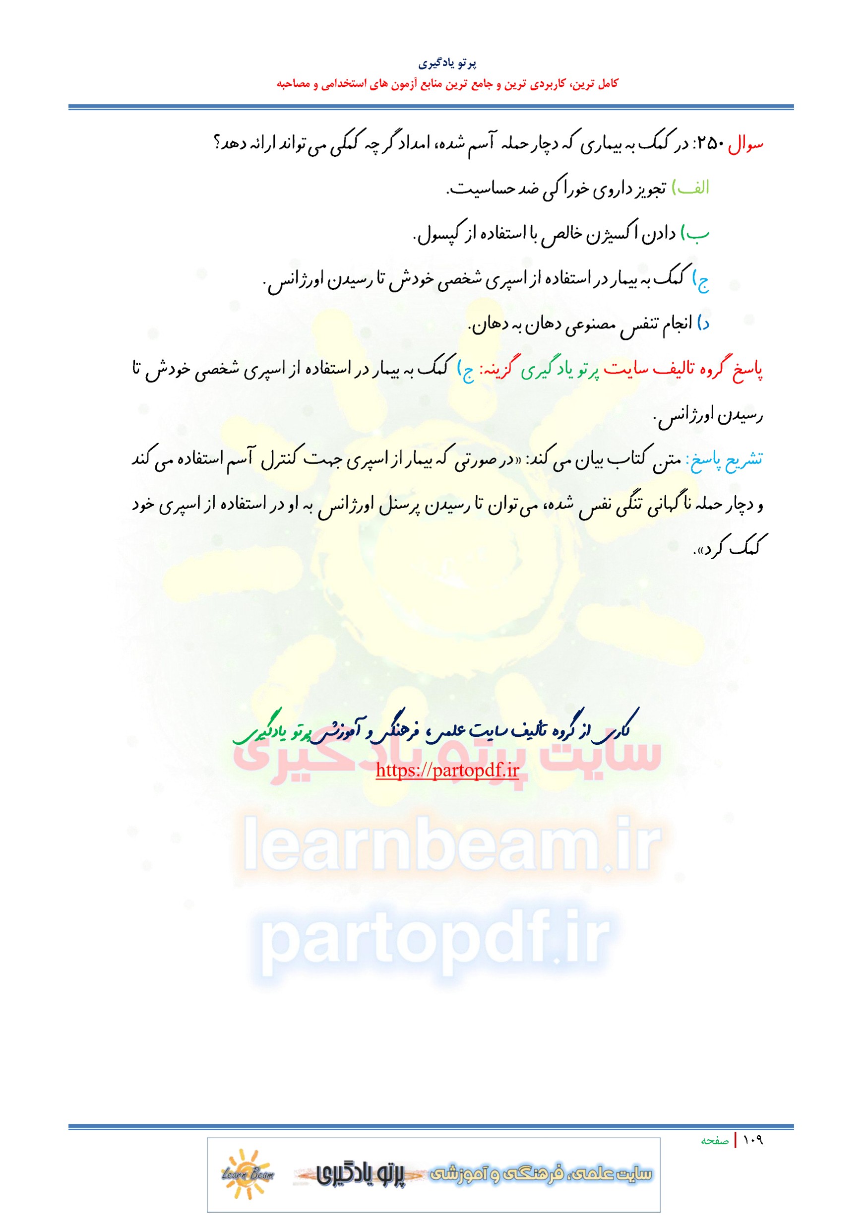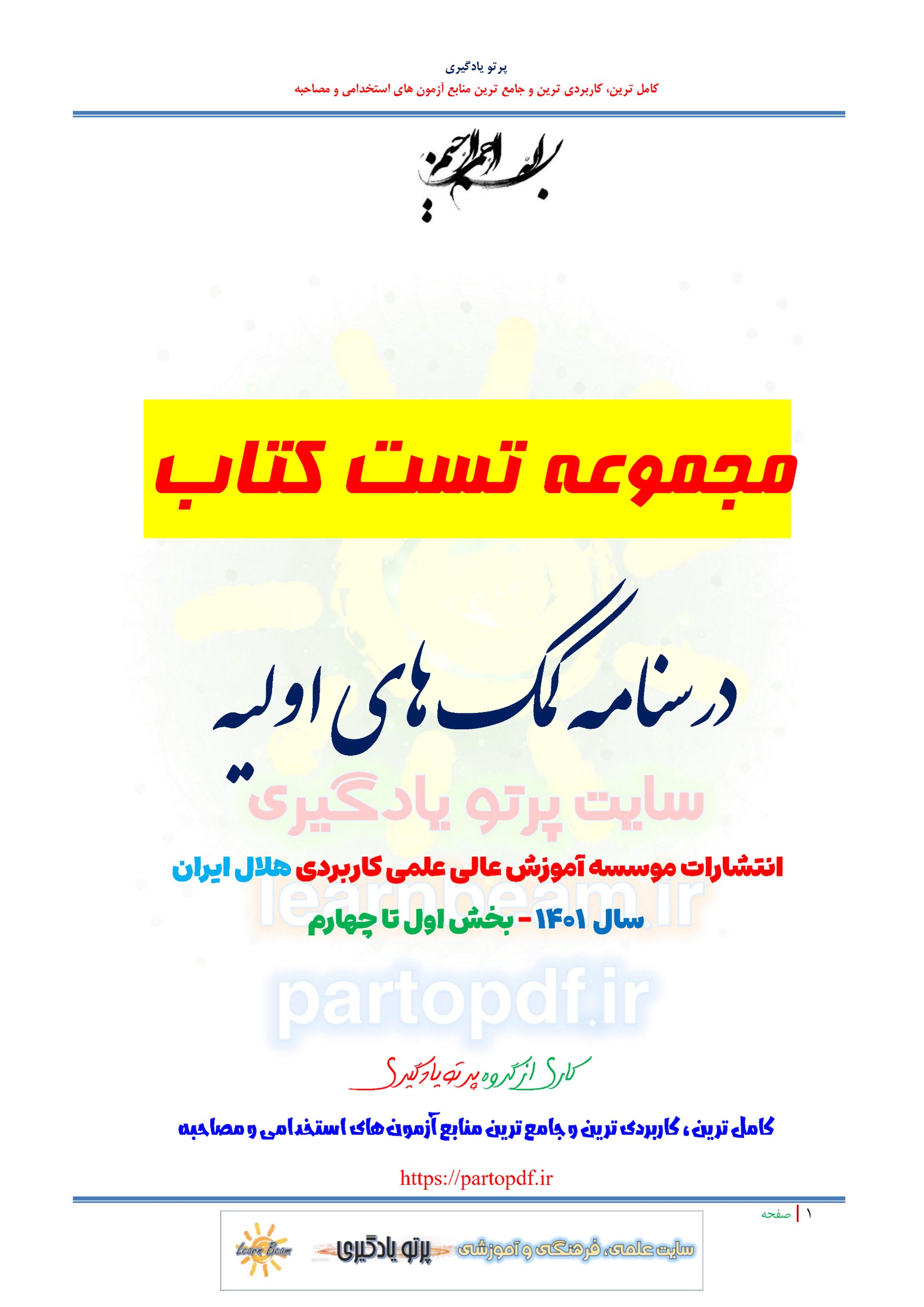 سوالات و تست کتاب درسنامه کمک های اولیه انتشارات موسسه آموزش عالی علمی کاربردی هلال ایران شامل 250 تست در 109 صفحه با پاسخ تشریحی در قالب فایل pdf. بهترین منبع برای آزمون های استخدامی می باشد. جزوه سوالات تستی کتاب درسنامه کمک های اولیه مطالب خوانده شده داوطلبین آزمون استخدامی را نظم بخشیده و منسجم می سازد. این مجموعه مرور سریع داوطلب را سبب می شود و آگاهی های وی را نظم بخشیده و یک آمادگی و شبیه سازی را برای جلسه آزمون به همراه دارد. مطالعه این منبع برای همه داوطلبین شرکت کننده در آزمون استخدامی وزارت آموزش و پرورش پیشنهاد می شود.
