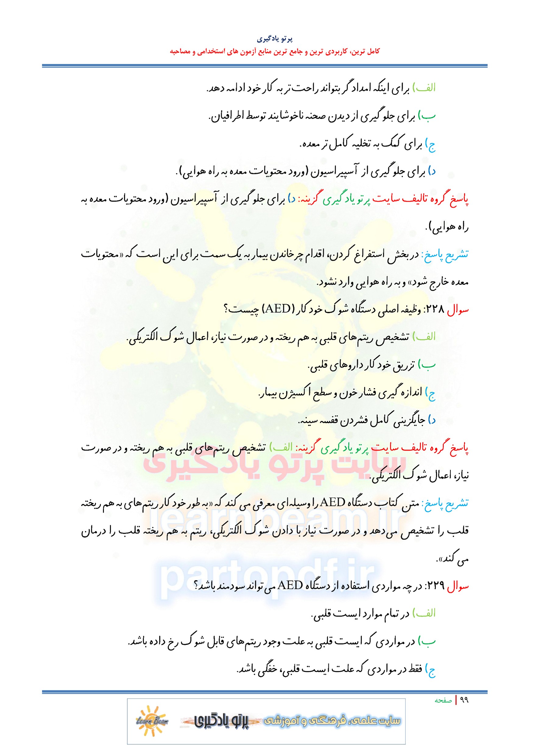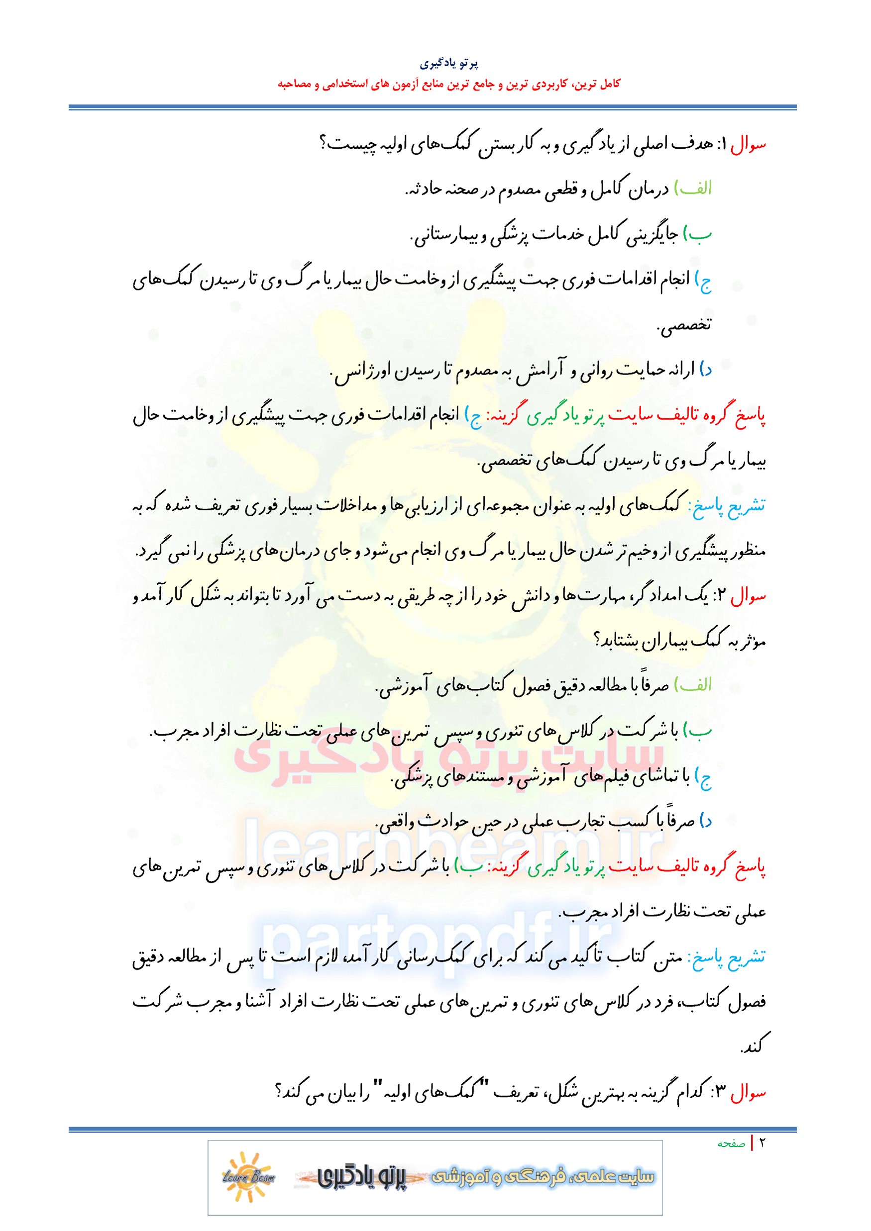 مجموعه سوالات و تست کتاب درسنامه کمک های اولیه با پاسخ تشریحی