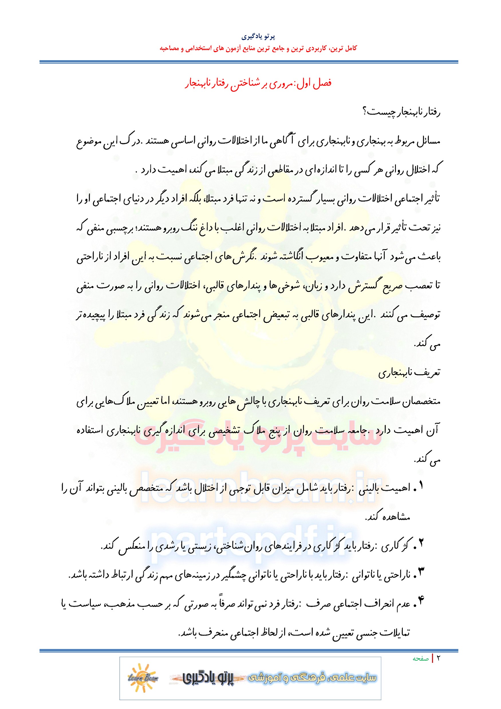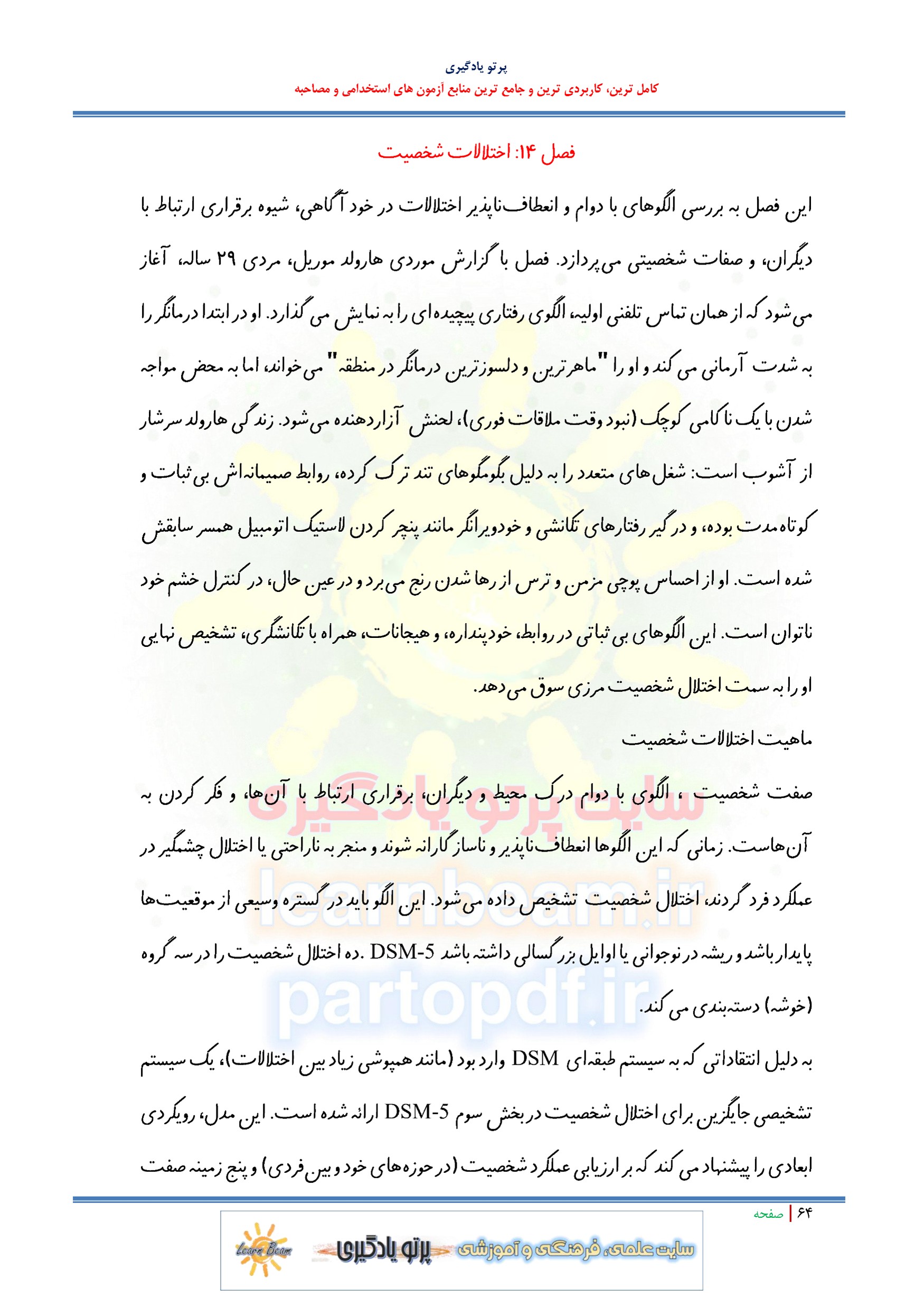 خلاصه کتاب آسیب شناسی روانی هالیجین و ویتبورن ترجمه یحیی سیدمحمدی جلد 1 و 2 در 71 صفحه در قالب فایل pdf. جزوه خلاصه کتاب آسیب شناسی روانی /خلاصه کتاب آسیب شناسی روانی هالیجین و ویتبورن / نکات طلایی کتاب آسیب شناسی روانی ترجمه یحیی سیدمحمدی جلد 1 و 2 / چکیده کتاب آسیب شناسی روانی هالیجین و ویتبورن ترجمه یحیی سیدمحمدی جلد 1 و 2 مجموعه ای کامل برای مطالعه و موفقیت در آزمون های استخدامی آموزش و پرورش و سایر آزمون های استخدامی است. جزوه خلاصه و چکیده از نکات کلیدی و طلایی آسیب شناسی روانی در قالب فایل پی دی اف می تواند مناسب ترین انتخاب برای داوطلبین عزیز در جهت تحکیم اطلاعات ذهنی و جمع بندی مطالب باشد. جزوه خلاصه کتاب آسیب شناسی روانی ترجمه یحیی سیدمحمدی جلد 1 و 2 انسجام ذهنی و آمادگی ذهنی فراگیران برای آزمون استخدامی آموزش و پرورش را در پی دارد. این منبع متناسب با سرفصل های اعلامی دفترچه آزمون استخدامی تدوین و تالیف گردیده است.