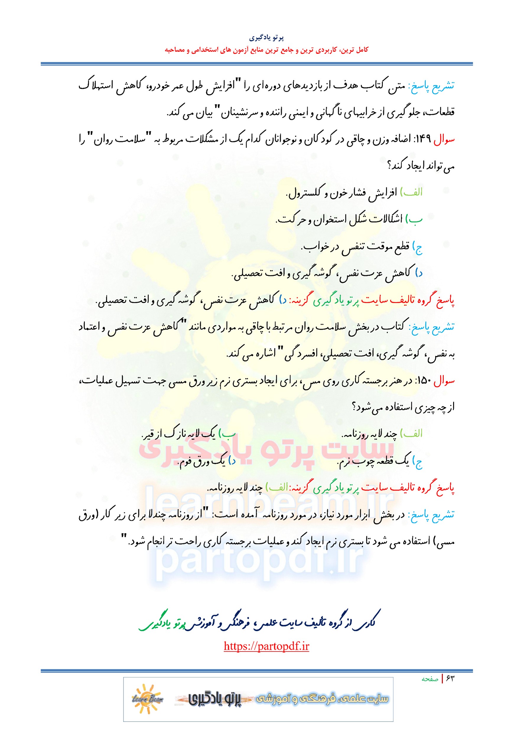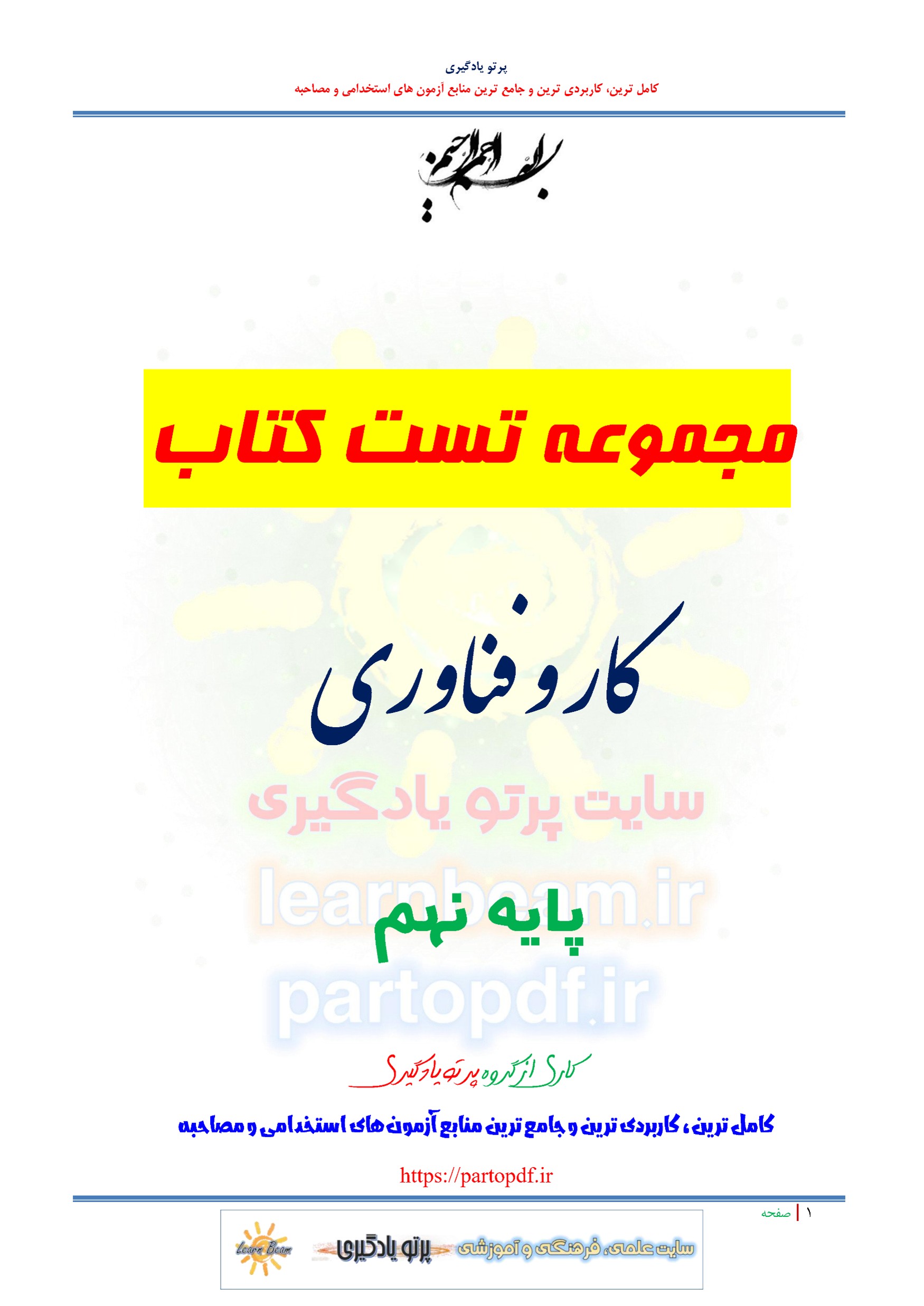 سوالات و تست کتاب کار و فناوری پایه نهم شامل 150 تست در 63 صفحه با پاسخ تشریحی در قالب فایل pdf. بهترین منبع برای آزمون های استخدامی می باشد. جزوه سوالات تستی کتاب کار و فناوری پایه نهم مطالب خوانده شده داوطلبین آزمون استخدامی را نظم بخشیده و منسجم می سازد. این مجموعه مرور سریع داوطلب را سبب می شود و آگاهی های وی را نظم بخشیده و یک آمادگی و شبیه سازی را برای جلسه آزمون به همراه دارد. مطالعه این منبع برای همه داوطلبین شرکت کننده در آزمون استخدامی وزارت آموزش و پرورش پیشنهاد می شود.