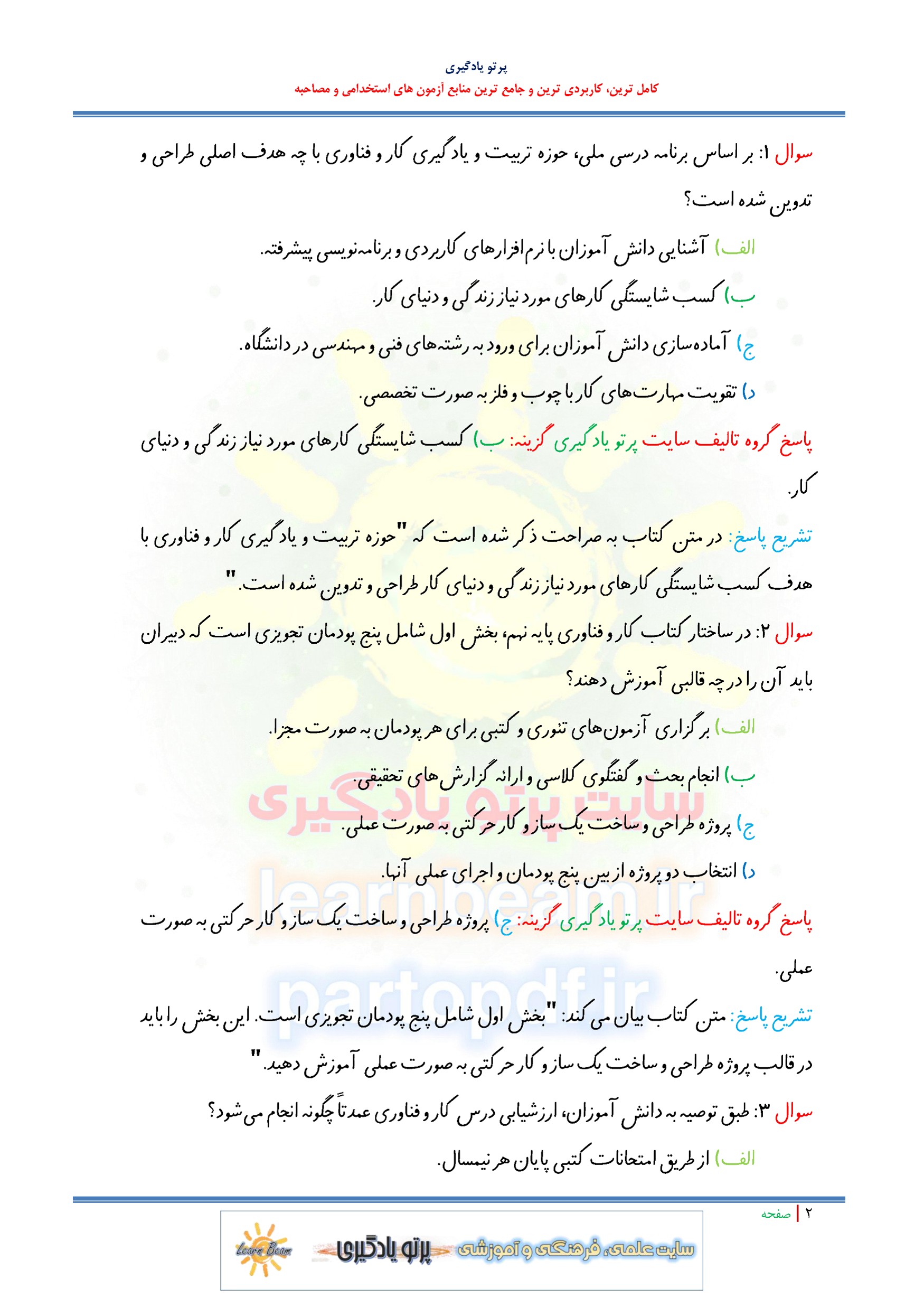 سوالات تستی کتاب کار و فناوری پایه نهم