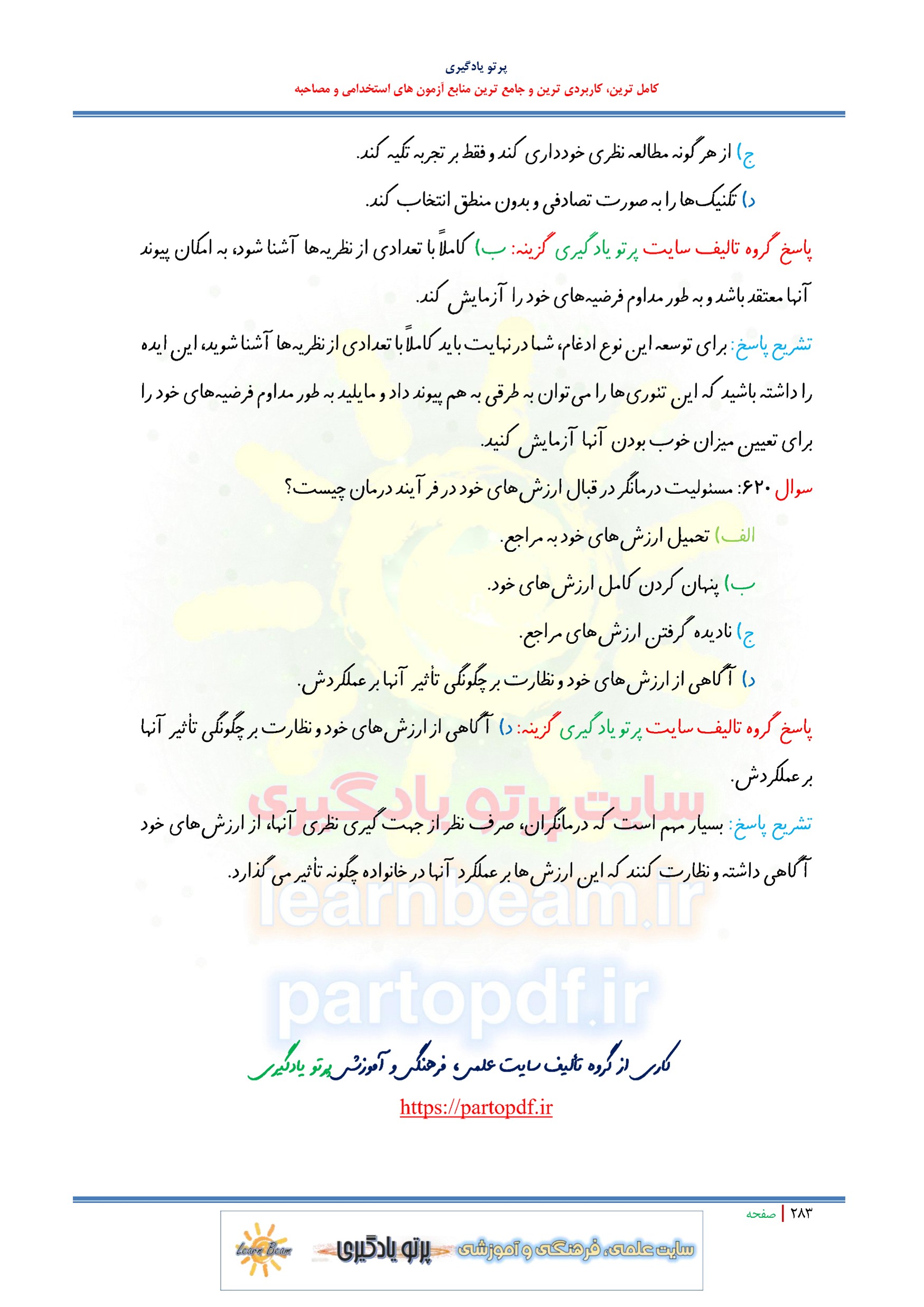 سوالات و تست کتاب نظریه های مشاوره و رواندرمانی شامل 620 تست در 281 صفحه با پاسخ تشریحی در قالب فایل pdf. بهترین منبع برای آزمون های استخدامی می باشد. جزوه سوالات تستی کتاب نظریه های مشاوره و روان درمانی مطالب خوانده شده داوطلبین آزمون استخدامی را نظم بخشیده و منسجم می سازد. این مجموعه مرور سریع داوطلب را سبب می شود و آگاهی های وی را نظم بخشیده و یک آمادگی و شبیه سازی را برای جلسه آزمون به همراه دارد. مطالعه این منبع برای همه داوطلبین شرکت کننده در آزمون استخدامی وزارت آموزش و پرورش پیشنهاد می شود.