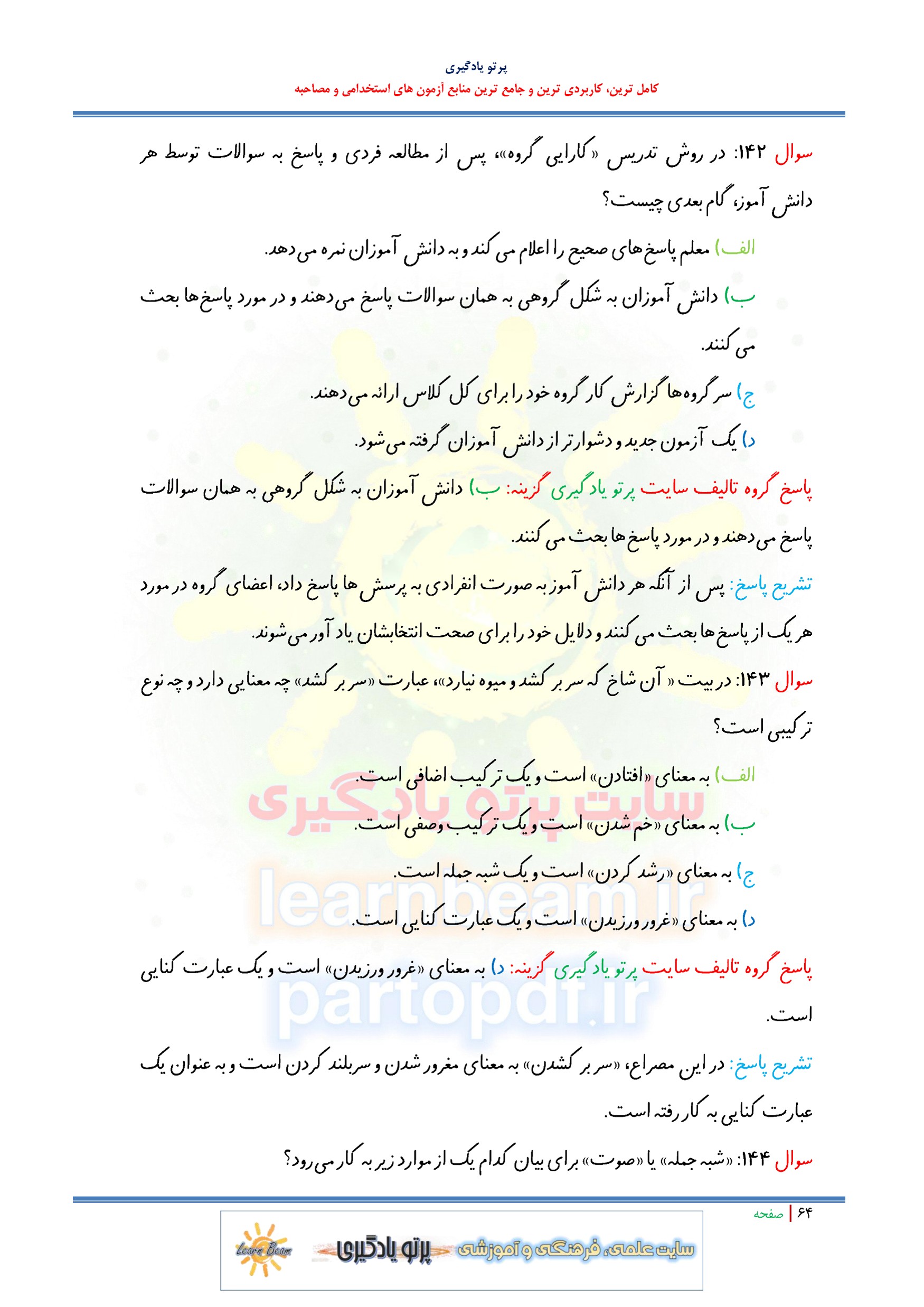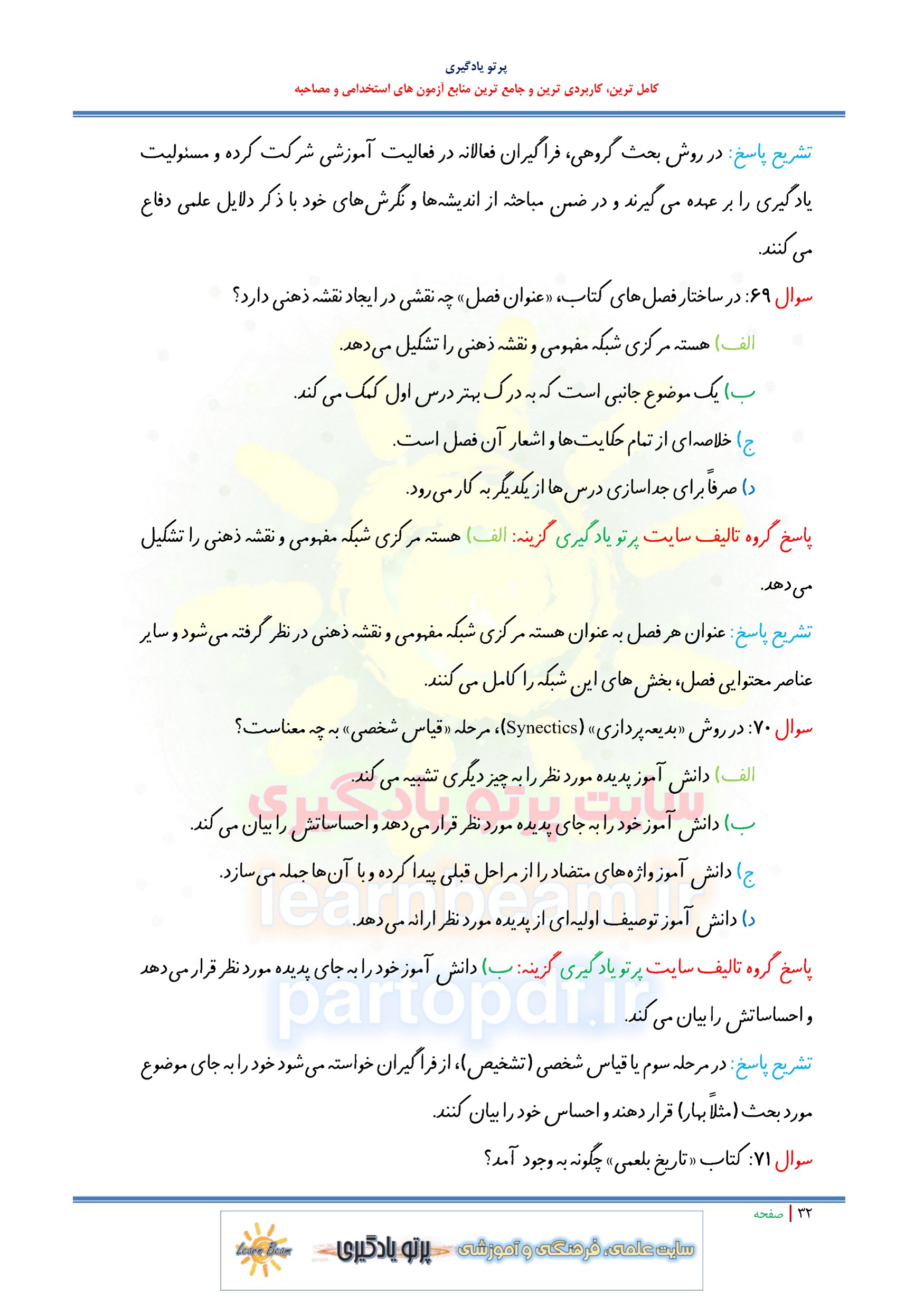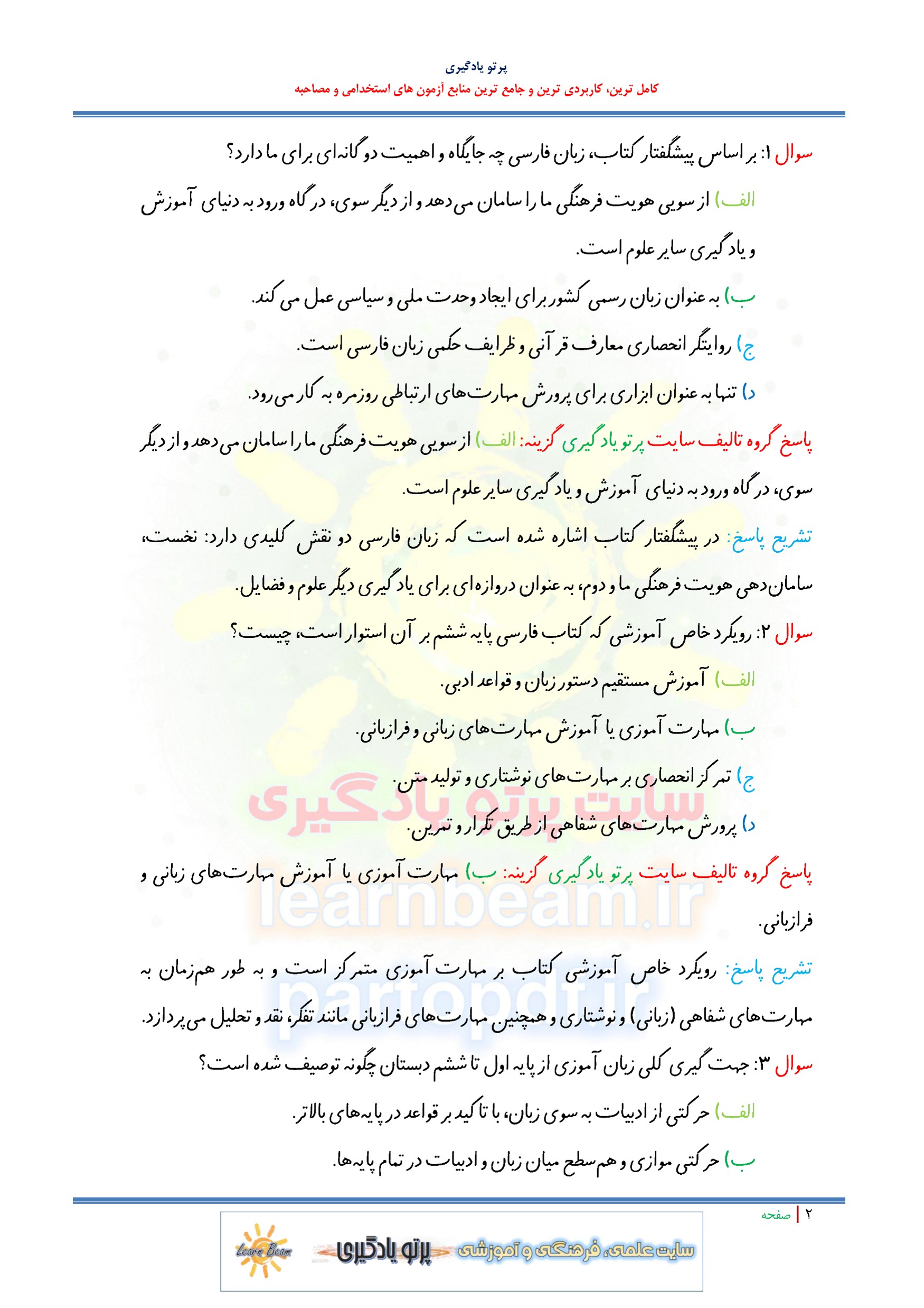 مجموعه سوالات و تست کتاب راهنمای معلم فارسی پایه ششم ابتدایی با پاسخ تشریحی