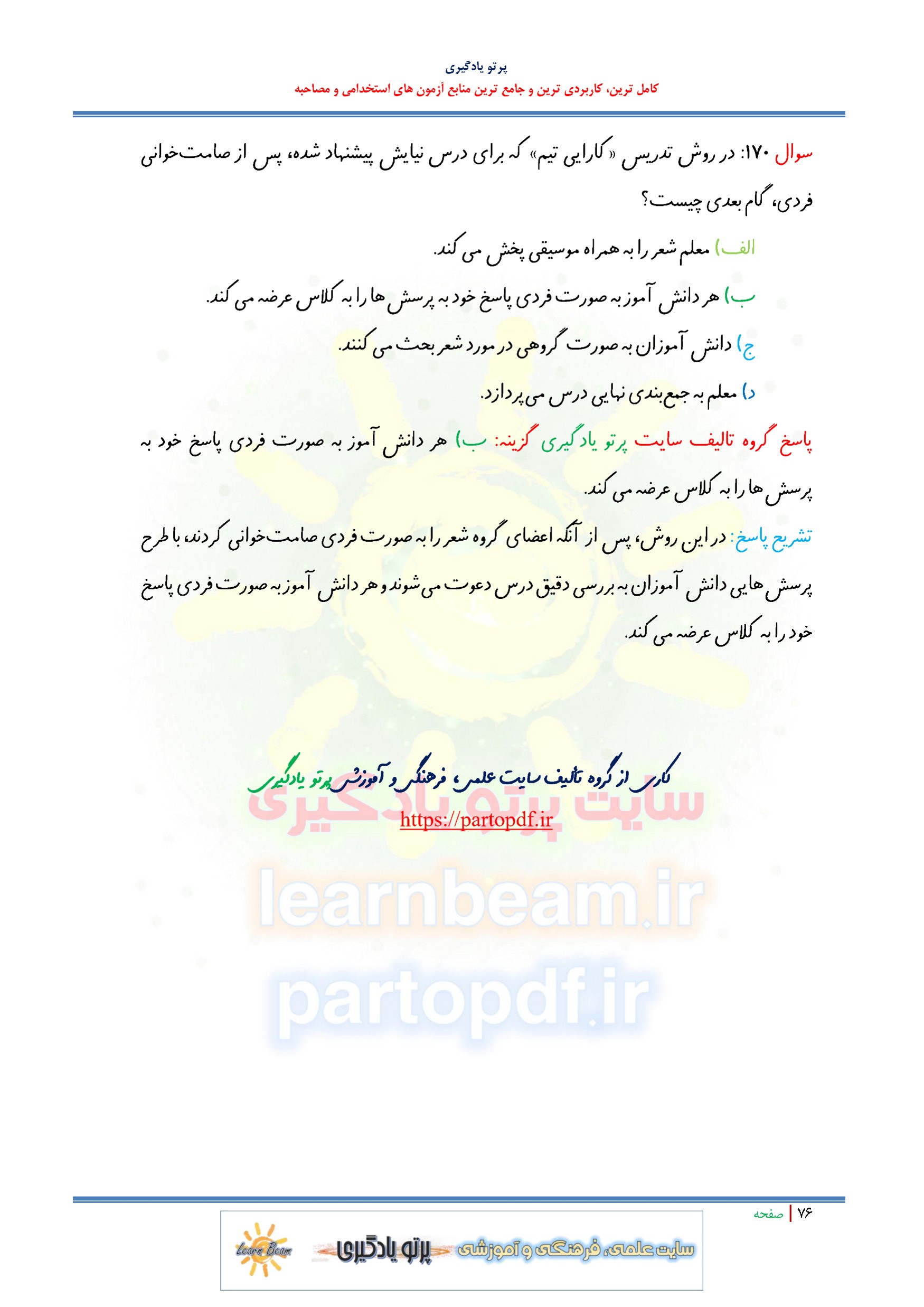 سوالات تستی کتاب راهنمای معلم فارسی پایه ششم ابتدایی