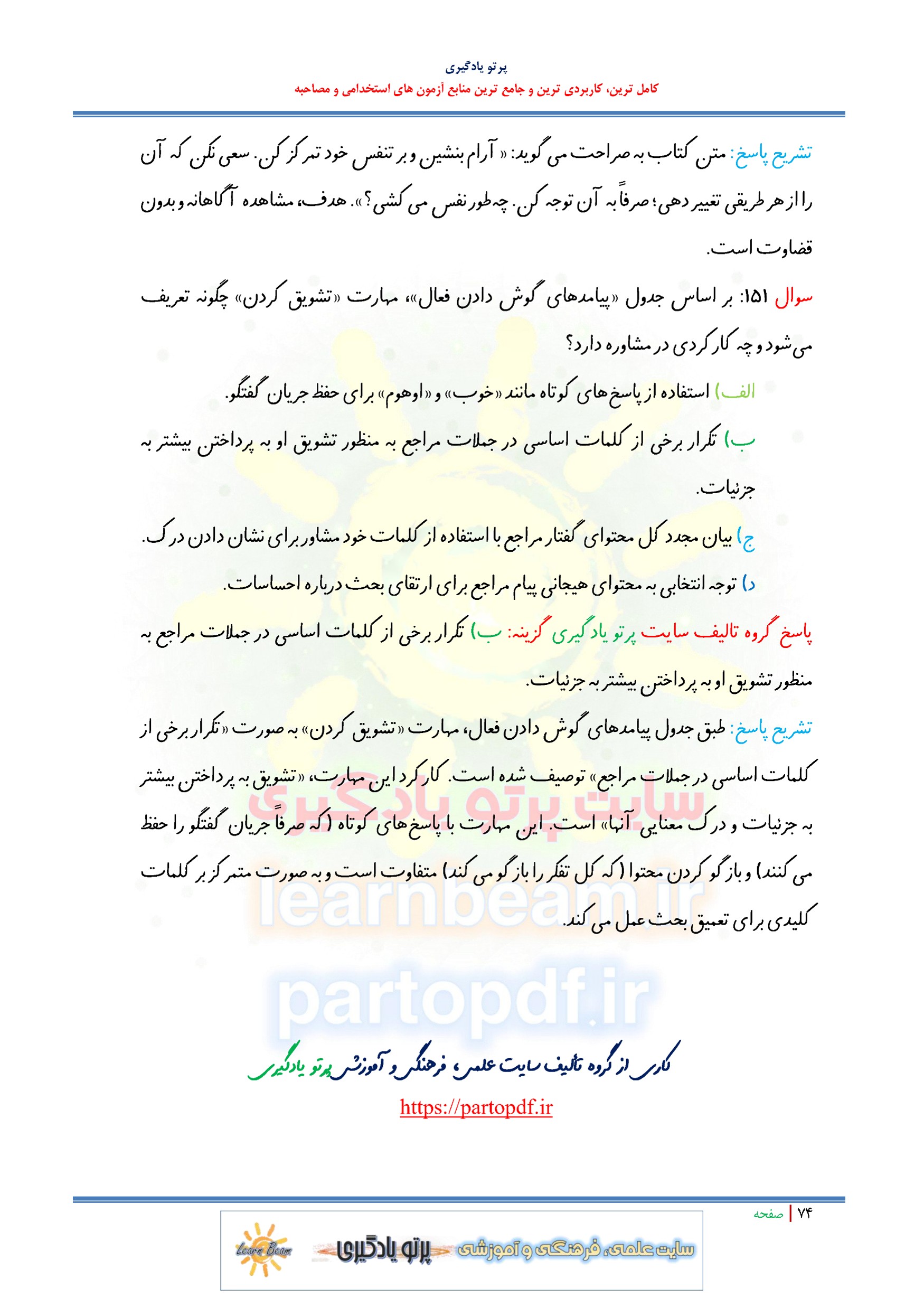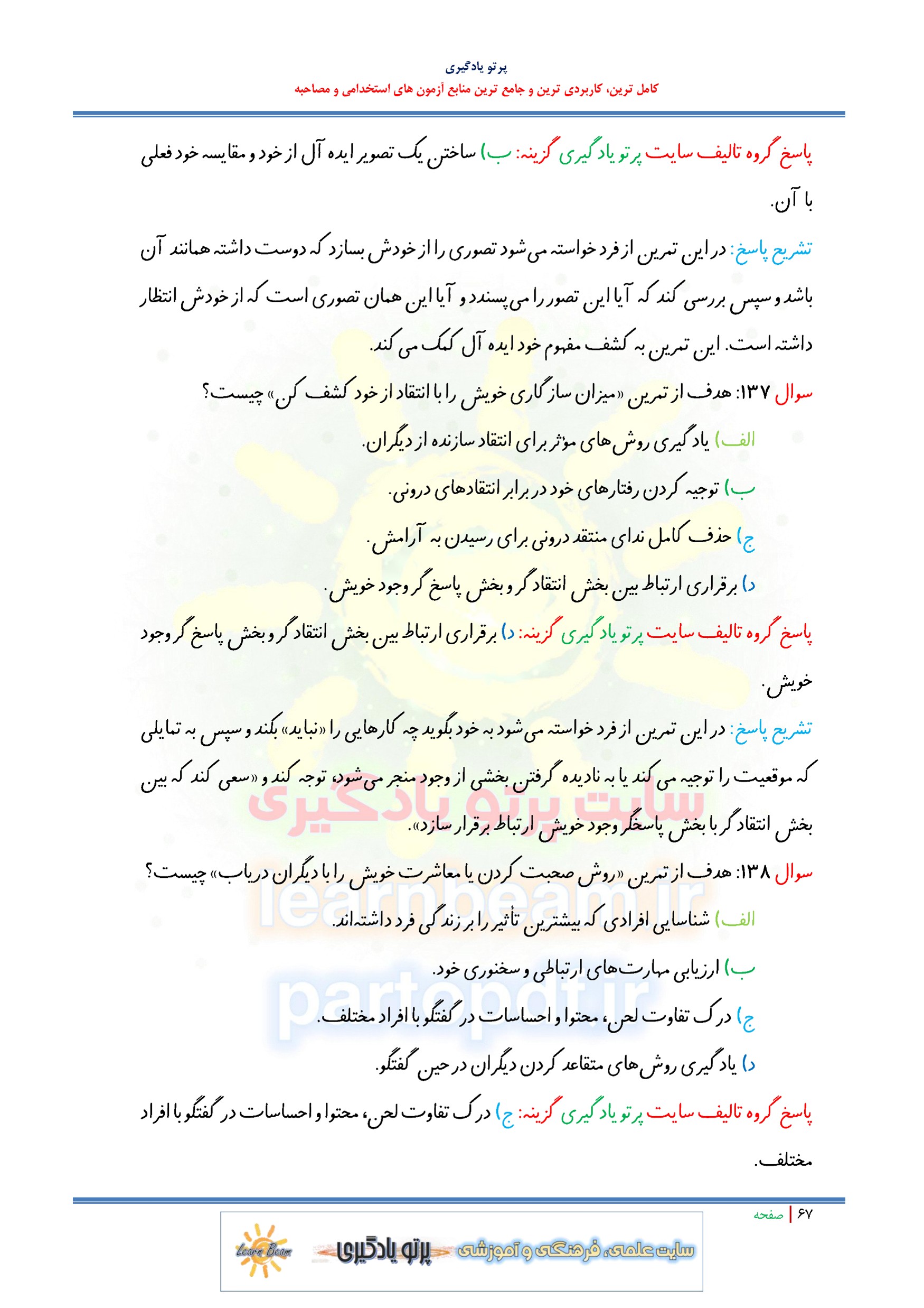 سوالات و تست کتاب مهارت های پایه و پیشرفته در مشاوره و روان درمانی کارورزی و تمرین عملی دکتر سیمین حسینیان و دکتر آناهیتا خدابخشی شامل 151 تست در 74 صفحه با پاسخ تشریحی در قالب فایل pdf. بهترین منبع برای آزمون های استخدامی می باشد. جزوه سوالات تستی کتاب مهارت های پایه و پیشرفته در مشاوره و روان درمانی مطالب خوانده شده داوطلبین آزمون استخدامی را نظم بخشیده و منسجم می سازد. این مجموعه مرور سریع داوطلب را سبب می شود و آگاهی های وی را نظم بخشیده و یک آمادگی و شبیه سازی را برای جلسه آزمون به همراه دارد. مطالعه این منبع برای همه داوطلبین شرکت کننده در آزمون استخدامی وزارت آموزش و پرورش پیشنهاد می شود.