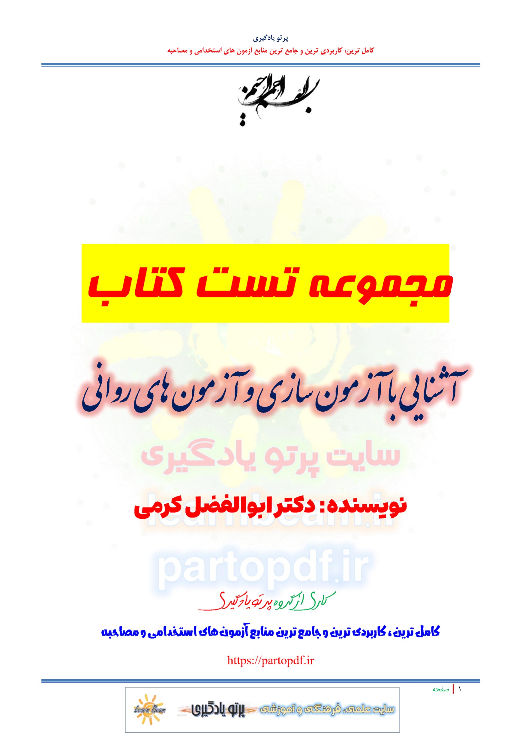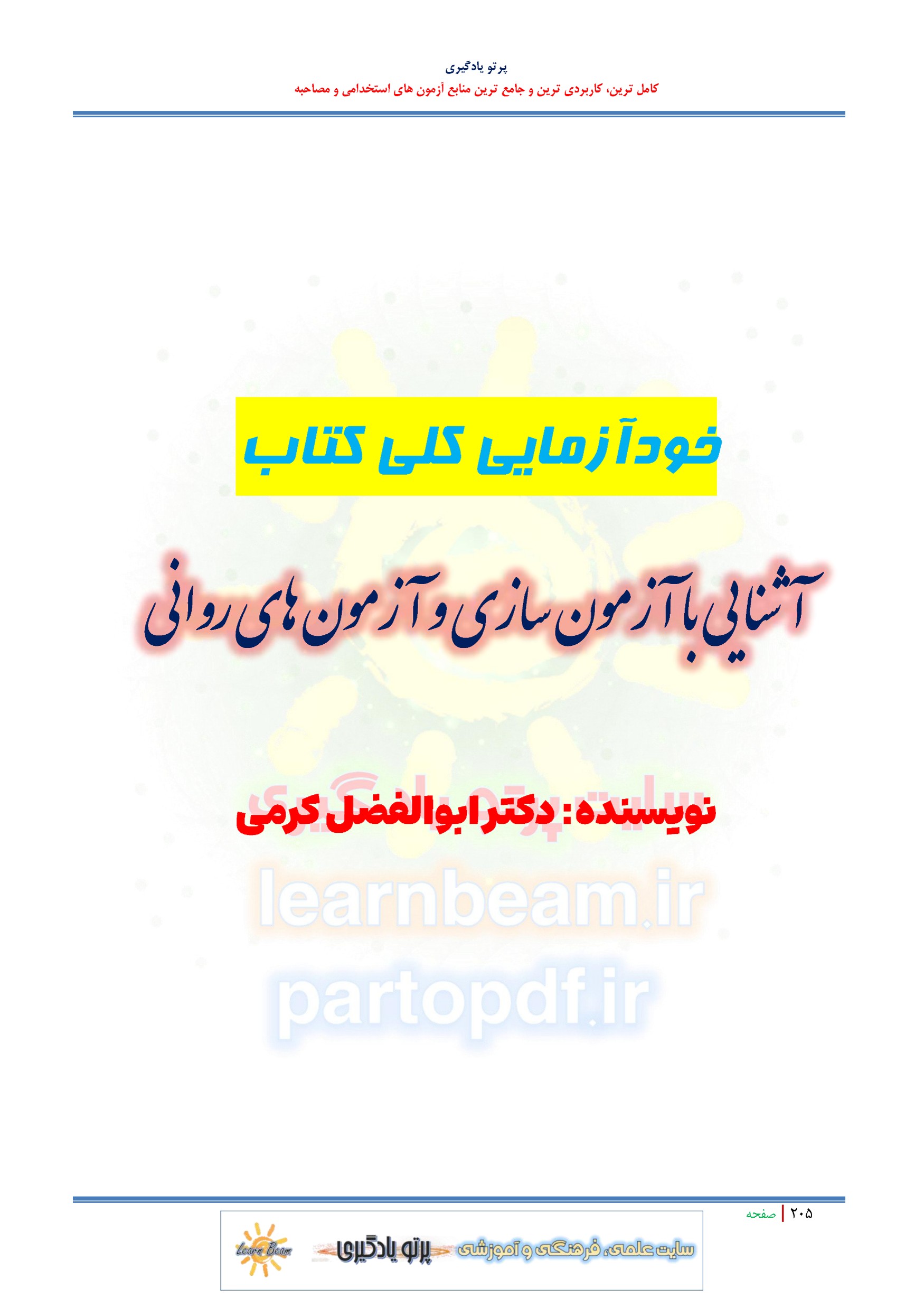 سوالات و تست کتاب آشنایی با آزمون سازی و آزمون های روانی دکتر ابوالفضل کرمی شامل 250 سوال تستی تالیفی و 210 تست خودآزمایی های فصول با پاسخ تشریحی و 480 سوال خود آزمایی کلی با پاسخ مشخص در مجموع در 940 تست در 243 صفحه در قالب فایل pdf مطابق با سرفصل های دفترچه آزمون های استخدامی. مجموعه تست کتاب آشنایی با آزمون سازی و آزمون های روانی دکتر ابوالفضل کرمی بهترین منبع برای آمادگی آزمون های استخدامی می باشد. مجموعه سوالات و تست جلد چهارم کتاب راه رشد آیت الله حائری شیرازی مطالب خوانده شده داوطلبین آزمون استخدامی را نظم بخشیده و منسجم می سازد. مجموعه سوالات تستی کتاب آشنایی با آزمون سازی و آزمون های روانی دکتر ابوالفضل کرمی ویژه آزمون های استخدامی و استخدامی وزارت آموزش و پرورش مرور سریع داوطلب را سبب می شود و آگاهی های وی را نظم بخشیده و یک آمادگی و شبیه سازی را برای جلسه آزمون به همراه دارد. مطالعه این منبع داوطلبین آزمون های استخدامی پیشنهاد می شود.