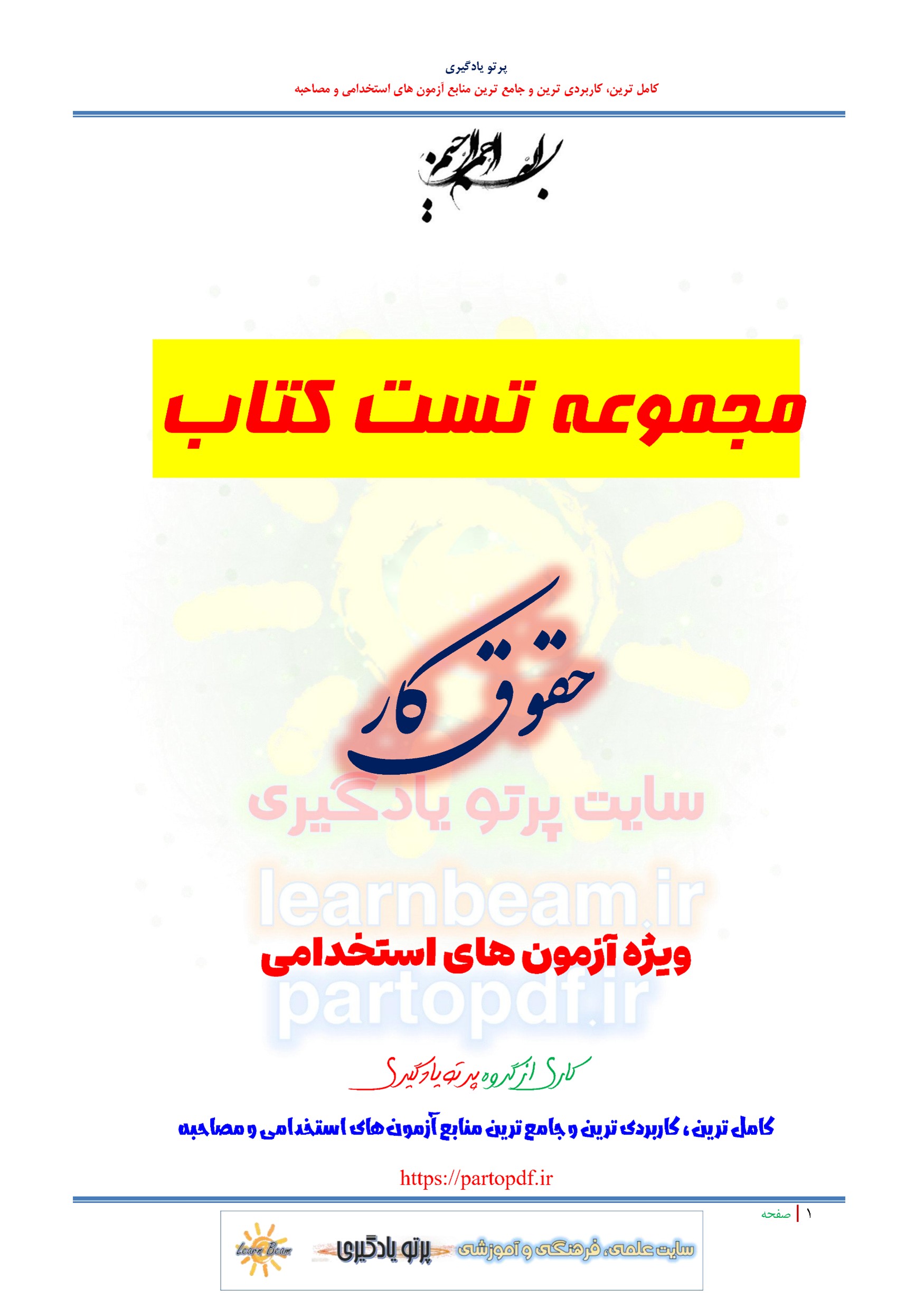 سوالات و تست کتاب حقوق کار سوالات کتاب حقوق کار شامل 265 سوال تستی در 128 صفحه با پاسخ تشریحی در قالب فایل pdf. بهترین منبع برای آزمون های استخدامی می باشد. جزوه سوالات تستی حقوق کار مطالب خوانده شده داوطلبین آزمون استخدامی را نظم بخشیده و منسجم می سازد. این مجموعه مرور سریع داوطلب را سبب می شود و آگاهی های وی را نظم بخشیده و یک آمادگی و شبیه سازی را برای جلسه آزمون به همراه دارد. مطالعه این منبع برای همه داوطلبین شرکت کننده در آزمون های استخدامی پیشنهاد می شود.